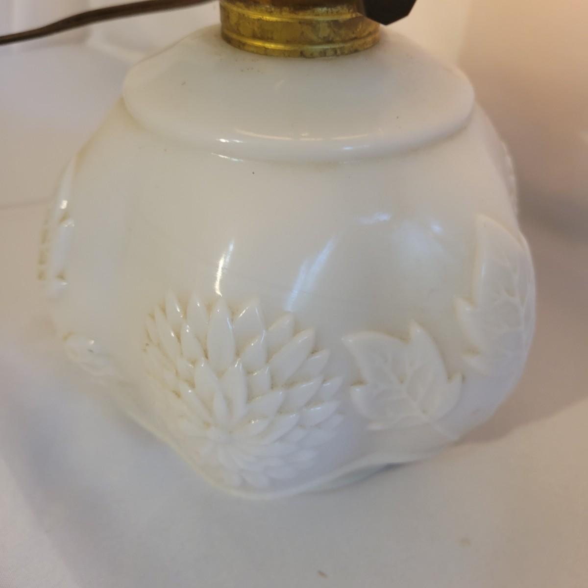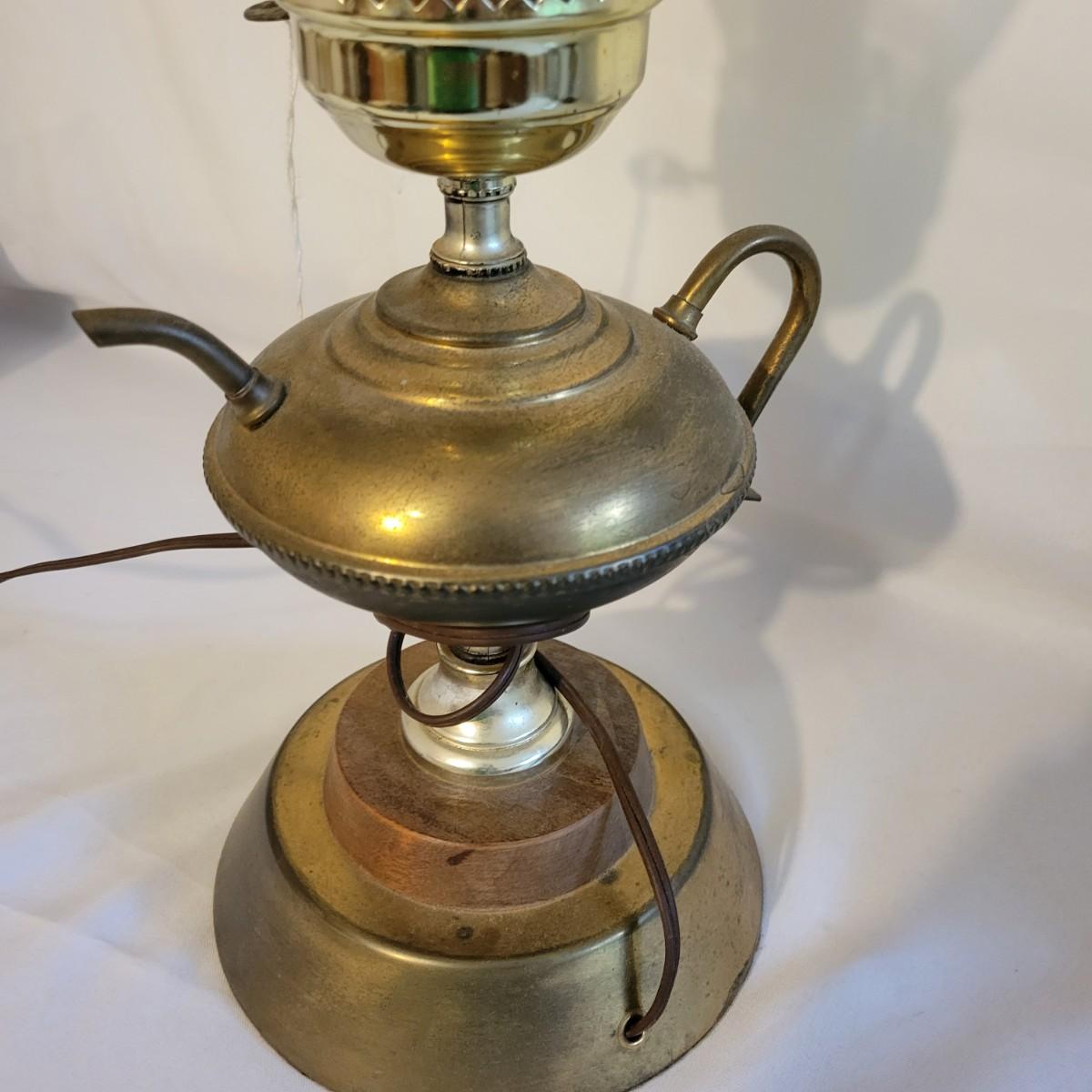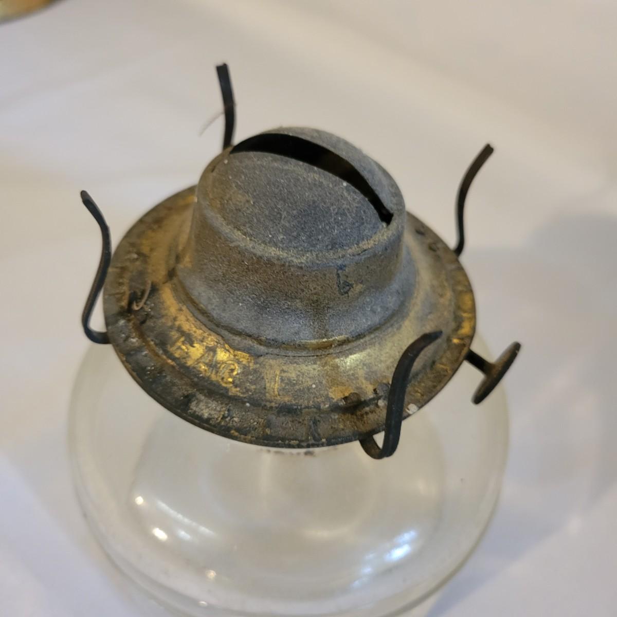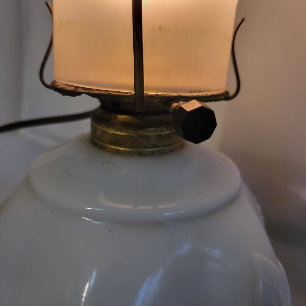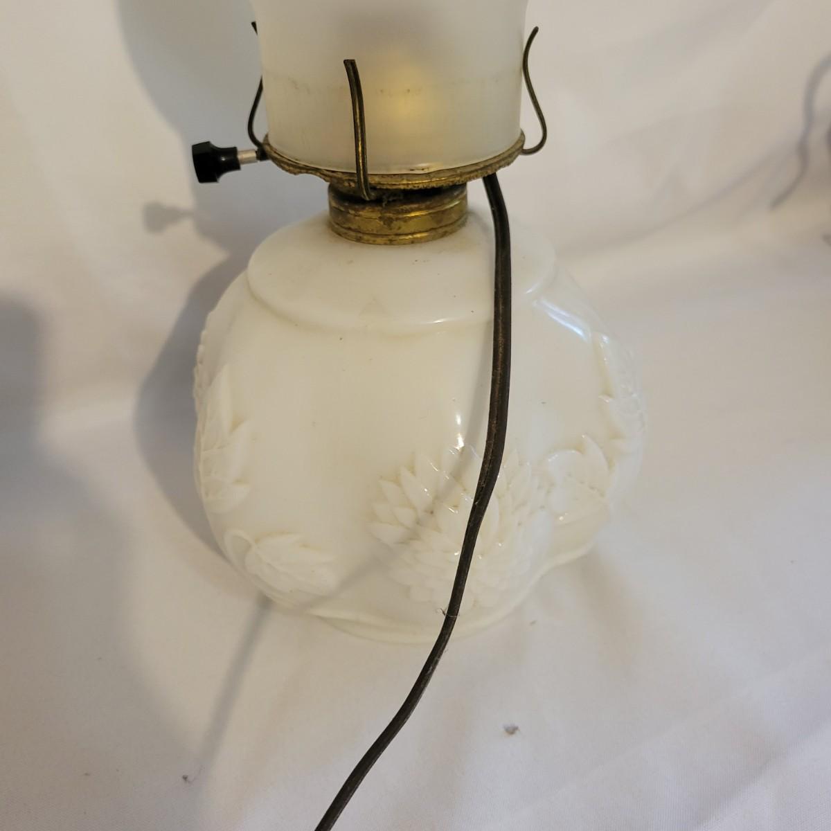 An assortment of 4 vintage hurricane lamps in good condition. 3 are electric and one is oil. One lamp appears to be milk glass and has a frosted globe. The largest lamp has a metal and brass base and a clear globe. This lamp's key to power on is somewhat loose, as is the bulb socket The last electric lamp has a metal base and a frosted globe. The final lamp, the oil lamp, is a clear glass and globe with a metal wick holder. The adjustment stem is bent and the wick has been used up. Largest lamp measures approximately 7" x 19". Shipping available. Shipping can be costly please call UPS store at 828-252-6930 for quote.