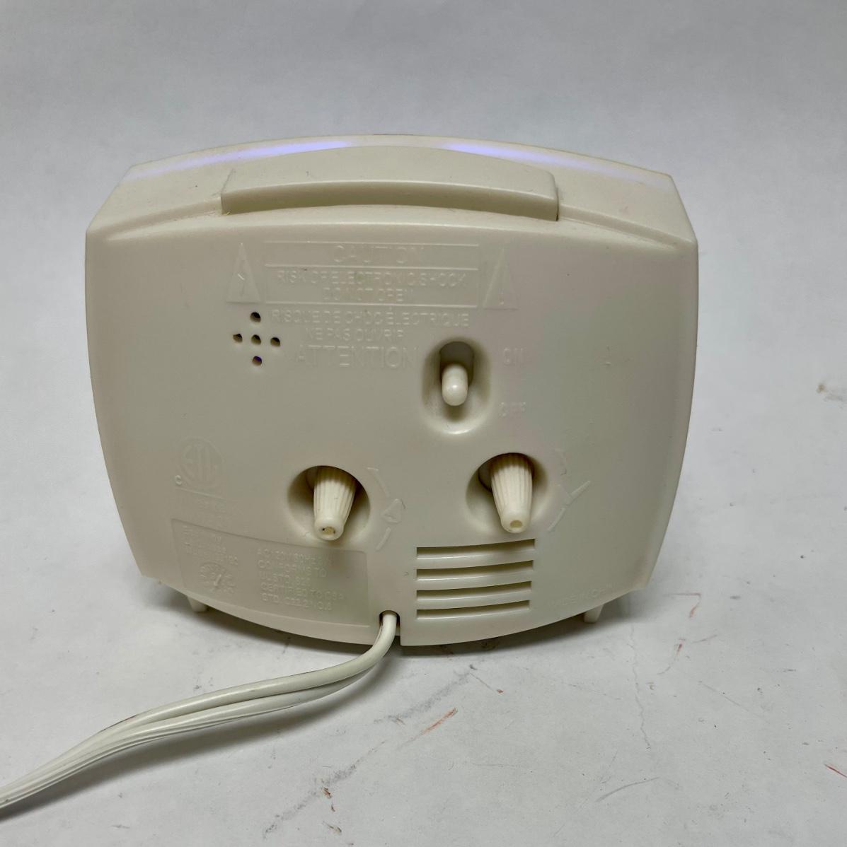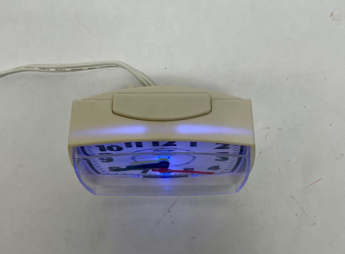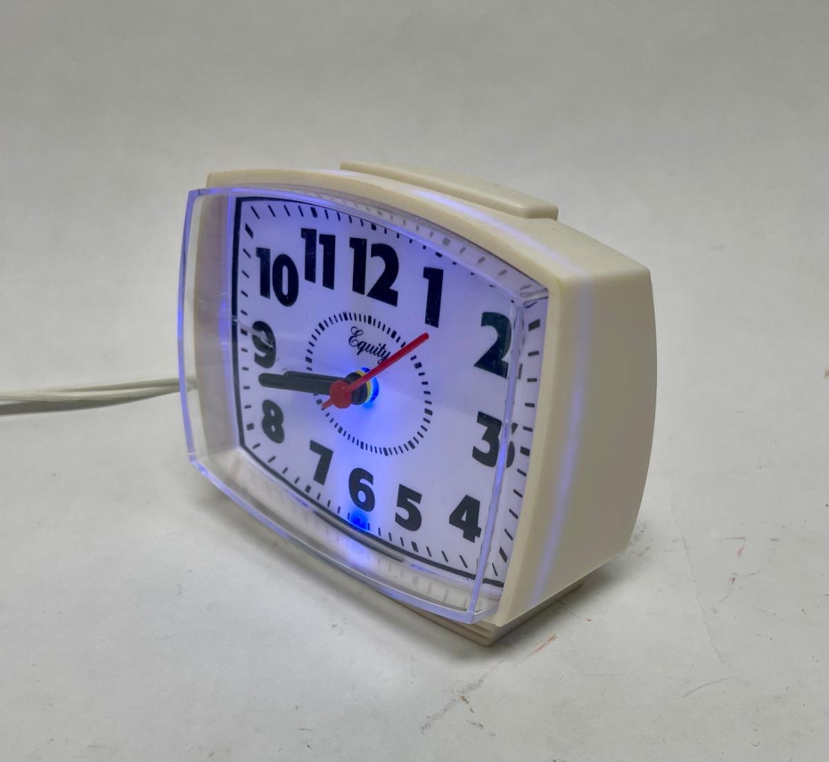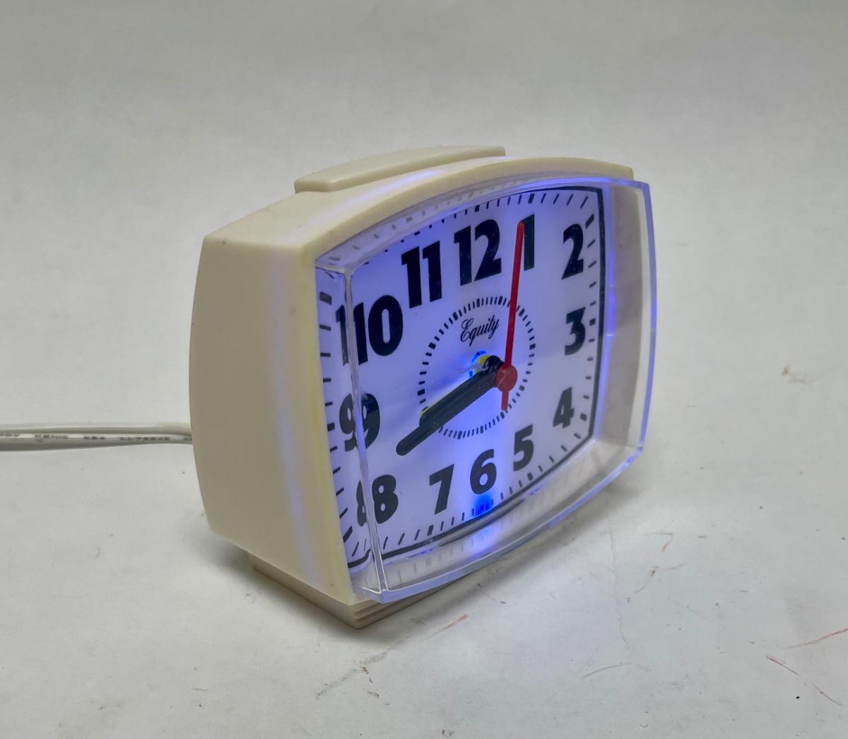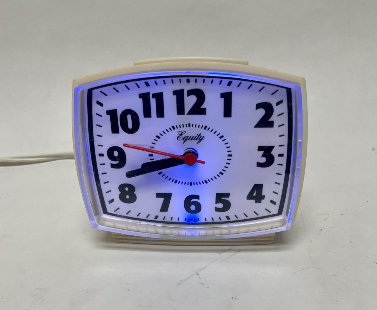 Tested, runs great and alarm works. Equity by La Crosse, model 33100. Has a faint blue light in the dial for nighttime readability..