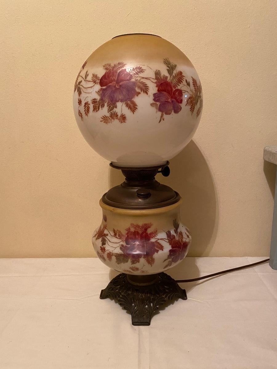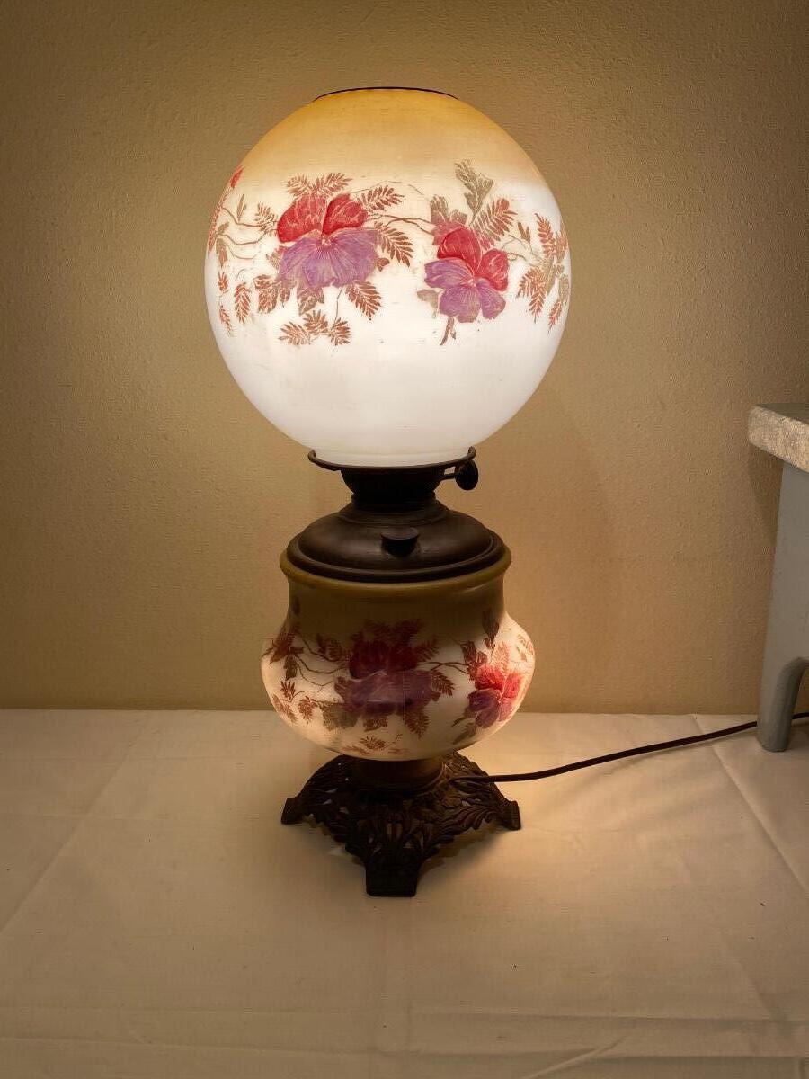 Vintage electric kerosene-style lamp In good condition. Globe has a 28” circumference and lamp is approx 20”h.