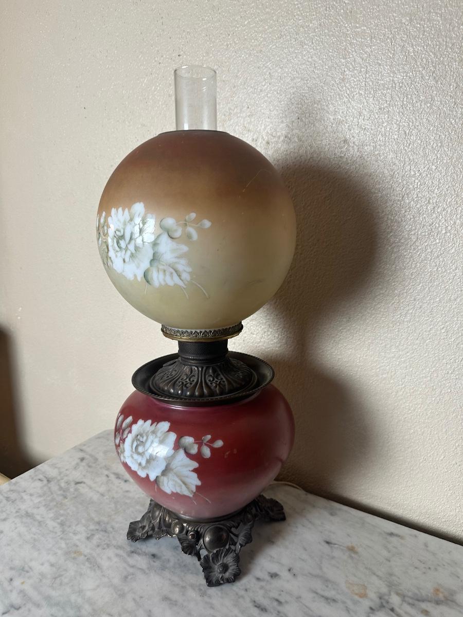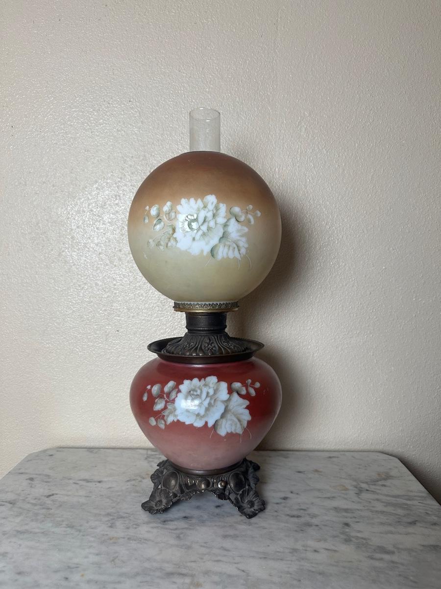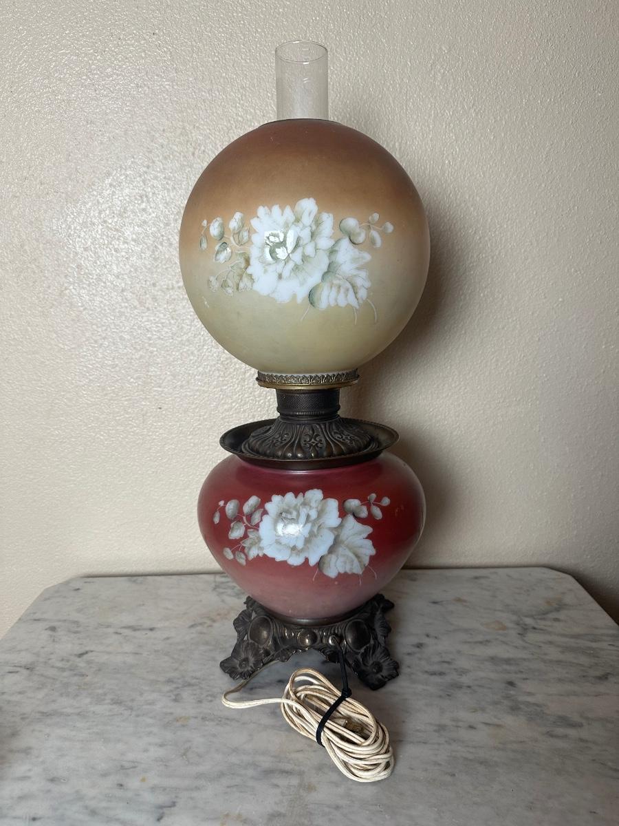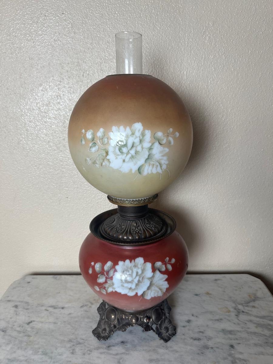 Electrified parlor lamp in the form of an antique oil lamp, featuring hand-painted milk glass globes with floral decoration, ornate metal burner-style assembly, and decorative base with floral feet.