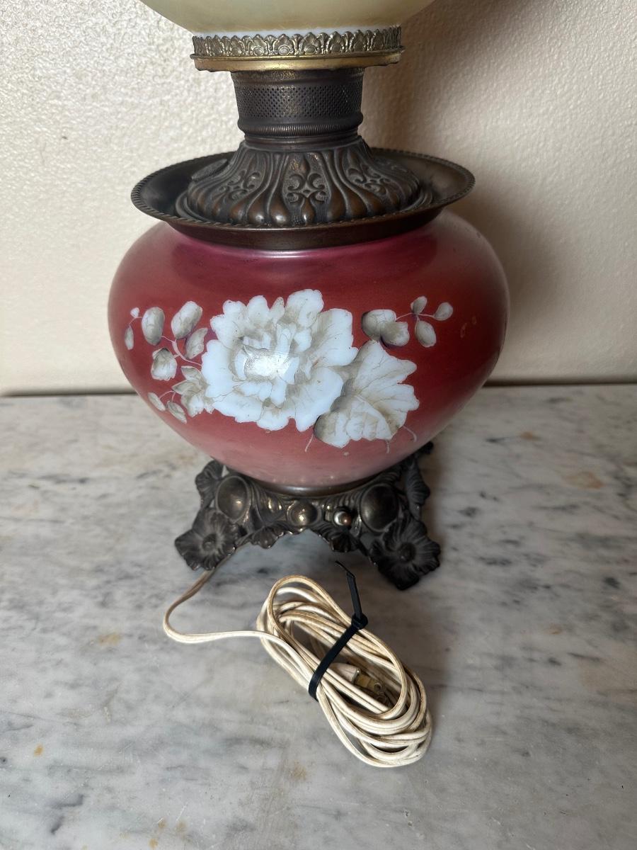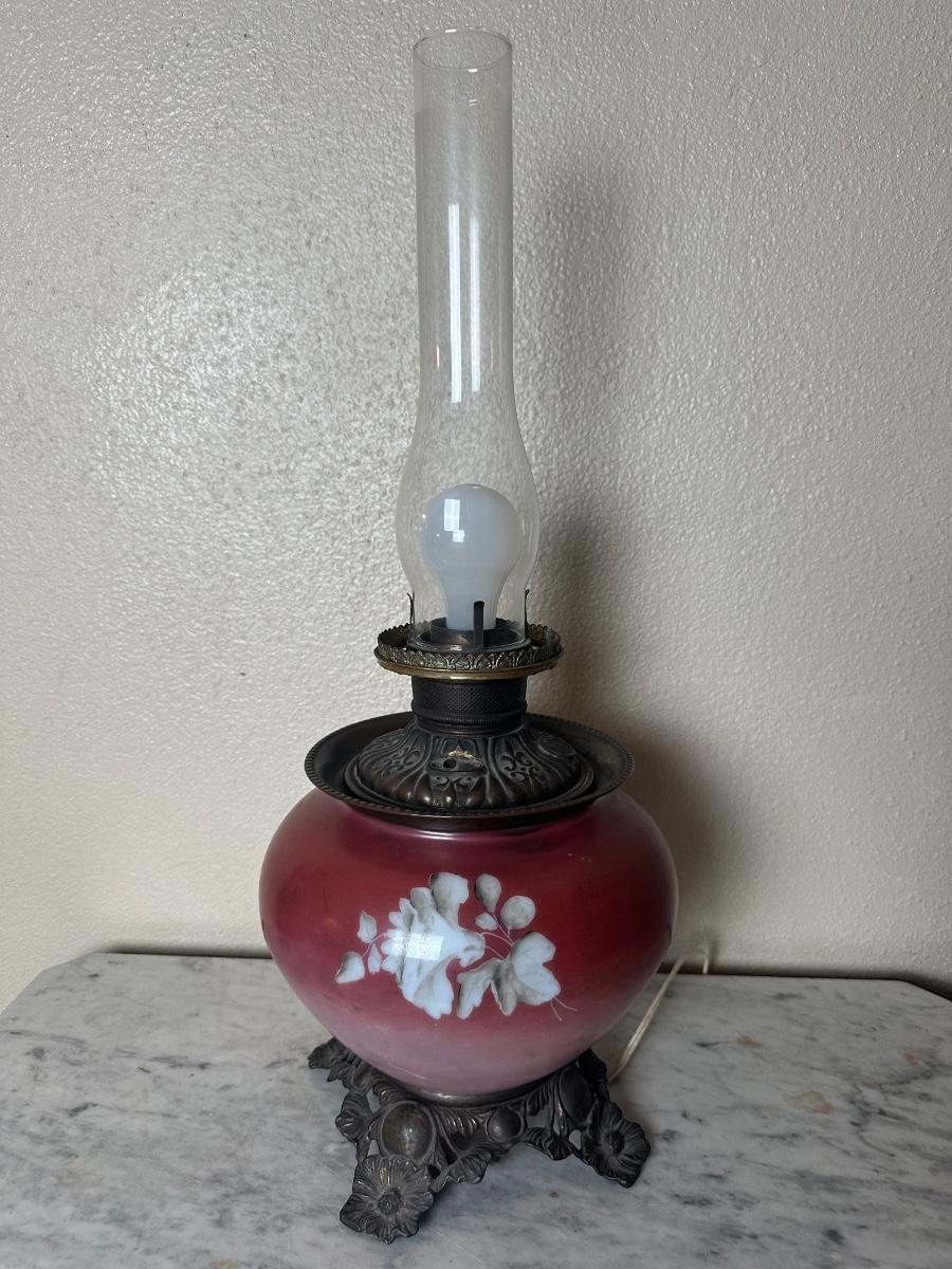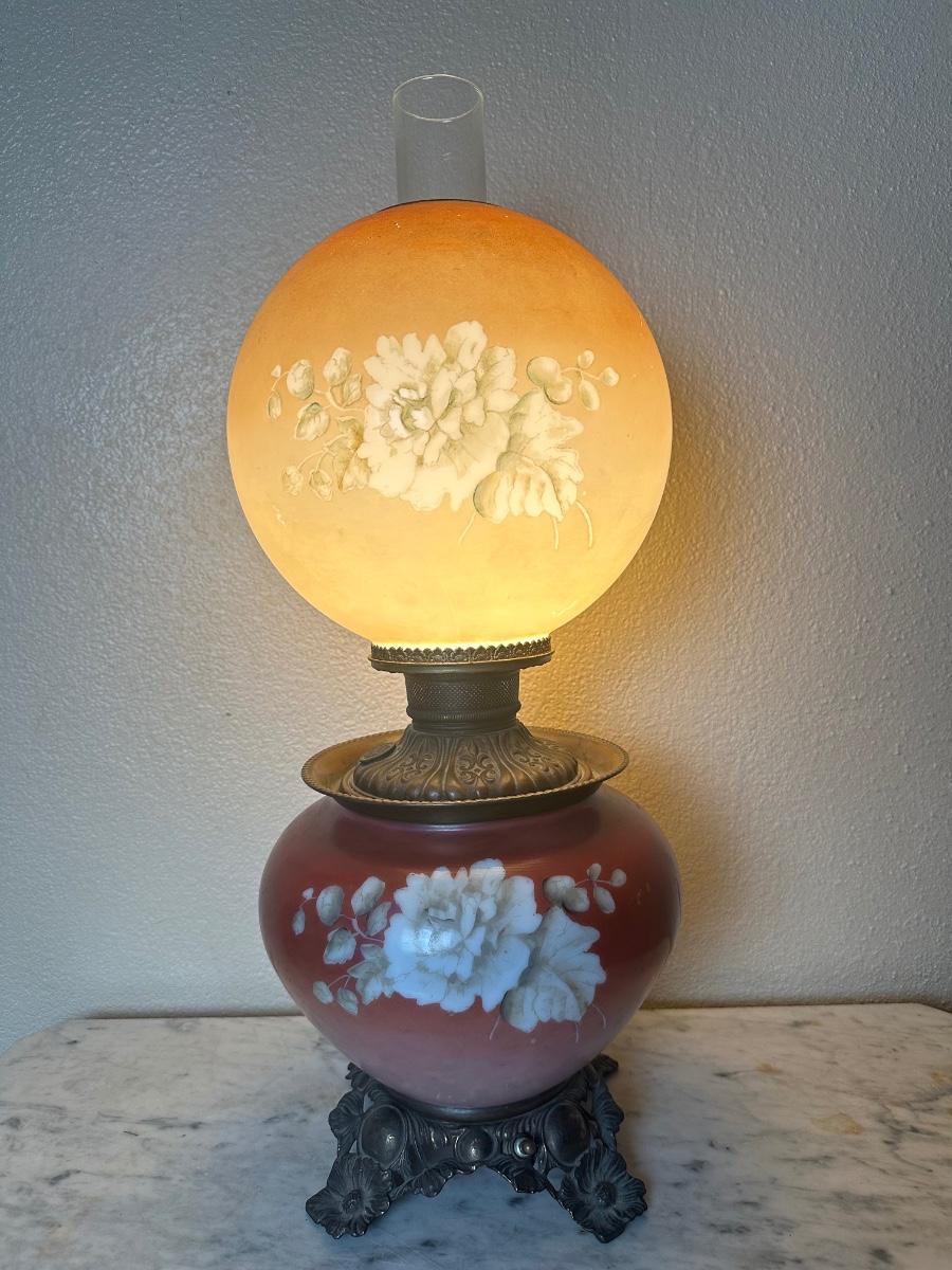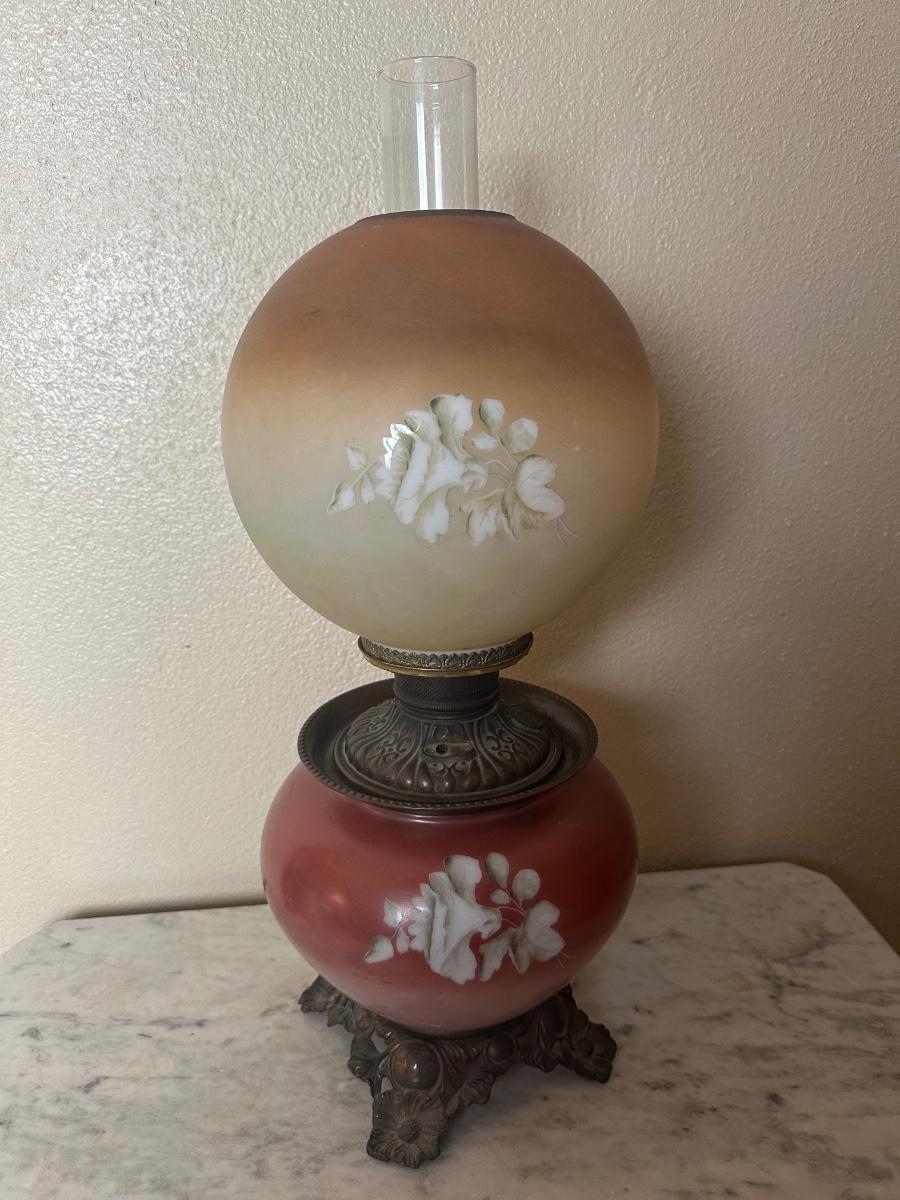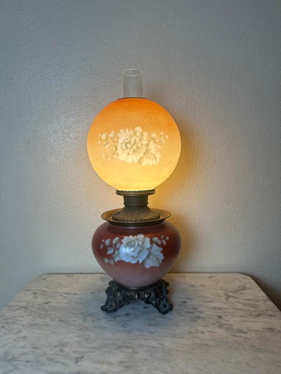 Electrified parlor lamp in the form of an antique oil lamp, featuring hand-painted milk glass globes with floral decoration, ornate metal burner-style assembly, and decorative base with floral feet.