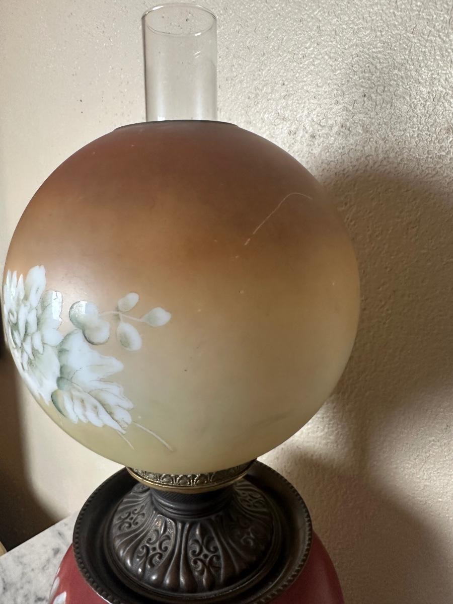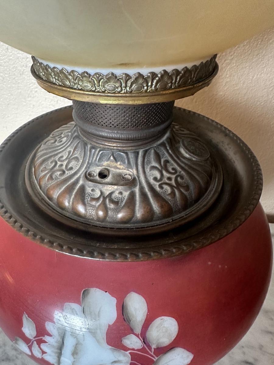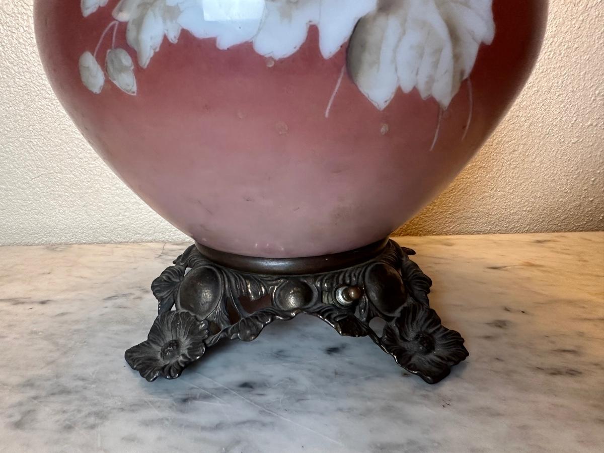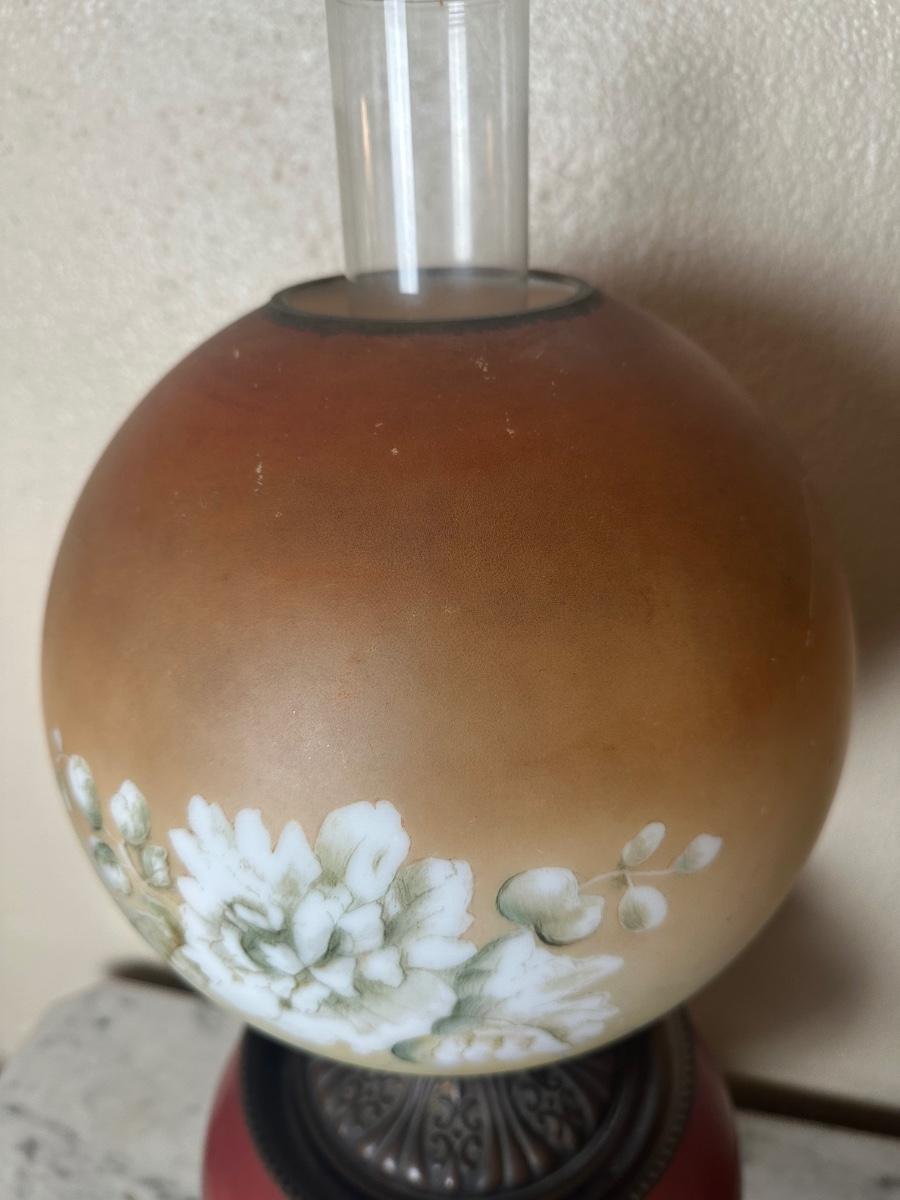 Electrified parlor lamp in the form of an antique oil lamp, featuring hand-painted milk glass globes with floral decoration, ornate metal burner-style assembly, and decorative base with floral feet.