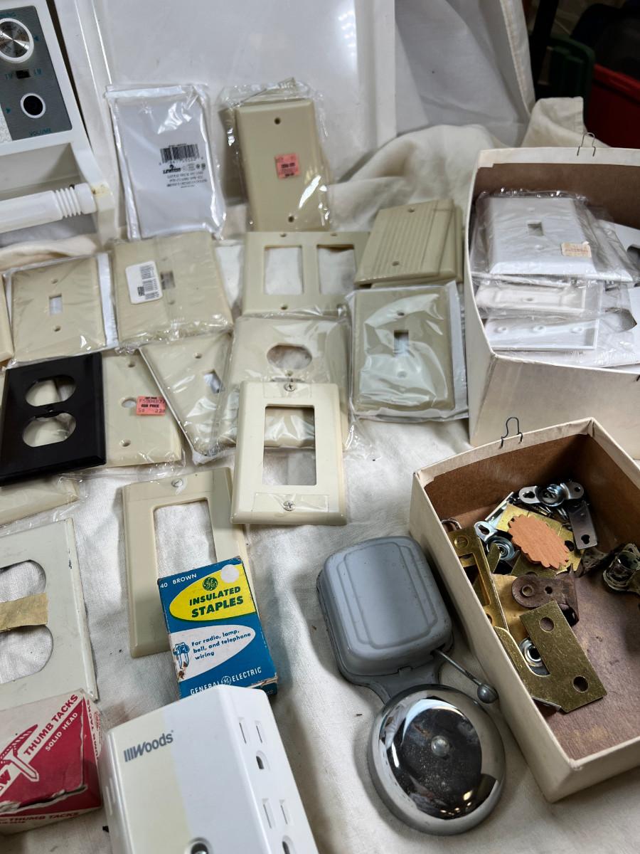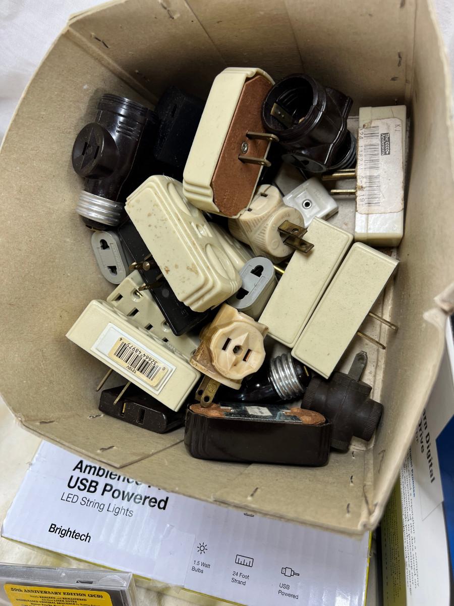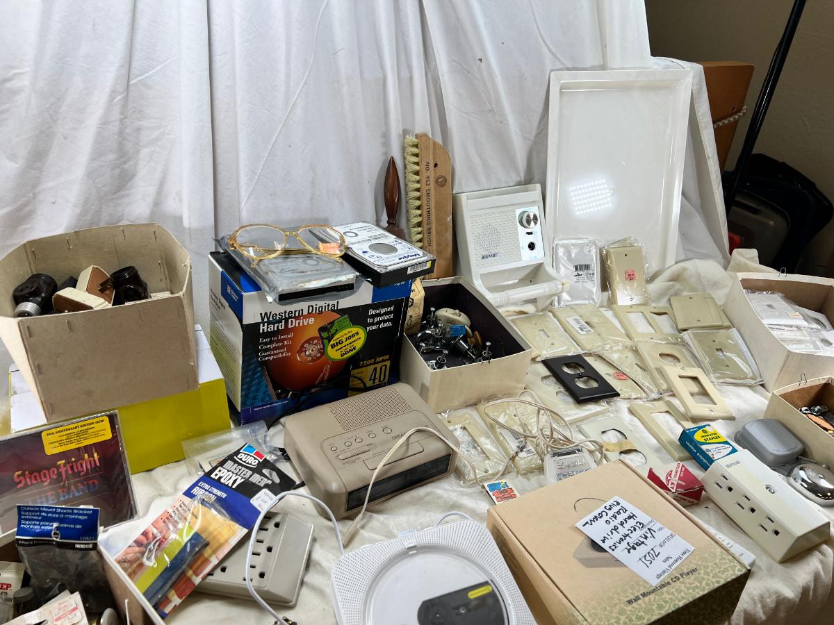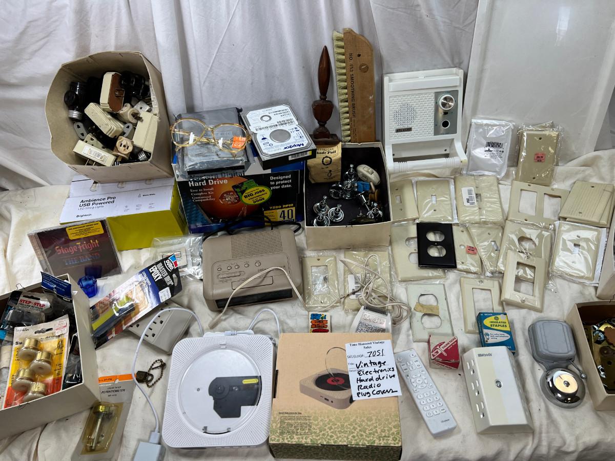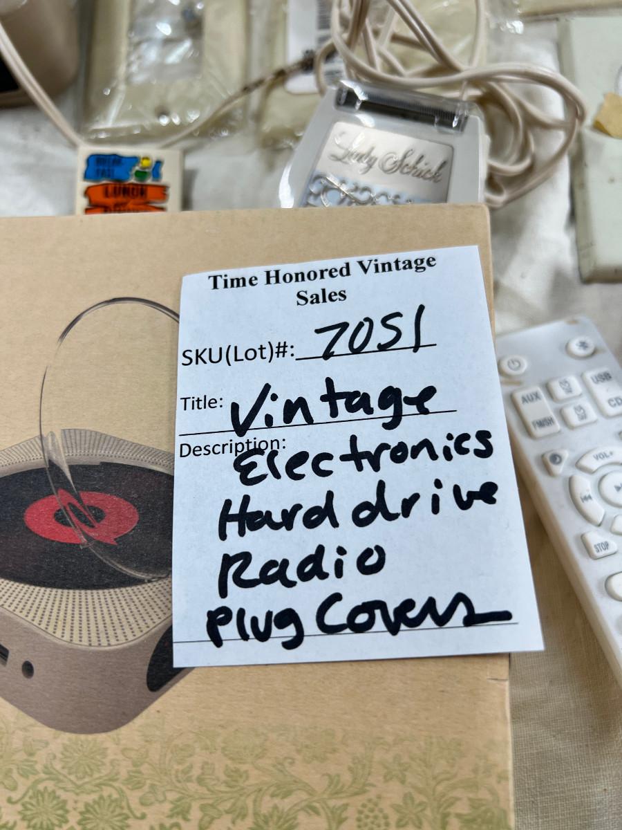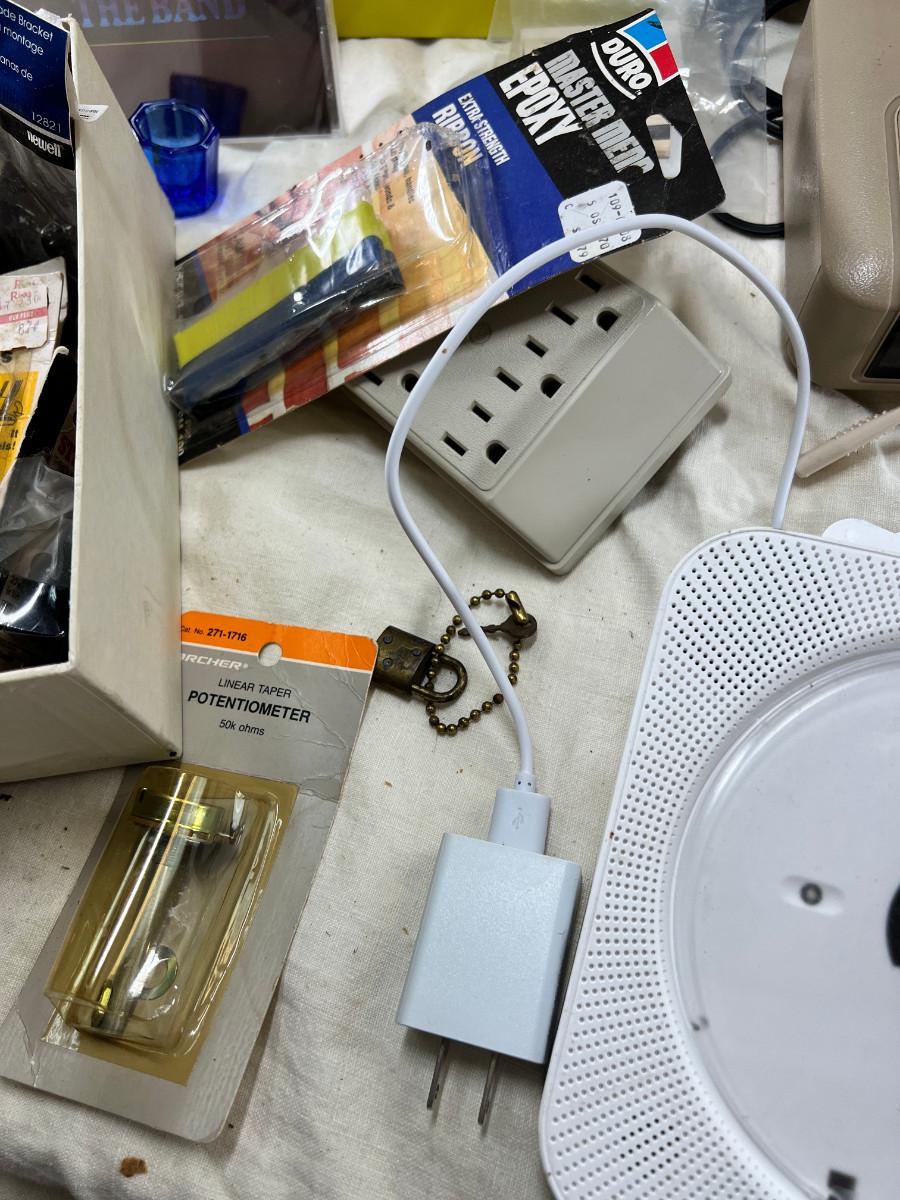 plastic covers in white and almond, Sony dream machine clock radio ( untested) Wall mounted CD player and CD working, NOS shower radio, 2 hard rives, plug strips, and various attachments.