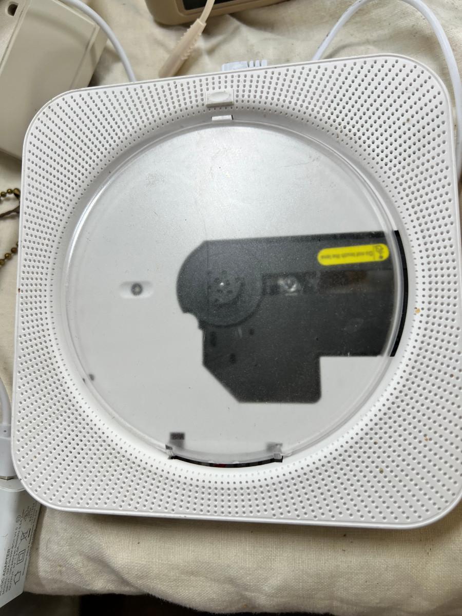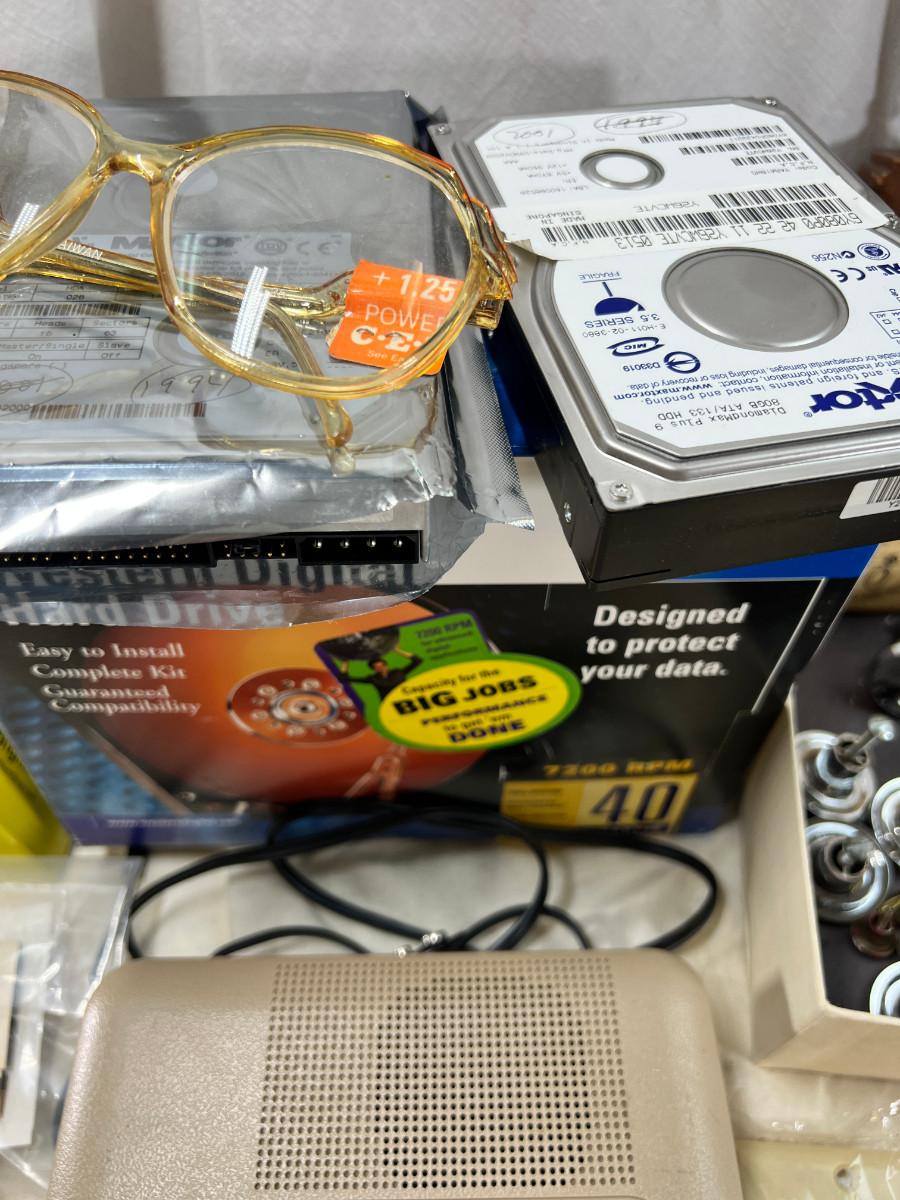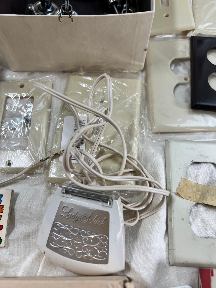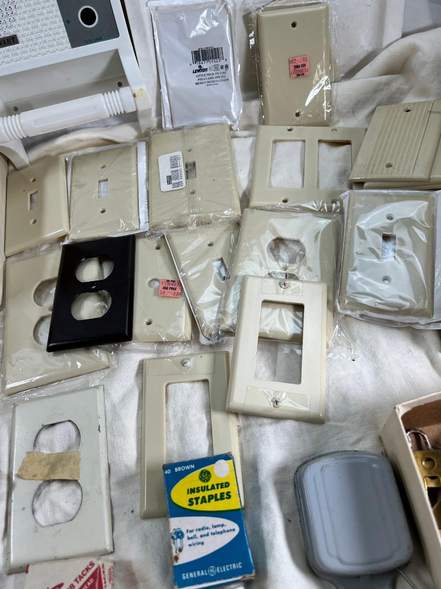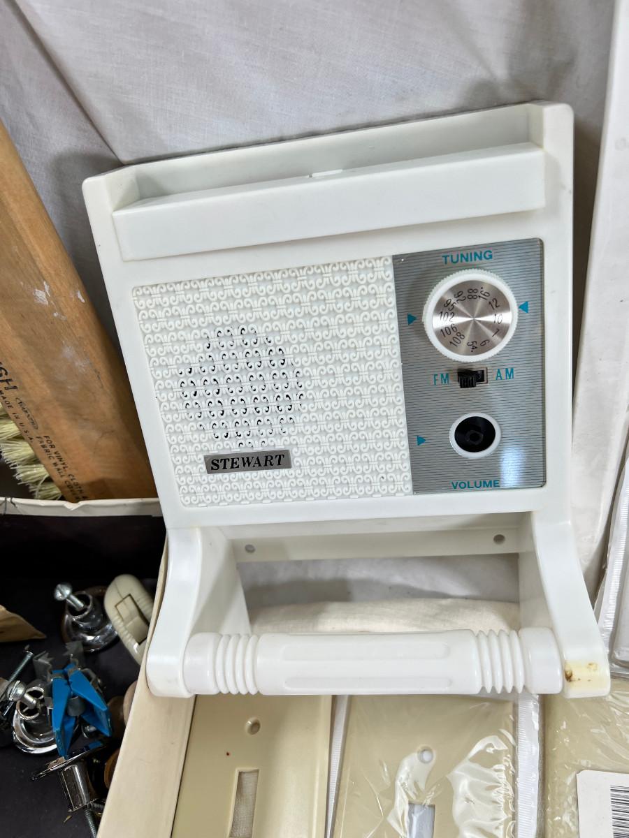 plastic covers in white and almond, Sony dream machine clock radio ( untested) Wall mounted CD player and CD working, NOS shower radio, 2 hard rives, plug strips, and various attachments.