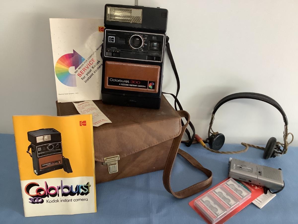 Vintage electronics lot-Kodak Colorburst 300 with manual, Sony cassette players and cassettes, headphone receiver AN8-H-1