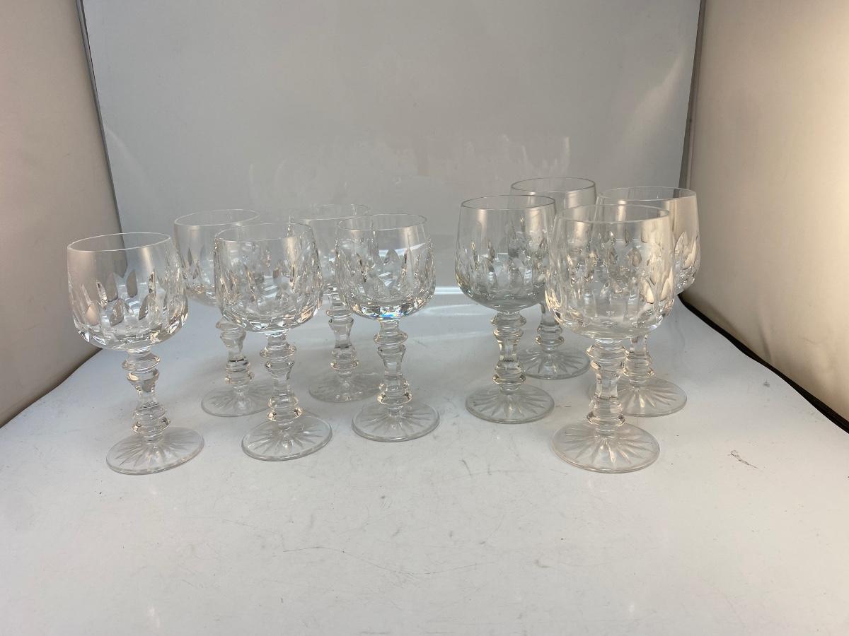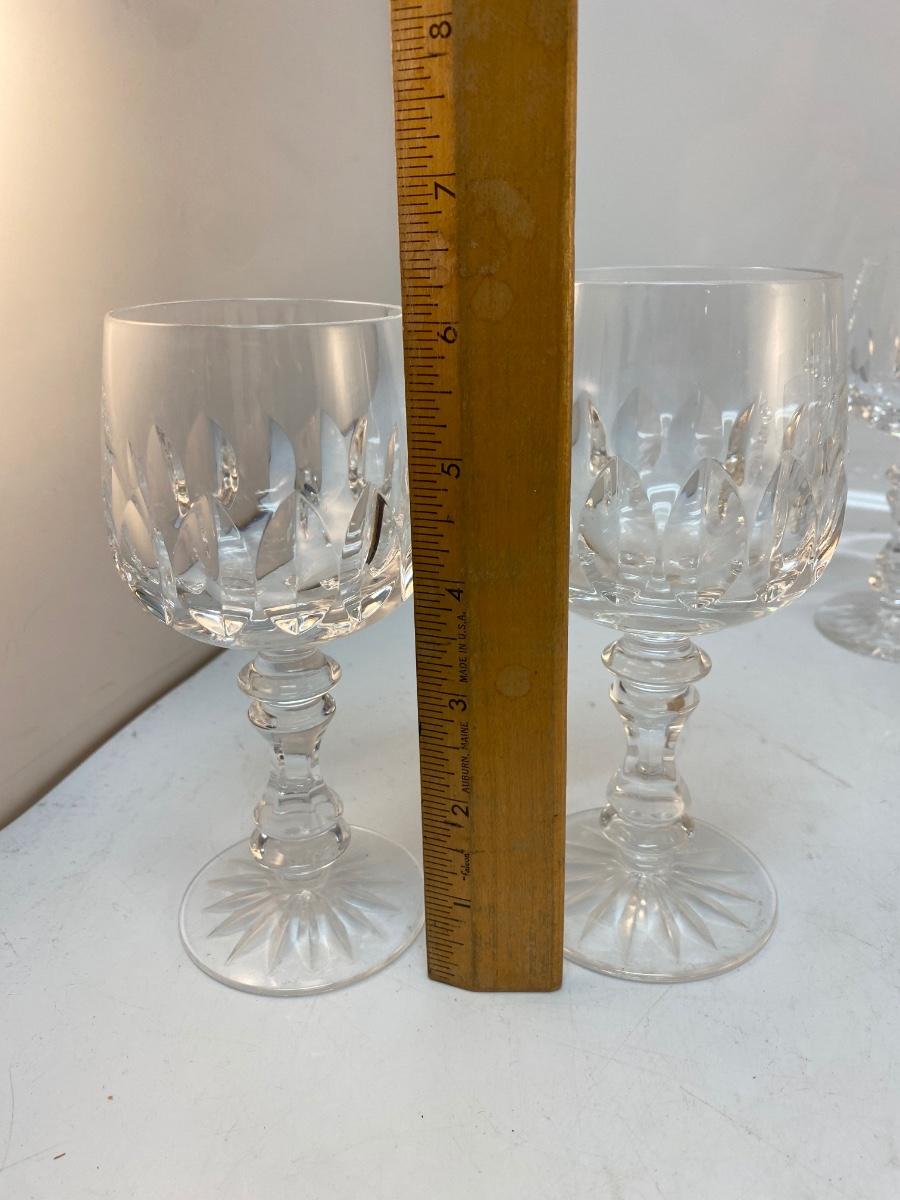 Vintage Elegant Notch Cut Crystal Wine Water Goblet Drink Glasses Two Sizes. 5 of the smaller, 4 of the large. Elegant yet simple notch cut around the bottom of goblet. No maker marks but nice clear crystal. Around 6" size, see photos. No chips. Match the champagne flutes also on auction.