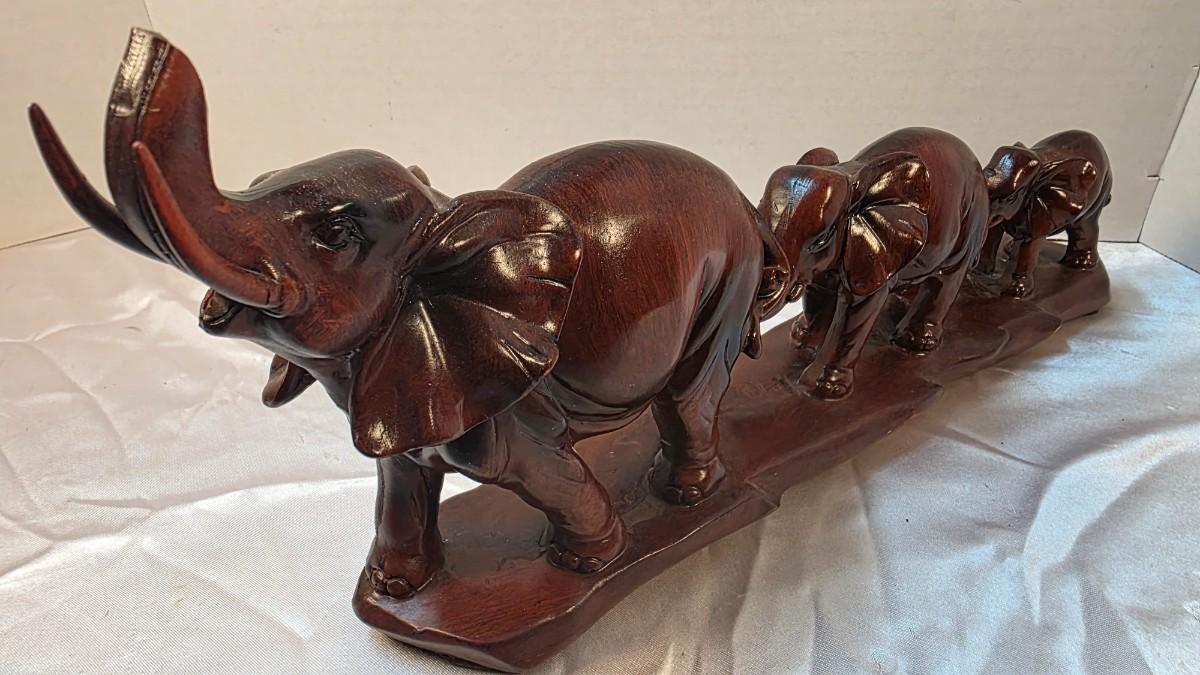 This vintage elephant family sculpture captures a quiet moment of guidance and togetherness, depicting three elephants moving forward in a connected procession. The lead elephant strides confidently ahead while the smaller companions follow closely, creating a natural sense of flow, balance, and purpose across the elongated base.