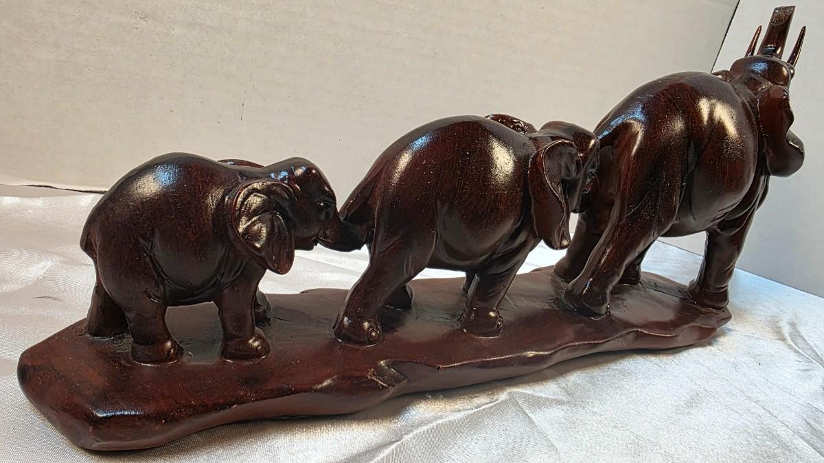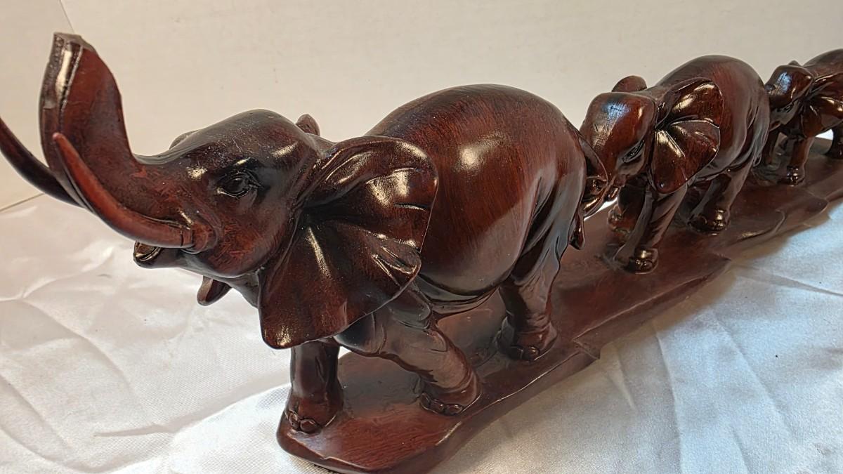 Crafted from resin, the piece features a deep brown finish designed to evoke the warmth and character of carved wood or aged metal. The sculpting emphasizes smooth contours and gentle detailing, giving each elephant a rounded, lifelike presence without excessive ornamentation. The unified base adds stability while reinforcing the story-driven composition.
