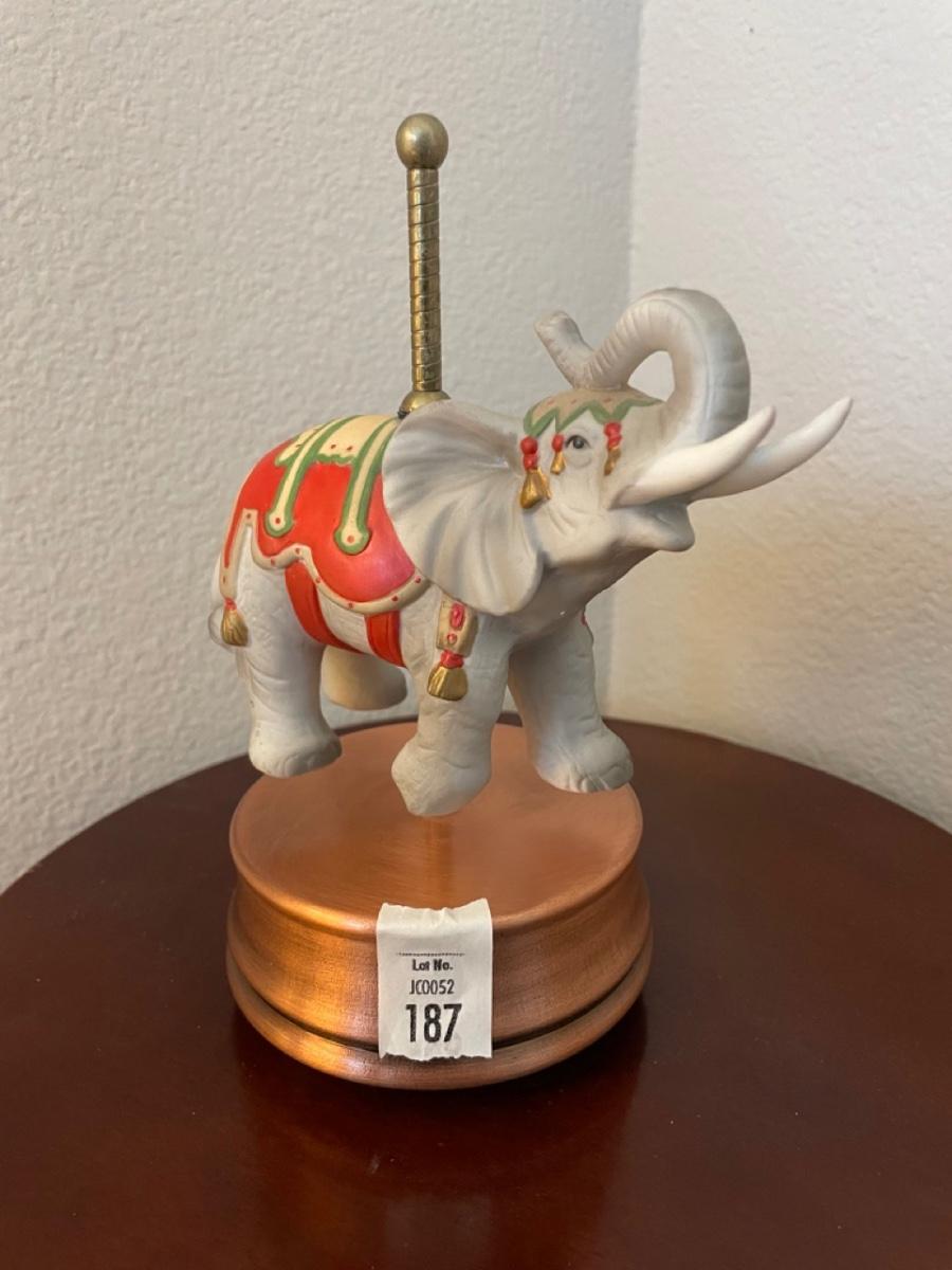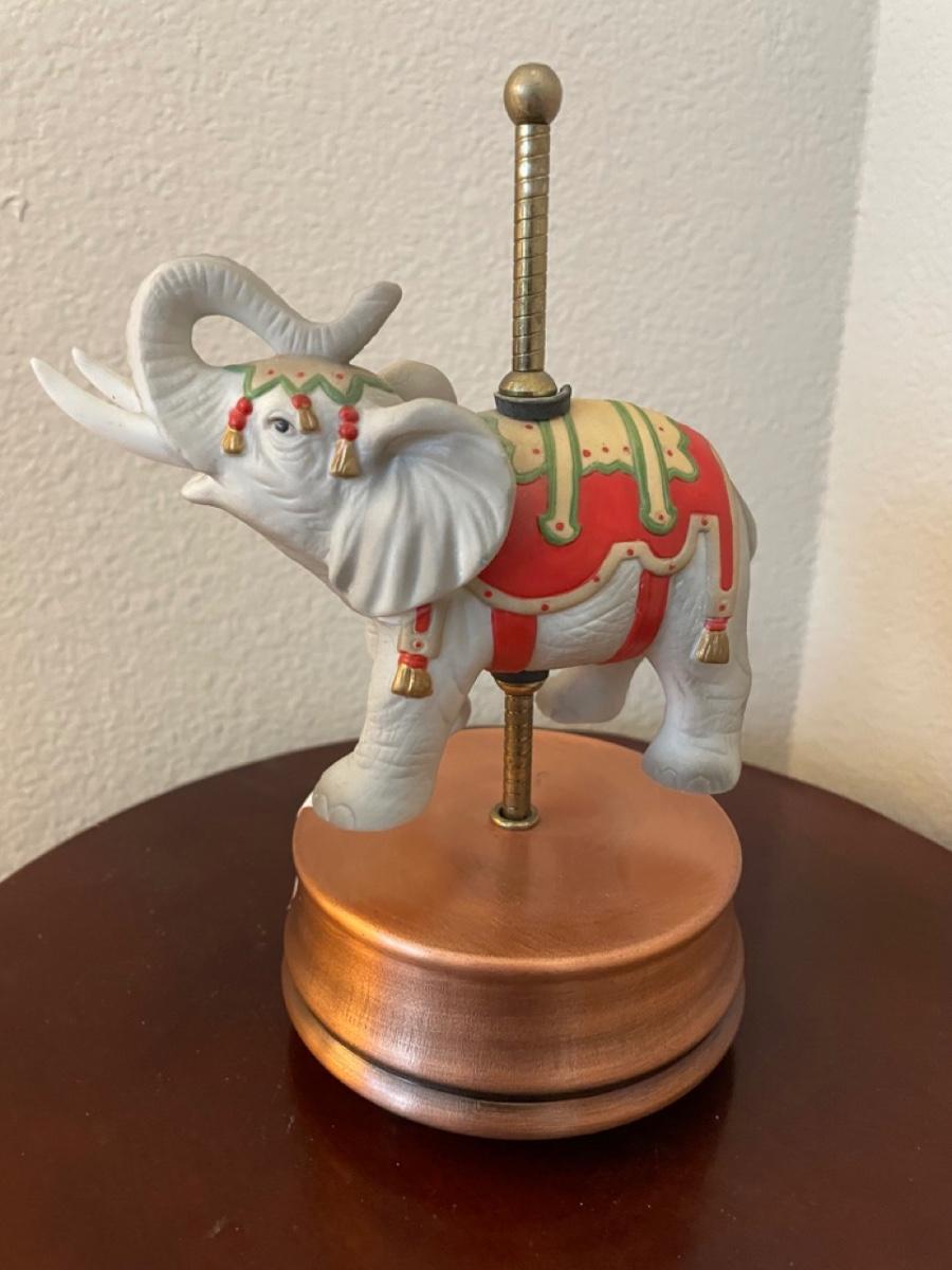 Porcelain elephant music box in excellent condition. "Plays Roll out the Barrel"