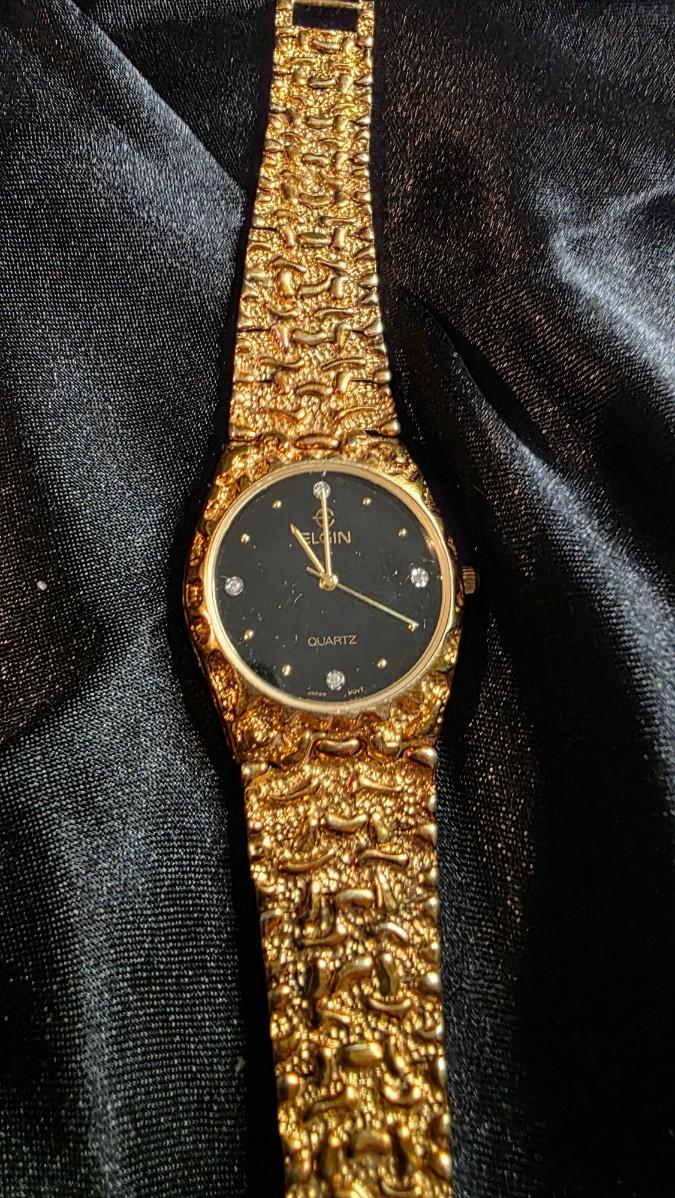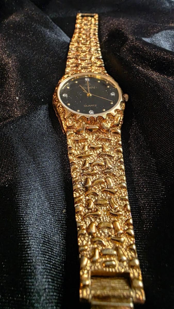 Vintage Elgin Ladies Gold Nugget Quartz Watch - Diamond Markers Black Dial with Nugget Link Bracelet