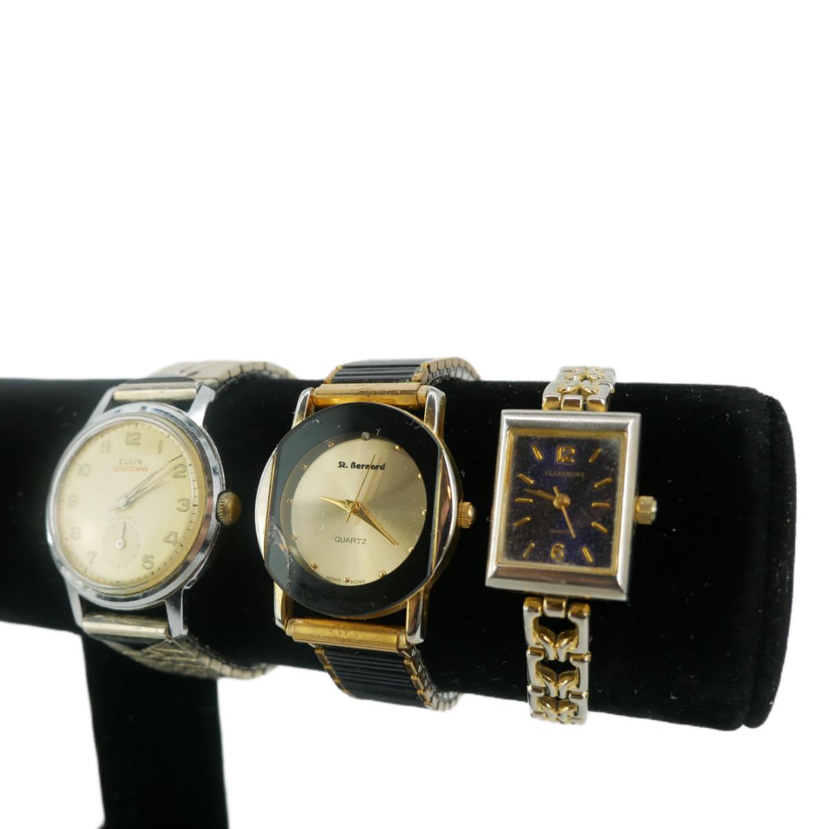 Vintage Elgin Sportsman 17 jewels men's watch measures approximately 6.5" adjusting band with a 35mm face. St. Bernard men's watch measures approximately 6" adjusting band with a 30mm face. Large crack found on face. Women's Claremont square faced watch measures approximately 6.25" long with a 20mm face. Lot weighs 4 oz. All in used, non-operational condition. (J6)