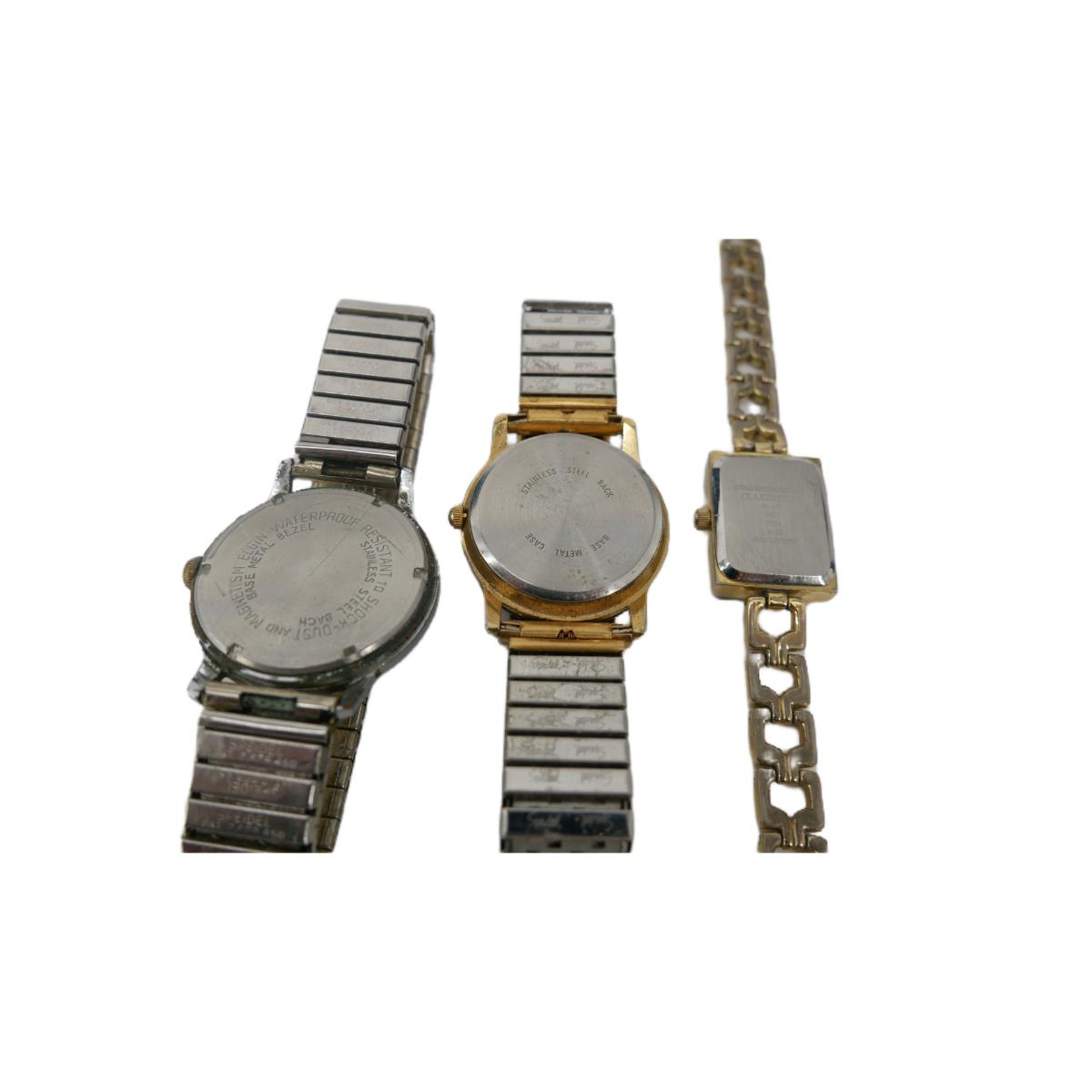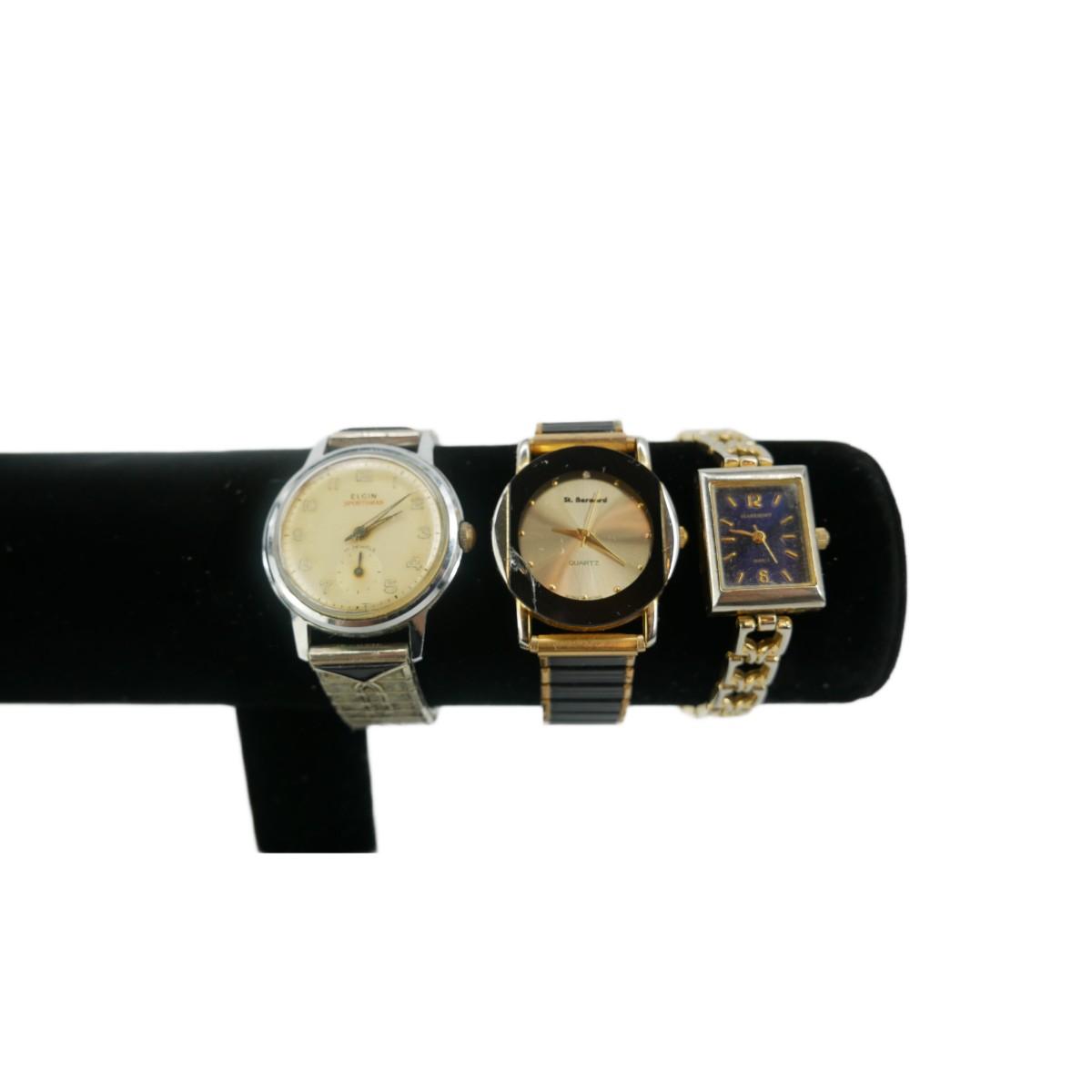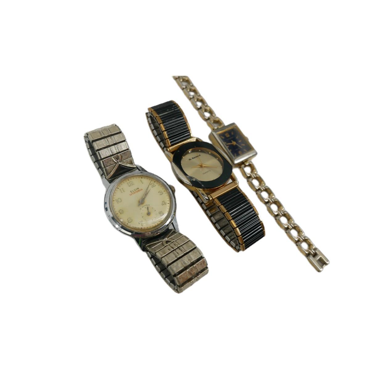 Vintage Elgin Sportsman 17 jewels men's watch measures approximately 6.5" adjusting band with a 35mm face. St. Bernard men's watch measures approximately 6" adjusting band with a 30mm face. Large crack found on face. Women's Claremont square faced watch measures approximately 6.25" long with a 20mm face. Lot weighs 4 oz. All in used, non-operational condition. (J6)