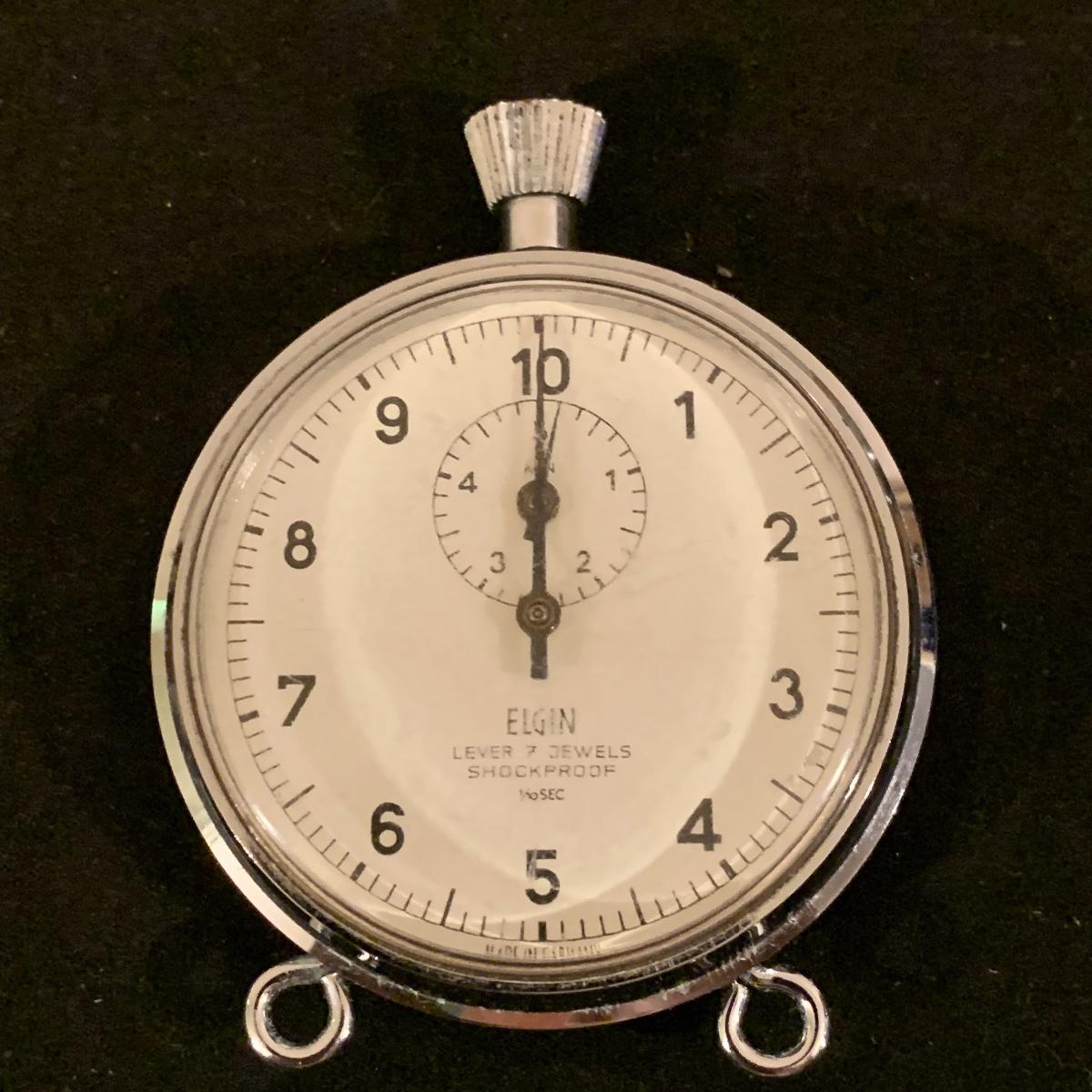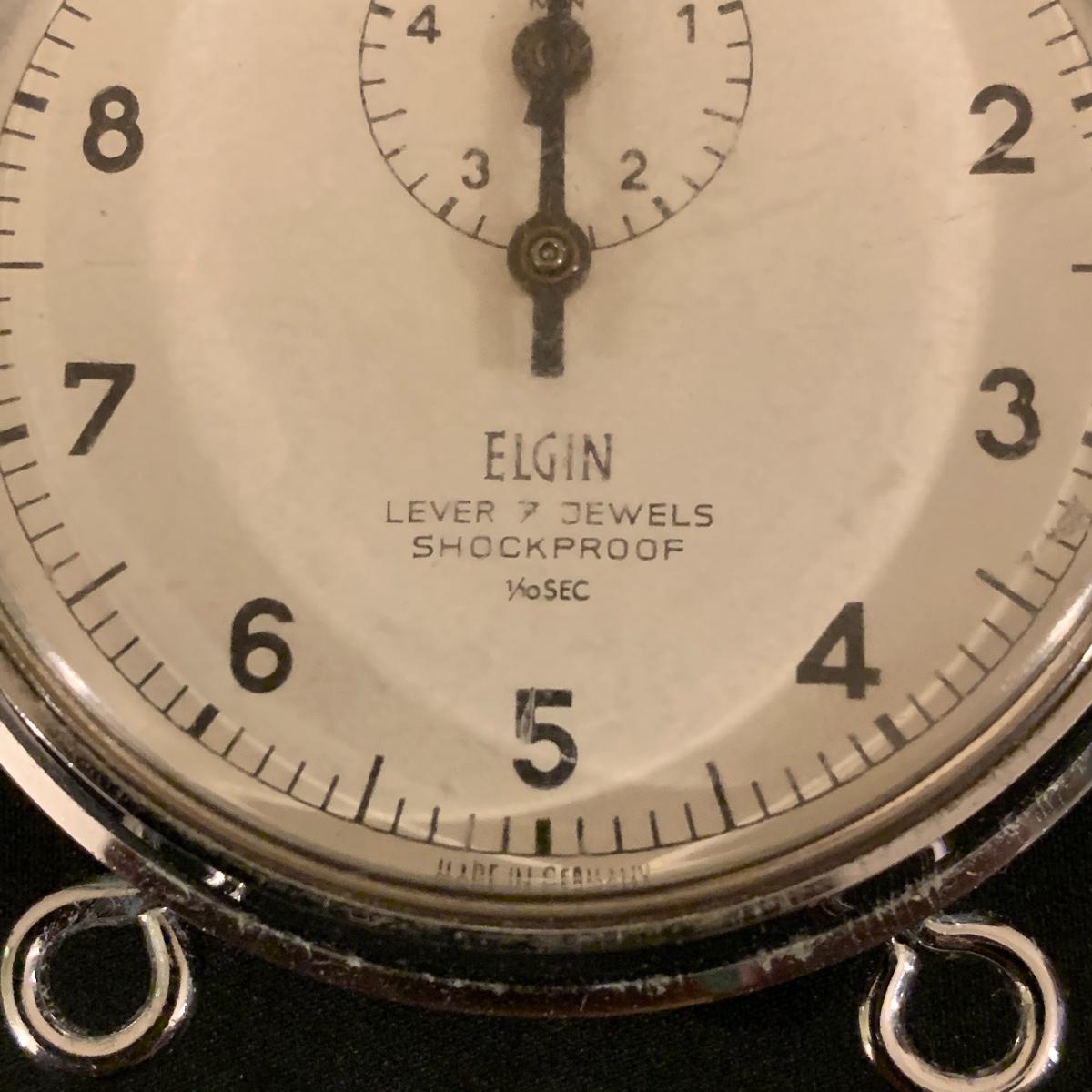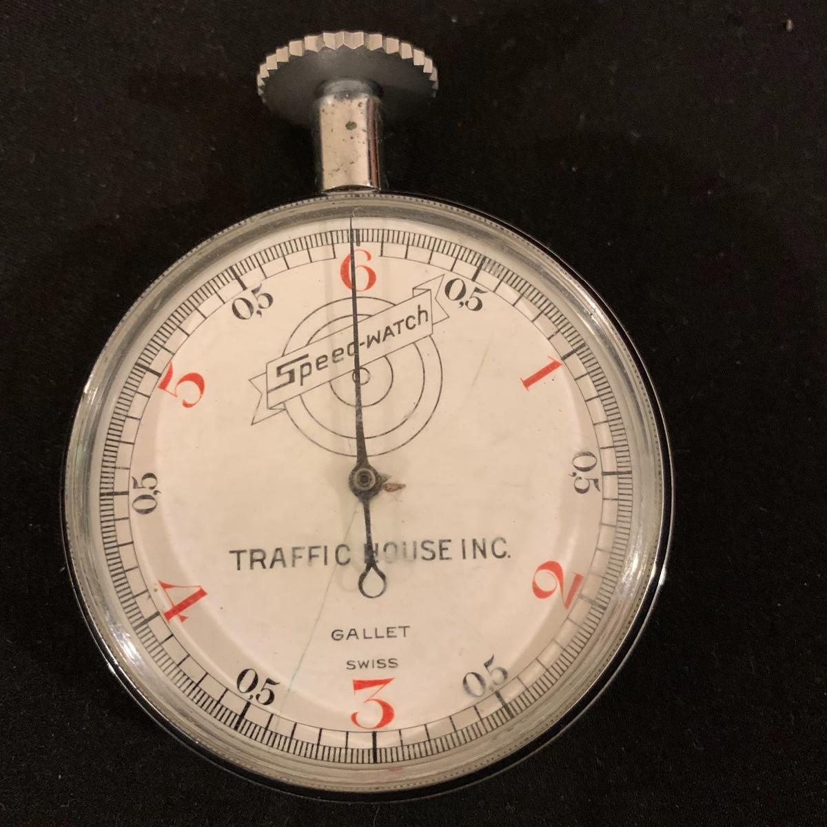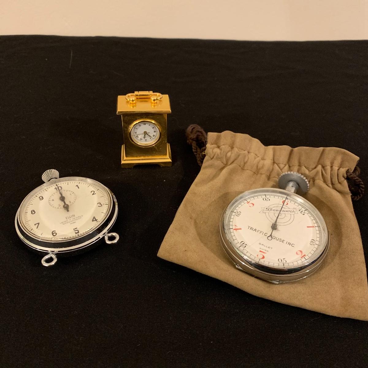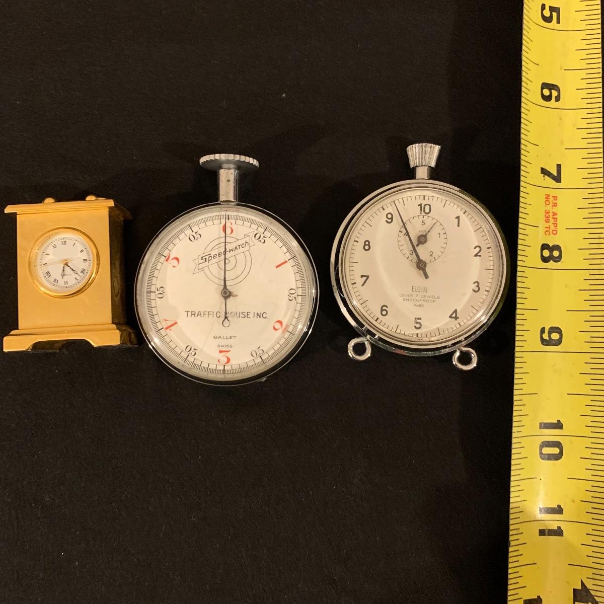 Three piece set includes an Elgin stopwatch that does work with a few scratches and pen marks on back. Also included is a Speedwatch by Traffic House Inc. This piece is not in working condition. Also included is a small Quartz battery operated clock. This one is also not running as battery may be dead. Shipping available.