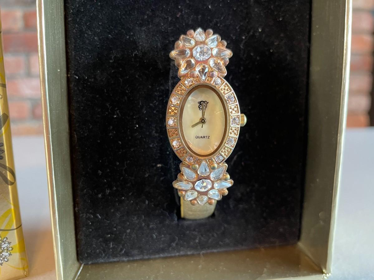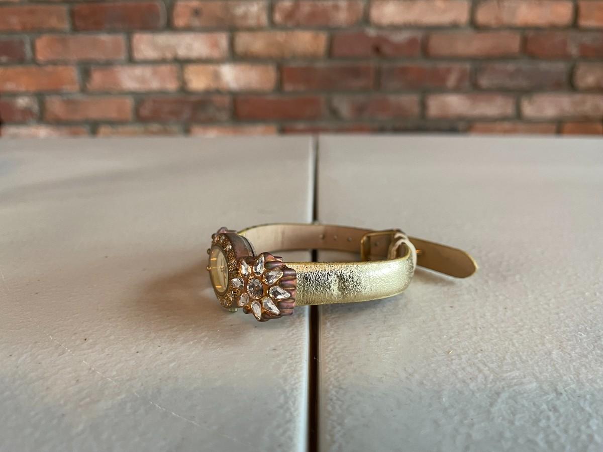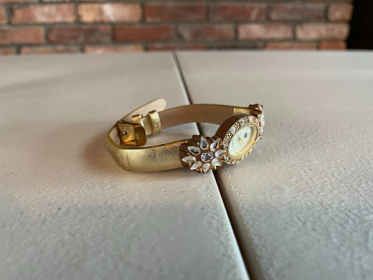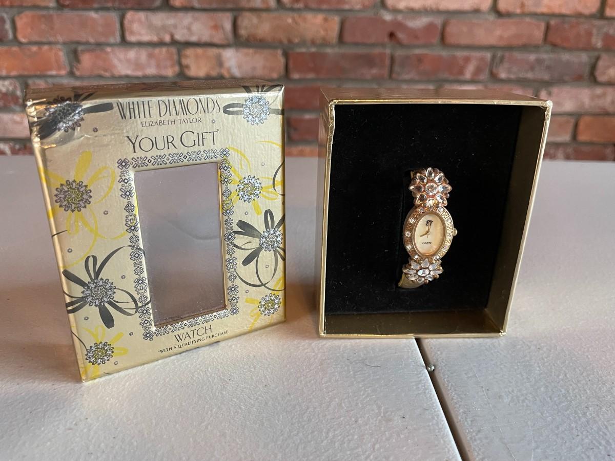 Vintage Elizabeth Taylor White Diamonds Watch GWP Rhinestone Faux Leather Gold Band