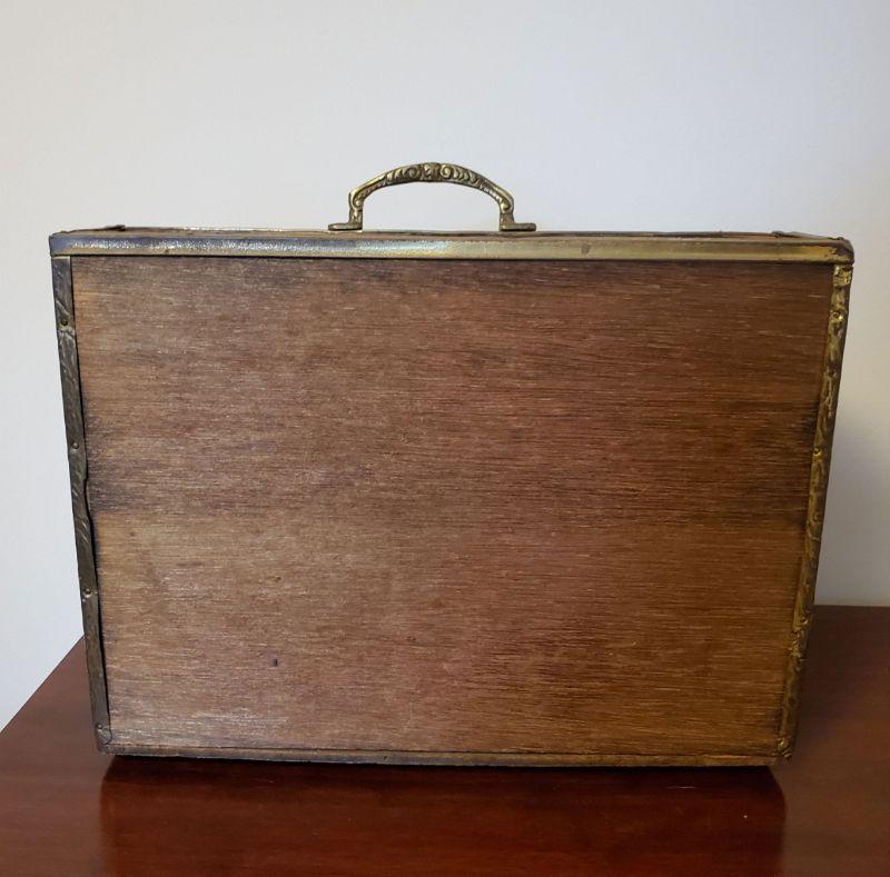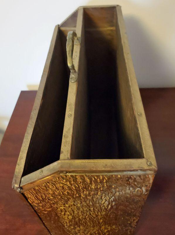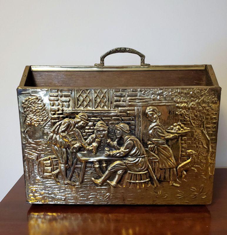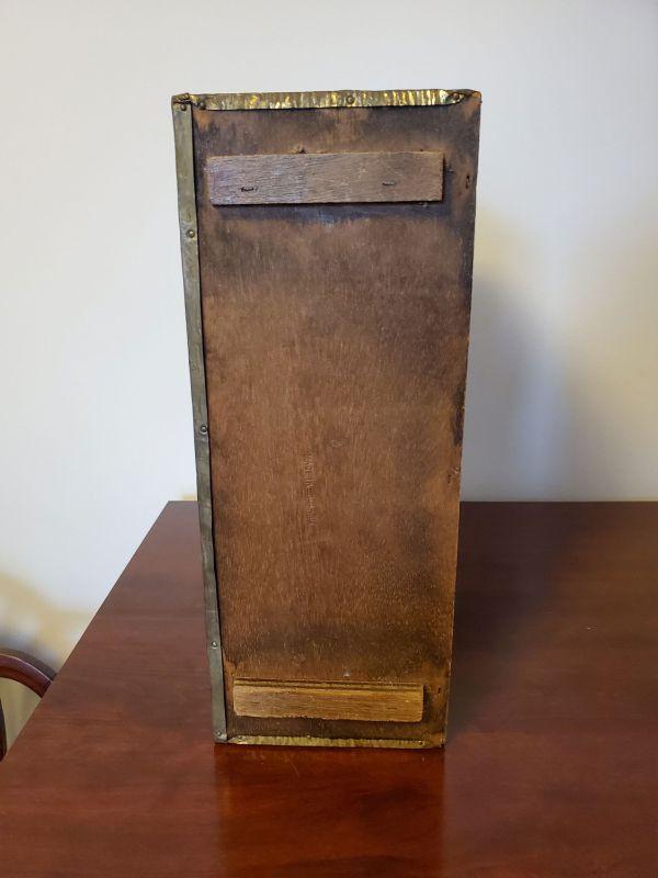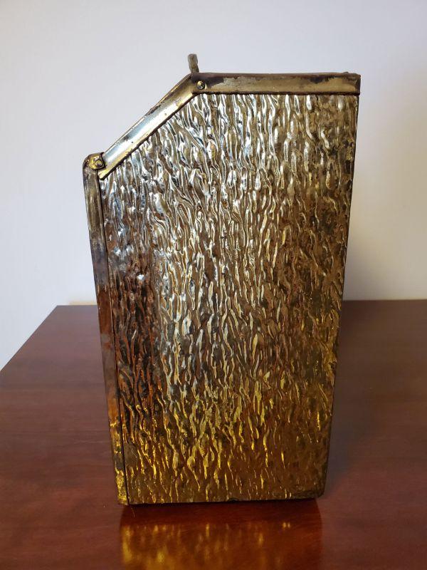 Beautifully embossed brass over wood, in great condition. it is 14 1/2" wide, 6" deep and stands 11" tall.