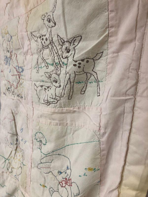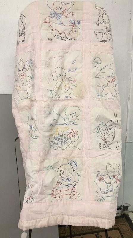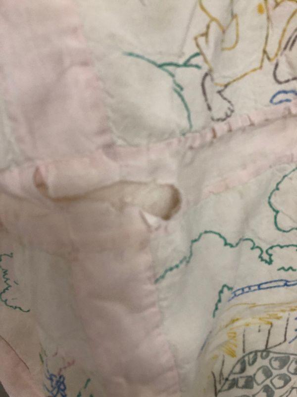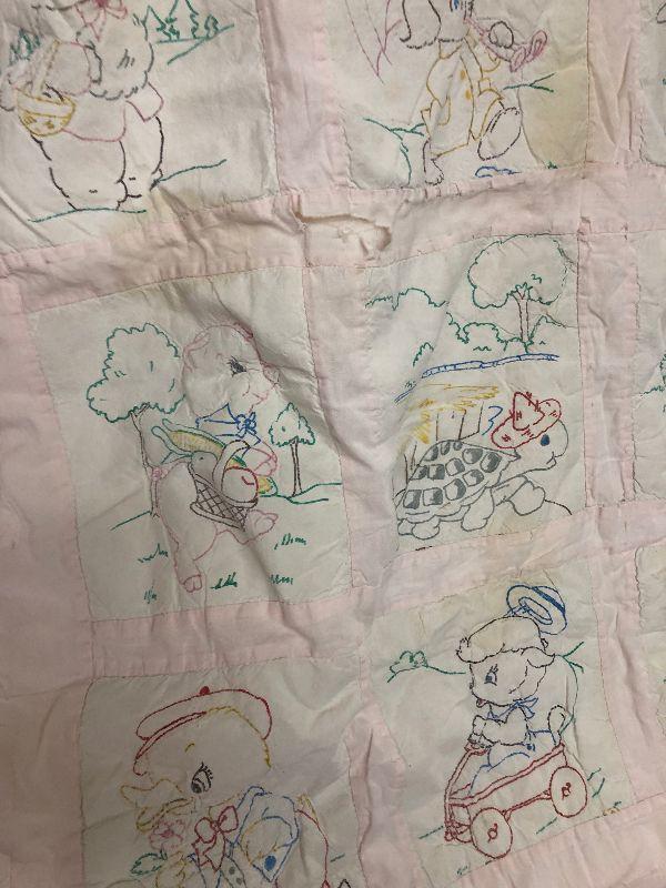 Offered as is with some damage here is a vintage embroidered baby quilt....