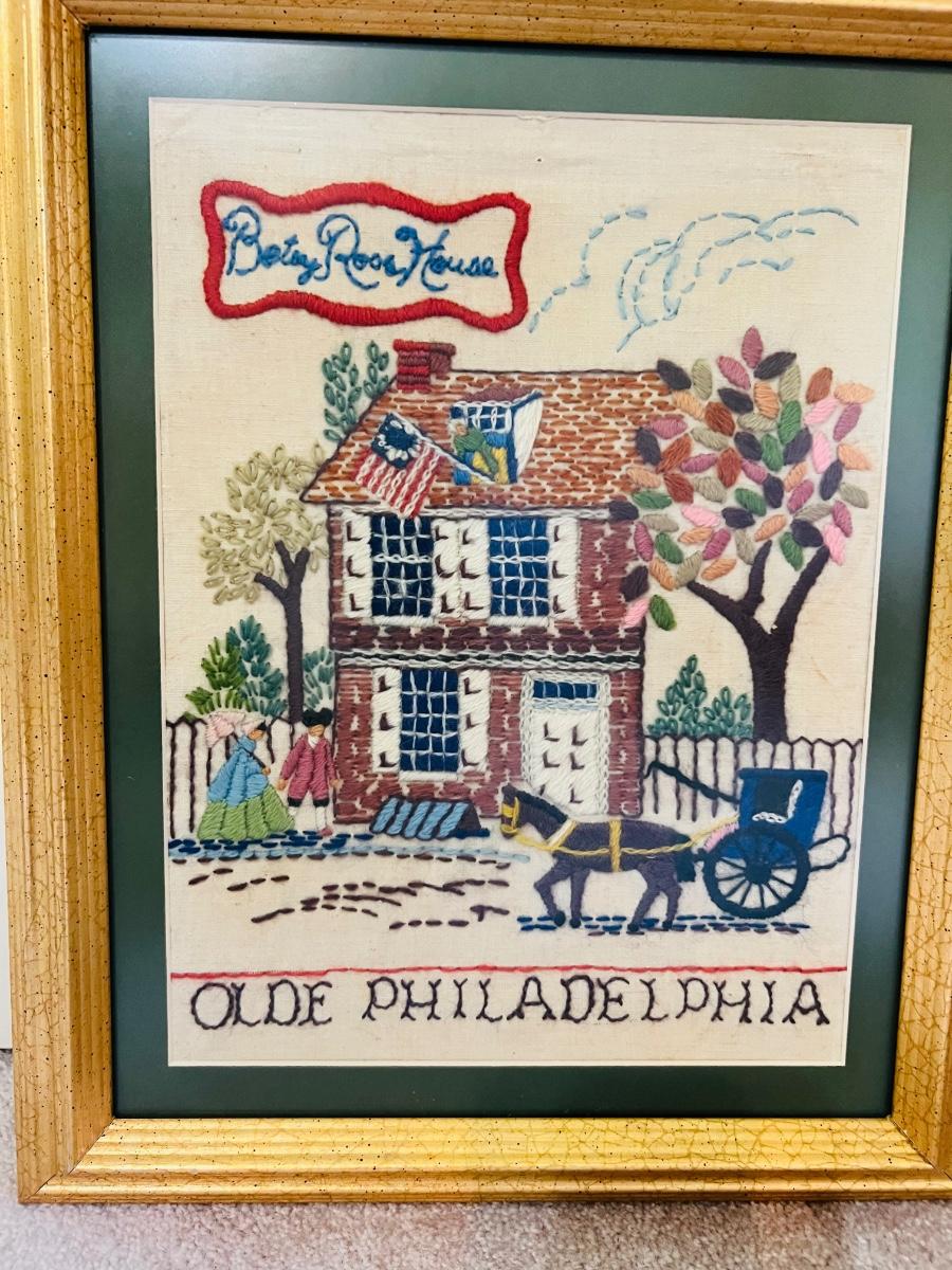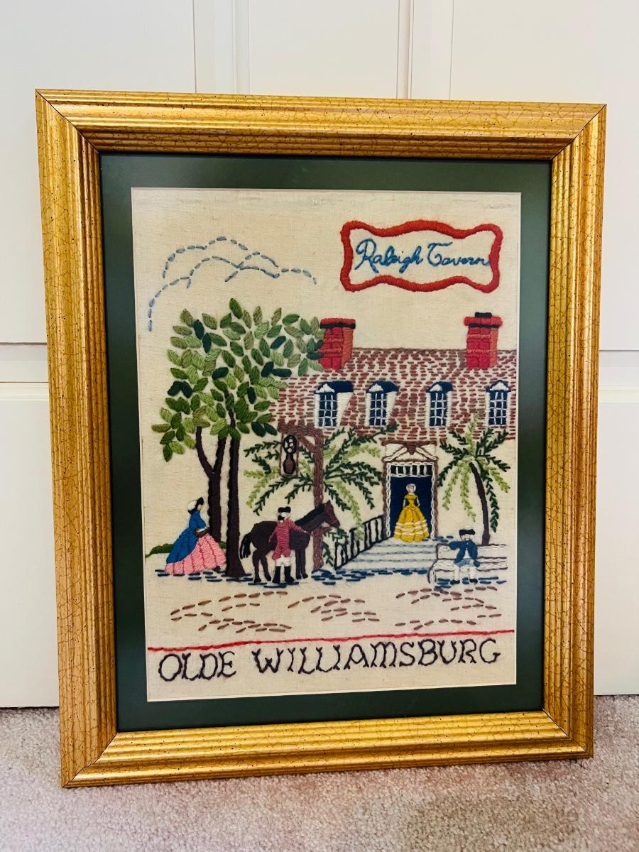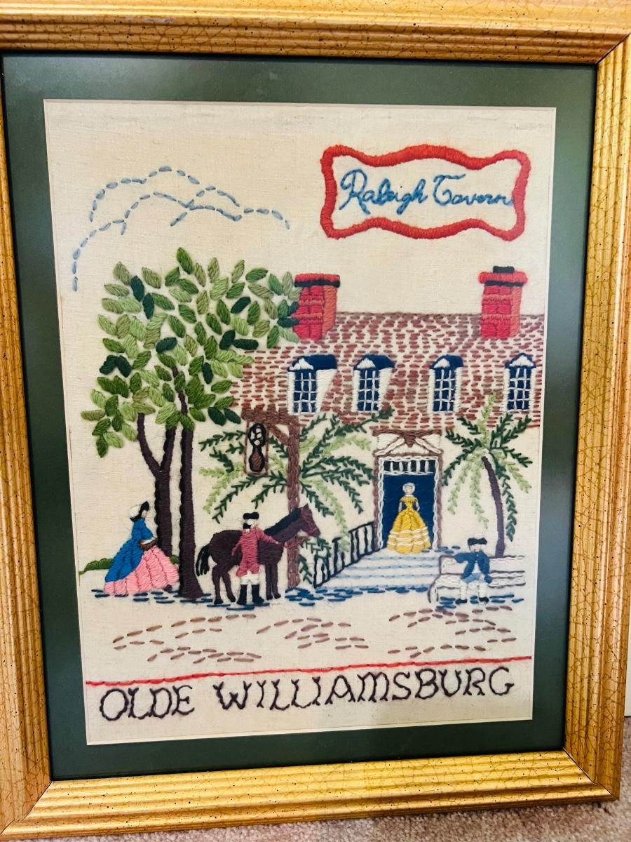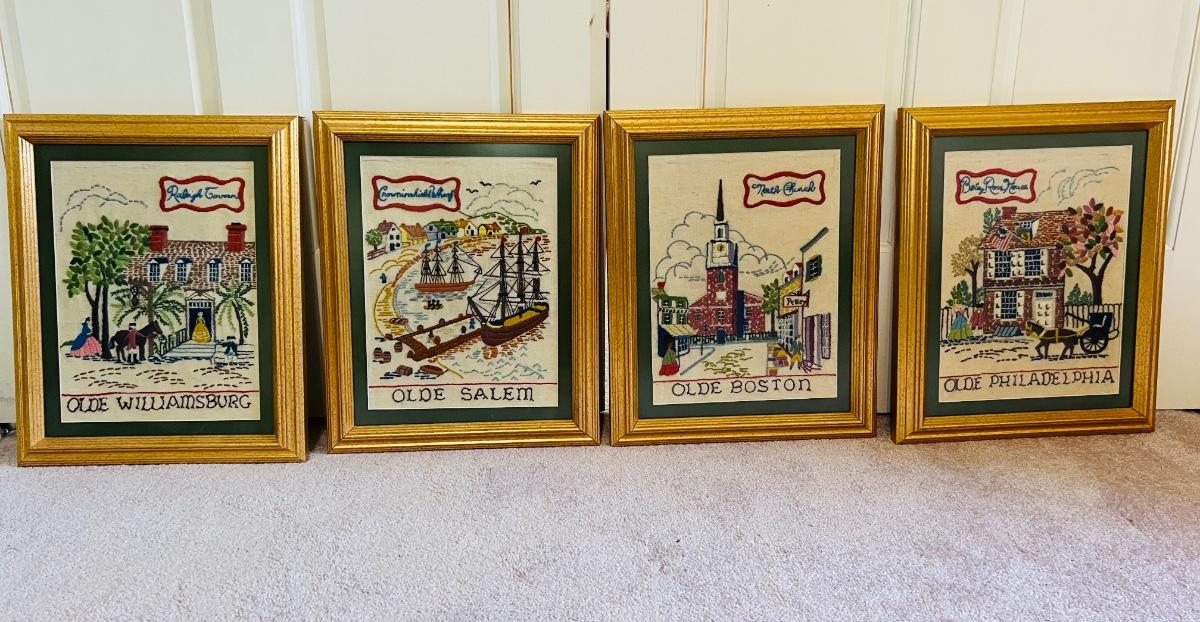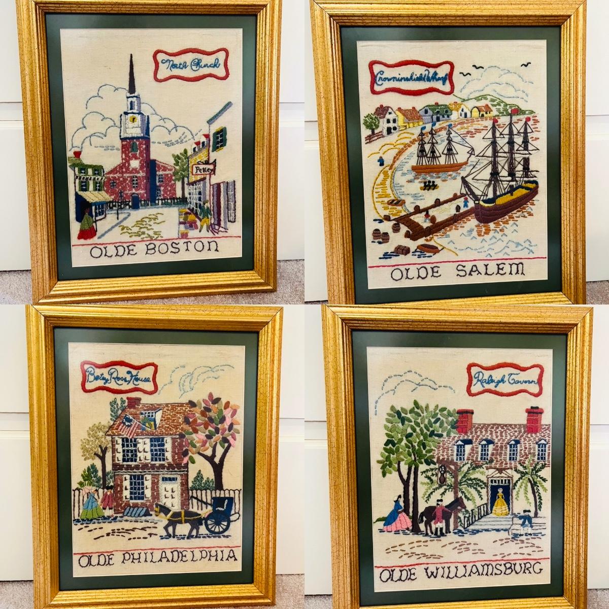 Needle Work Set of 4. These are professionally framed lot includes Olde Salem Crewel Embroidery, North Olde Boston , Old Philadelphia Betsy, Ruth’s house and old Williamsburg Raley Tavern