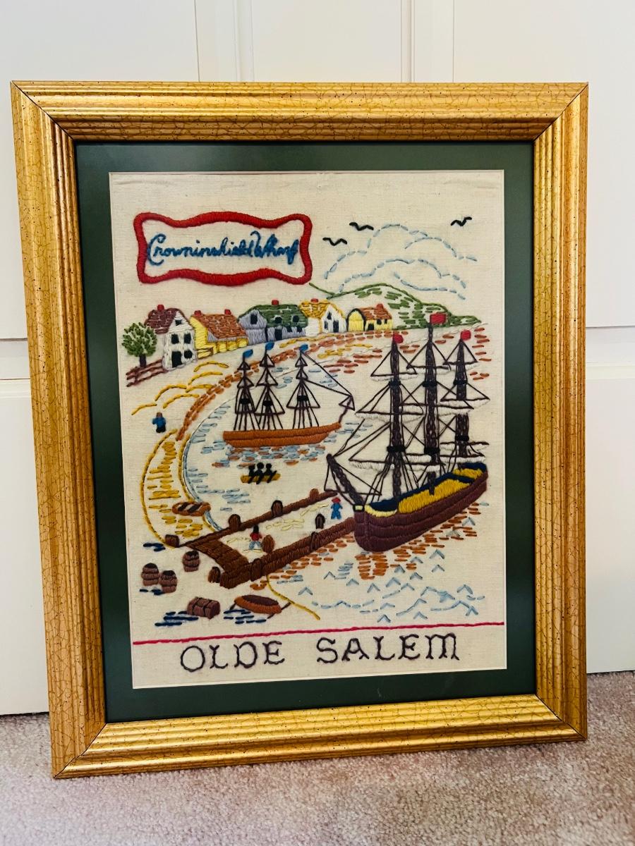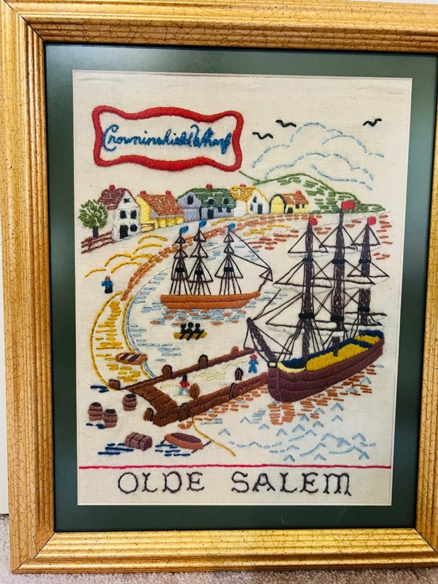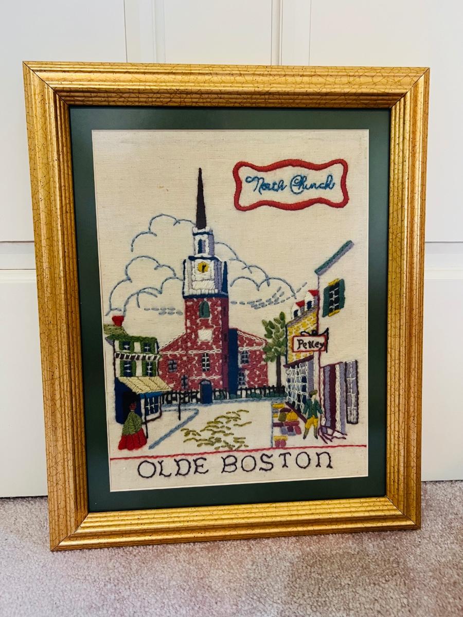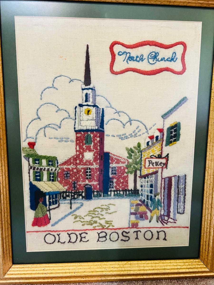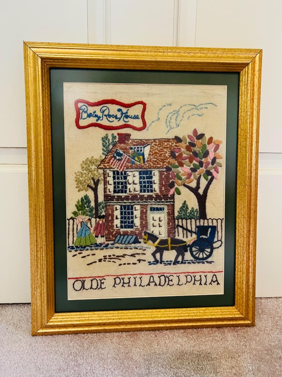 Needle Work Set of 4. These are professionally framed lot includes Olde Salem Crewel Embroidery, North Olde Boston , Old Philadelphia Betsy, Ruth’s house and old Williamsburg Raley Tavern