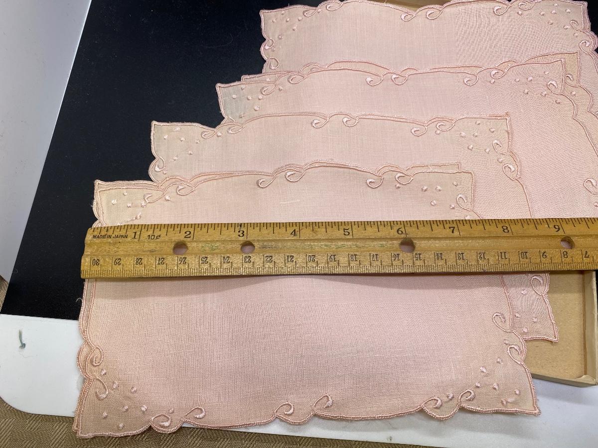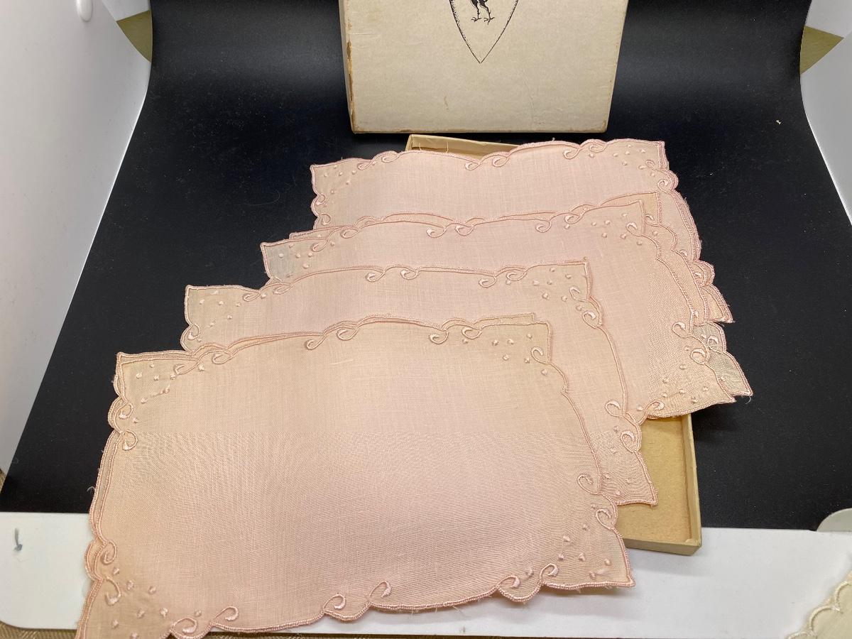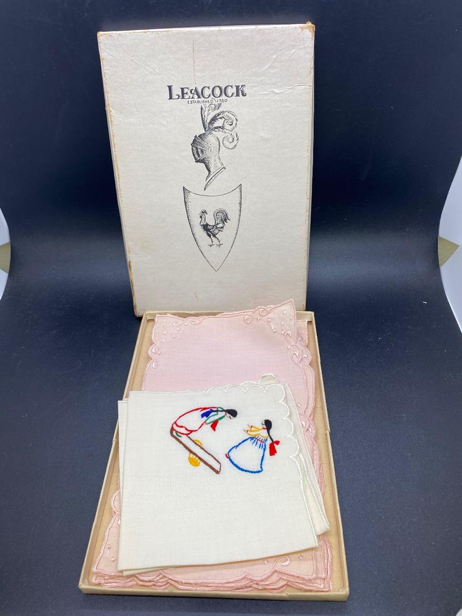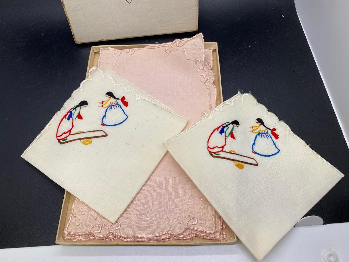 Vintage embroidered linens. Two different styles. Believe they are all considered cocktail napkins from looking online. There are two white with embroidered people on them. The pink ones are from Leacock, in their original box, set of 8. They look unused.