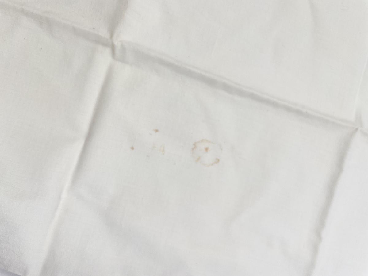 No holes or rips found, does have various staining (some but not all stains shown in photos). Sheet measures approx 81” L x 83” W.