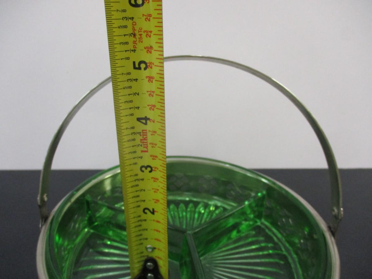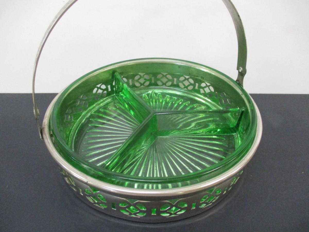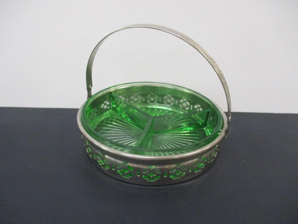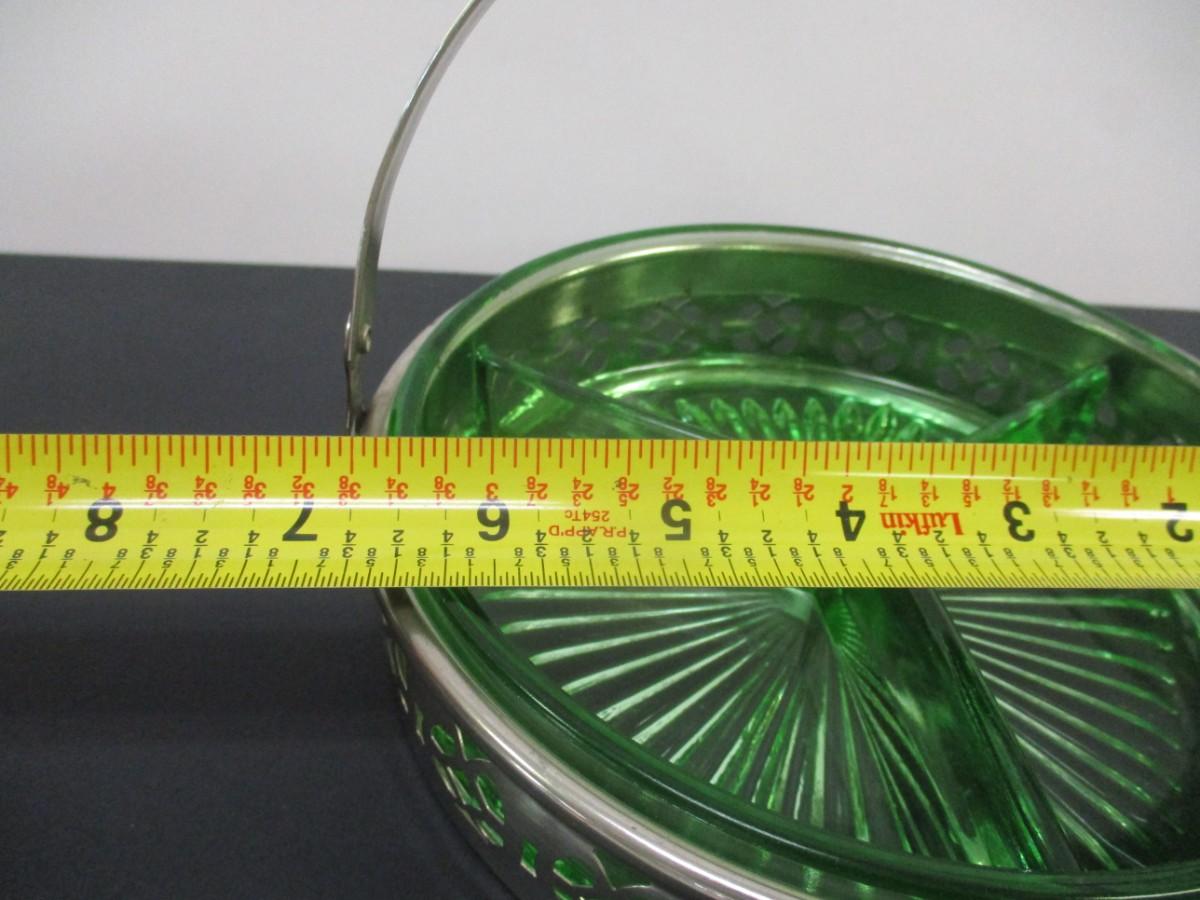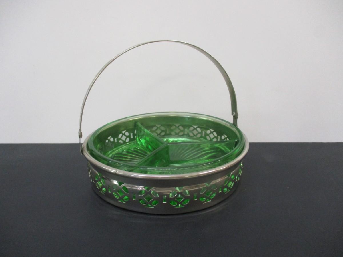 Vintage Emerald Green Divided Glass Dish With Reticulated Metal Caddy