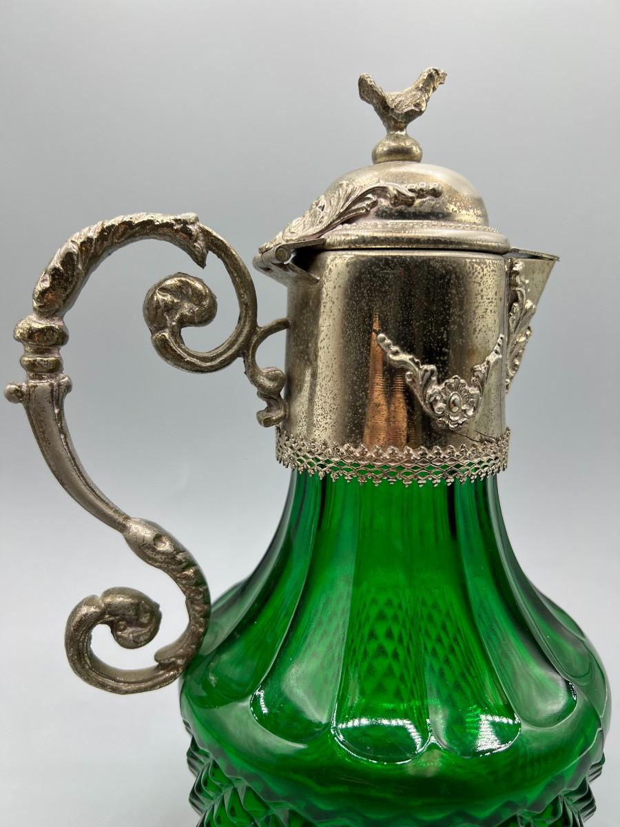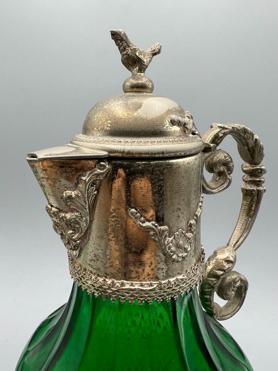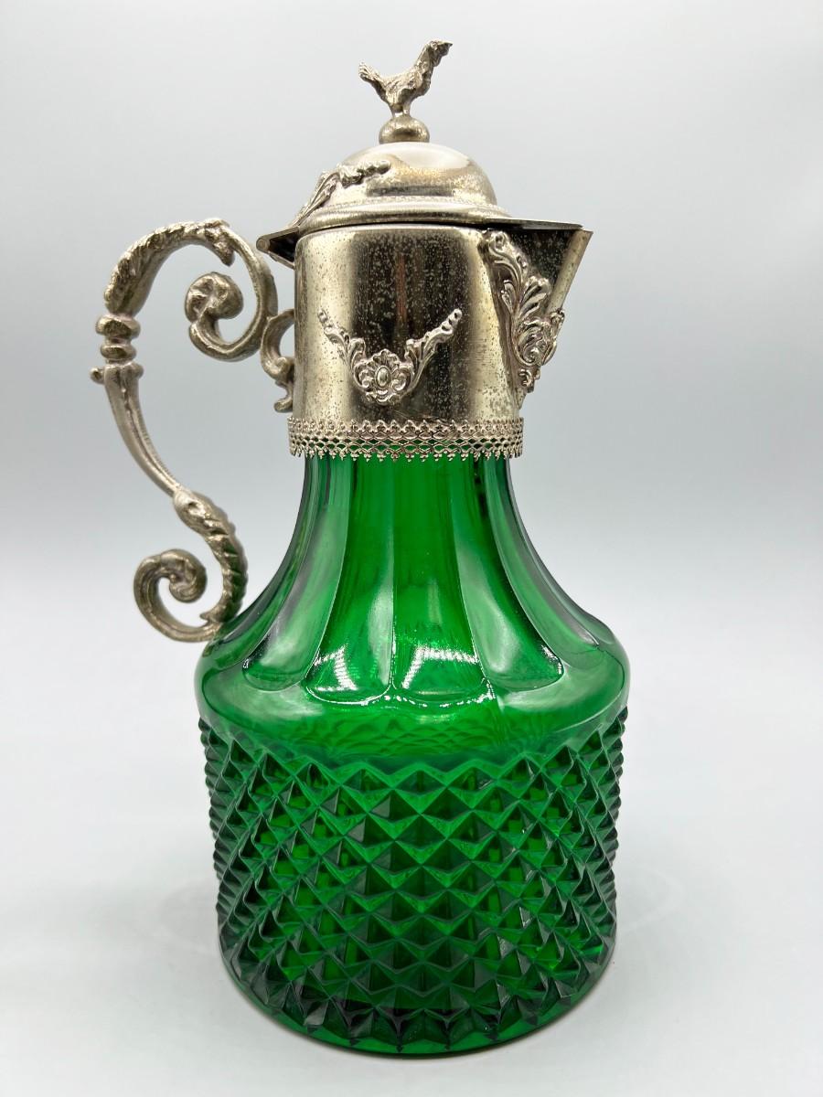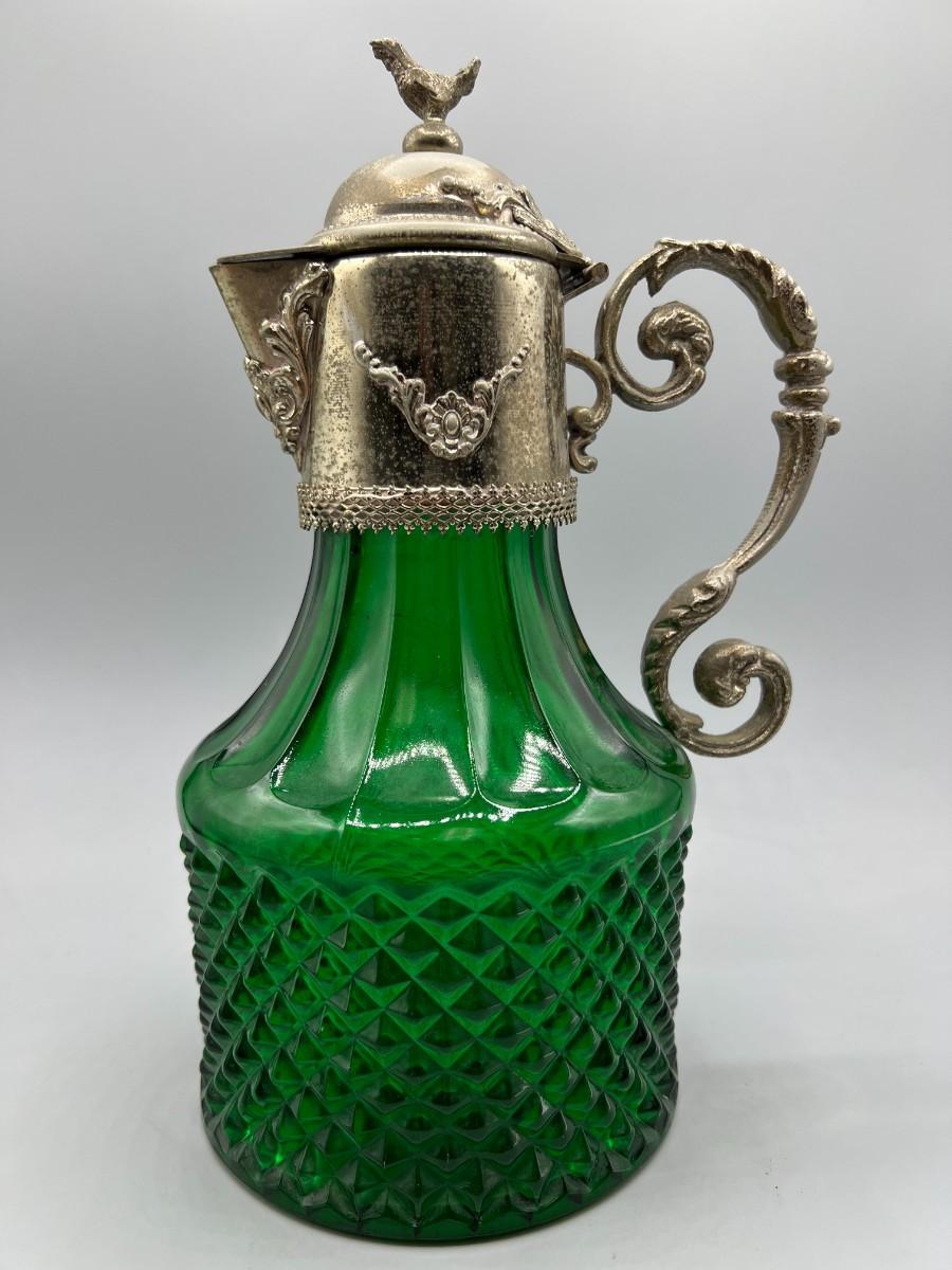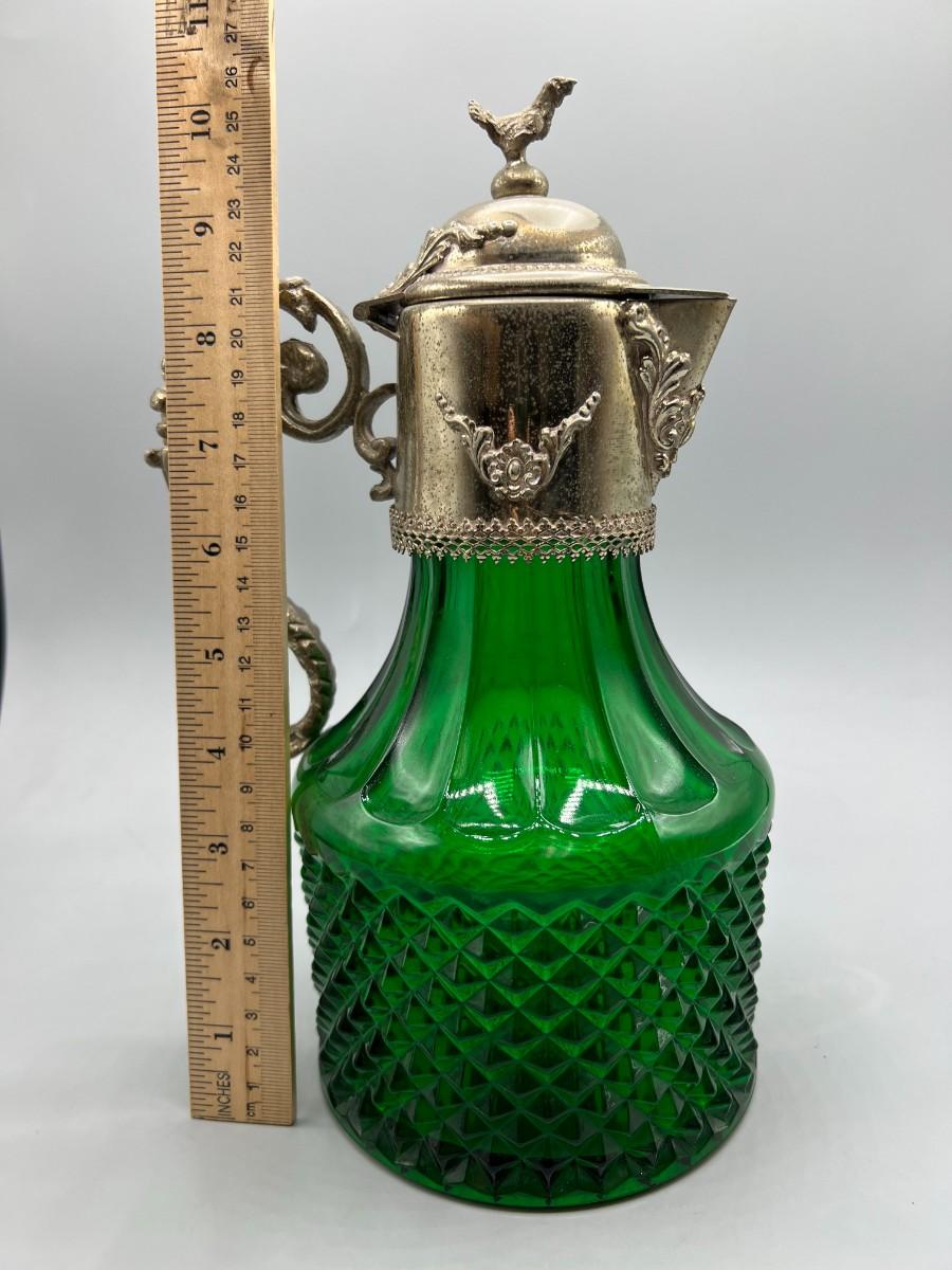 Vintage Emerald Green Glass & Silver Plate Diamond Pattern Decanter Pitcher