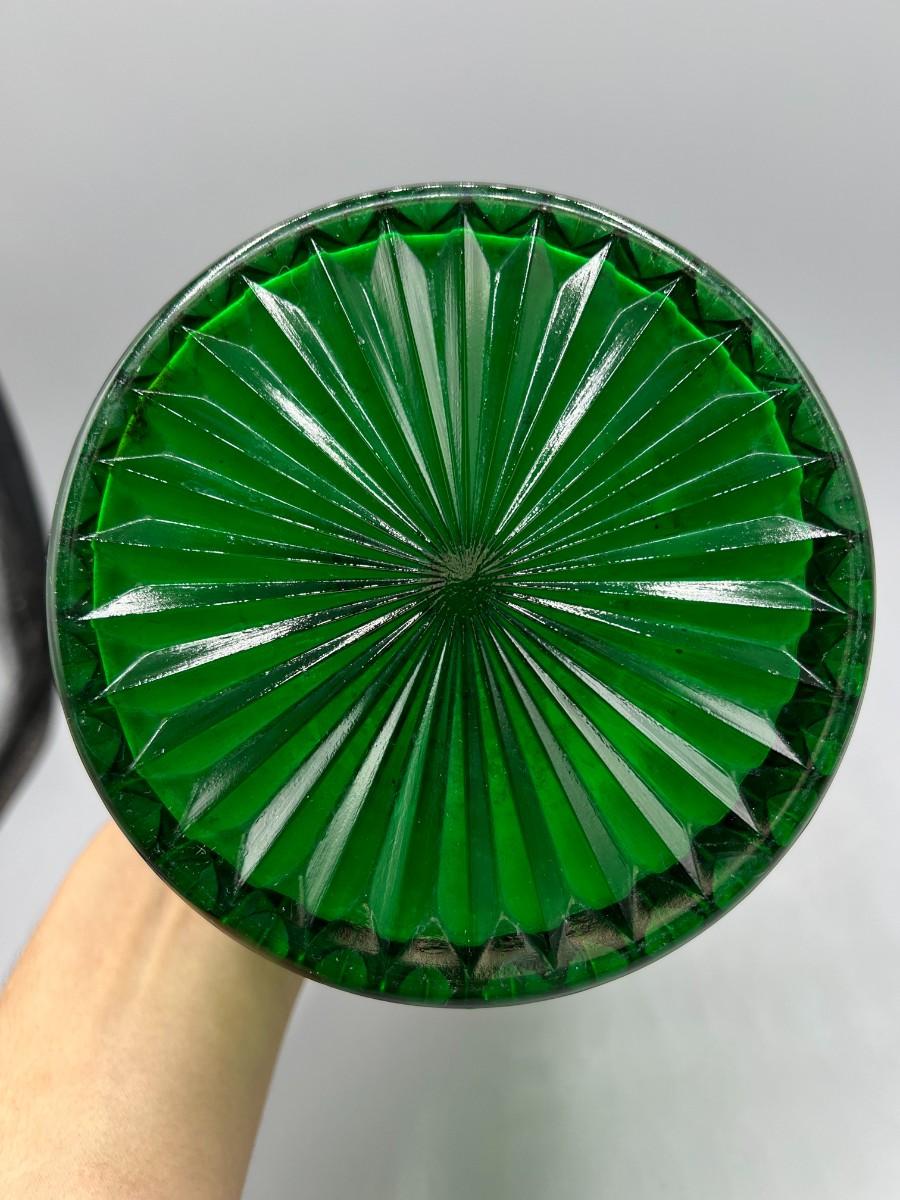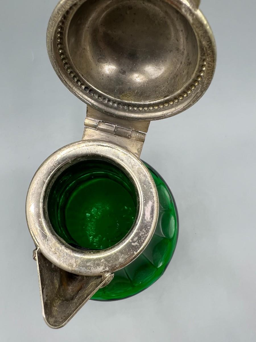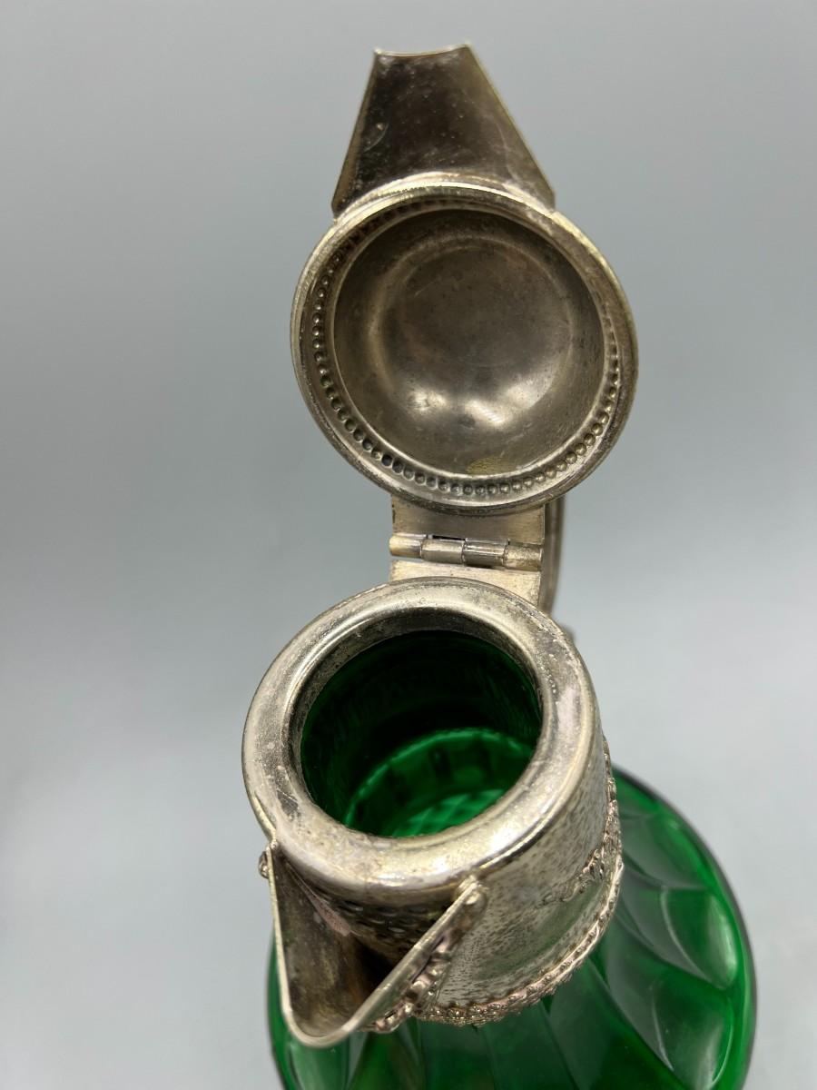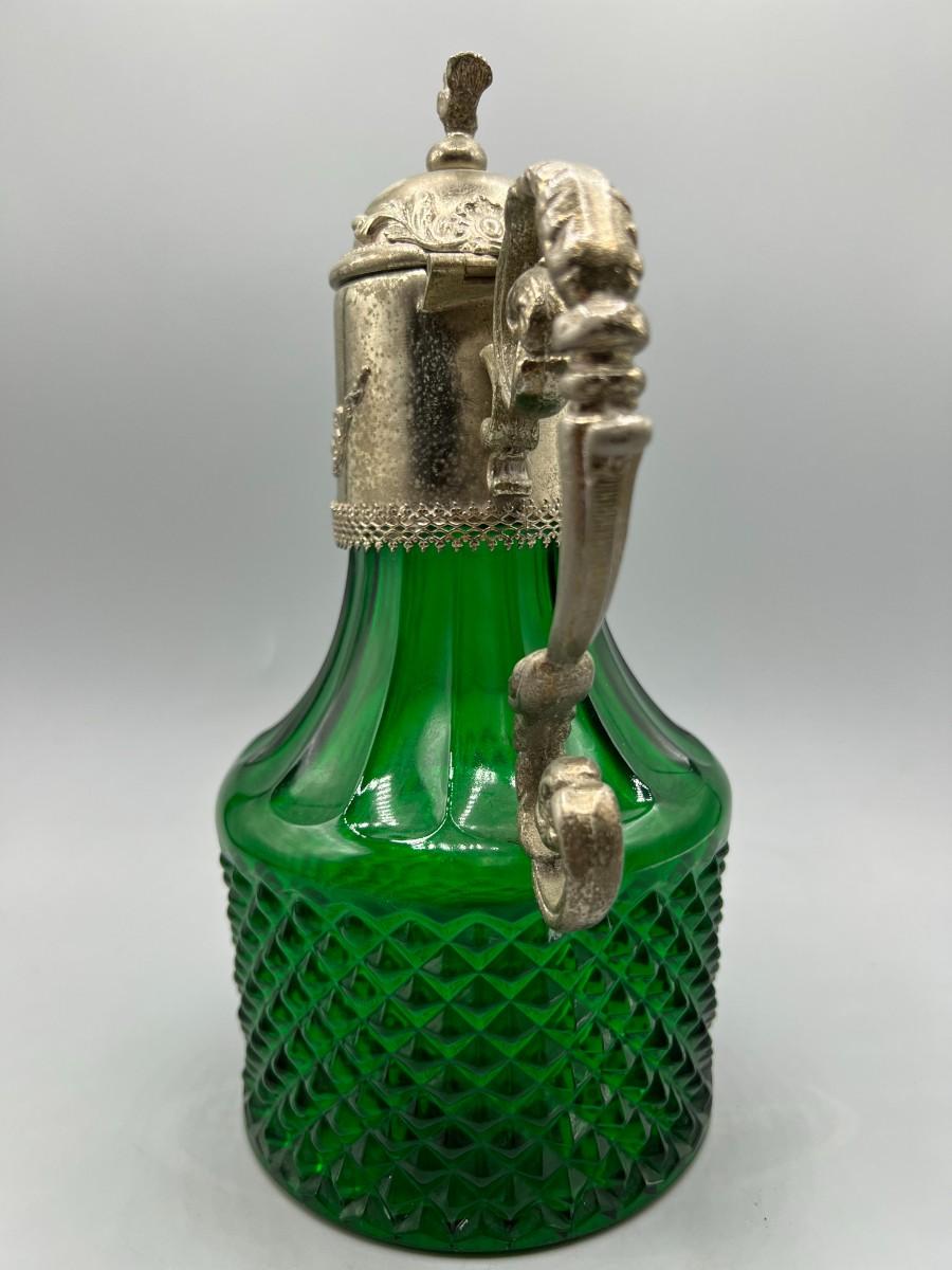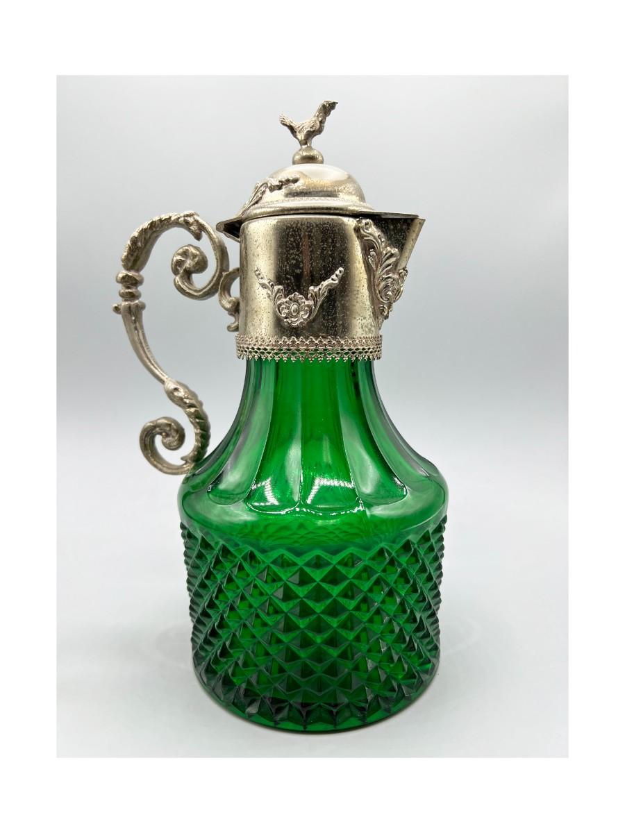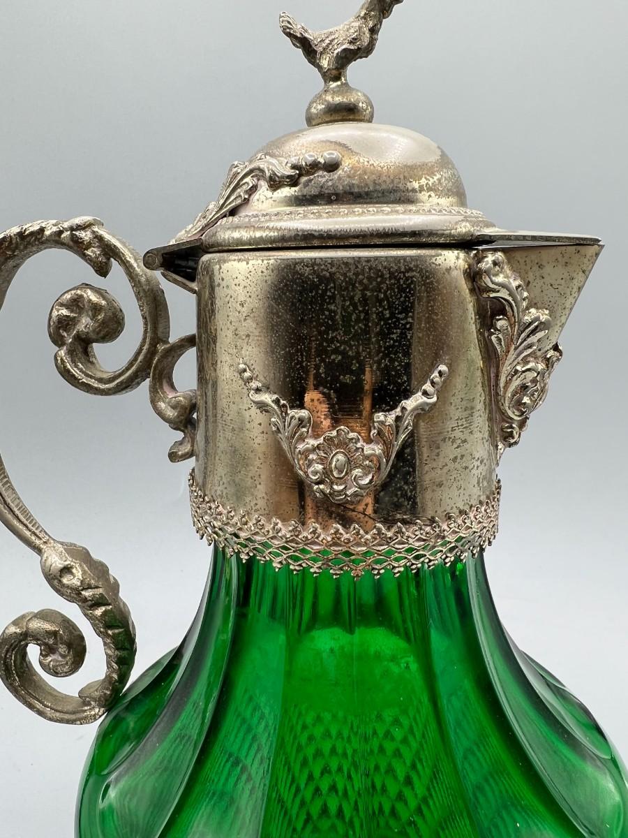 Vintage Emerald Green Glass & Silver Plate Diamond Pattern Decanter Pitcher