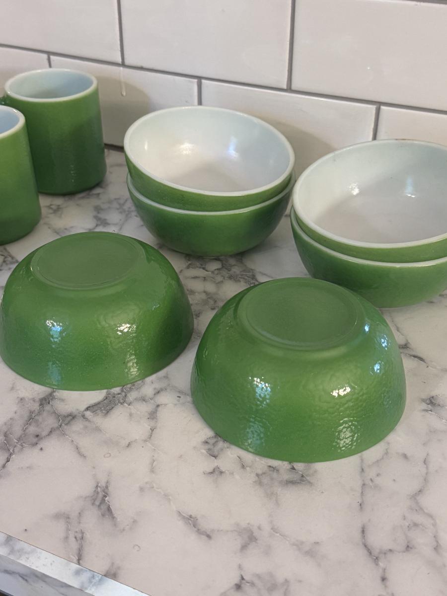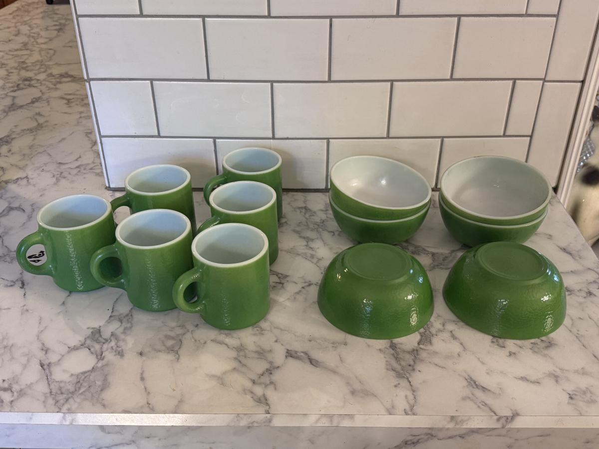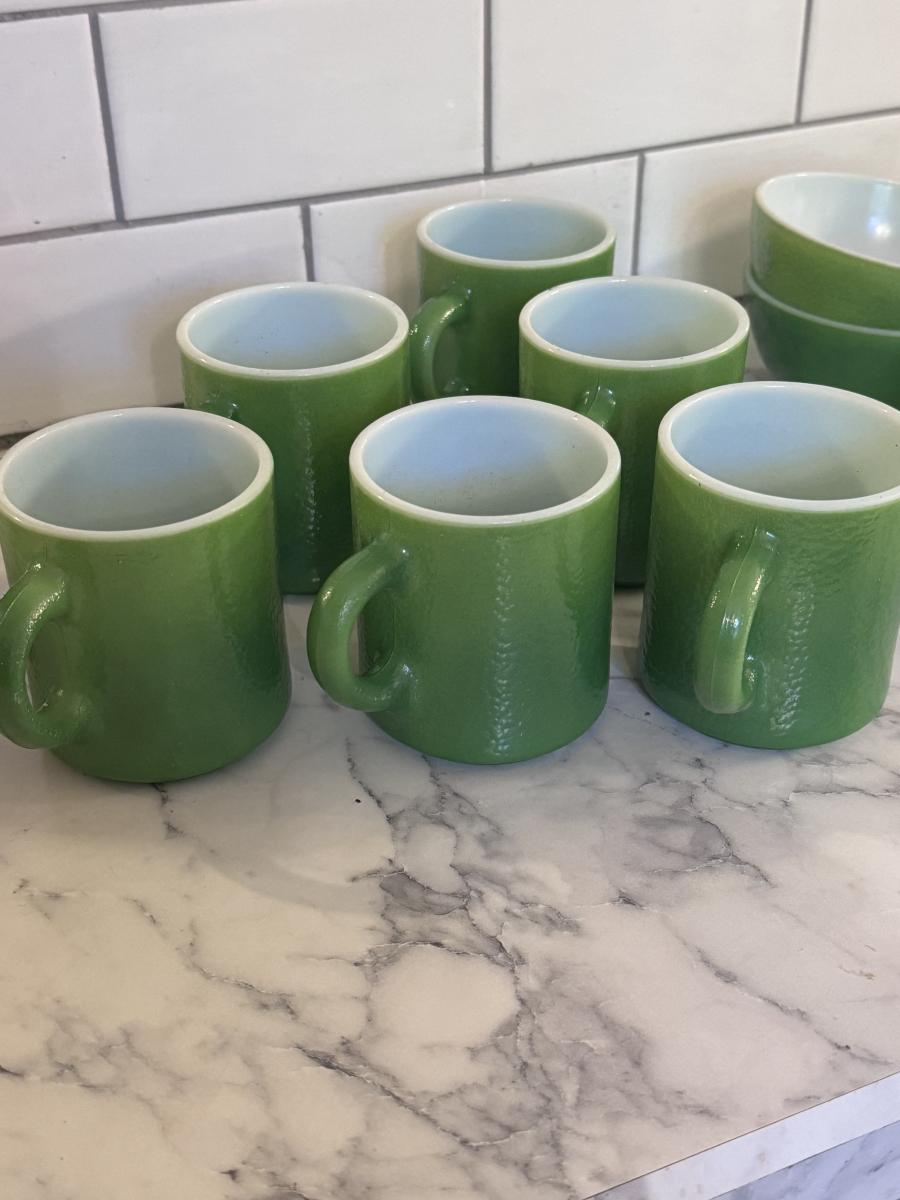 Vintage Emerald Green Milk Glass Mugs and Bowls