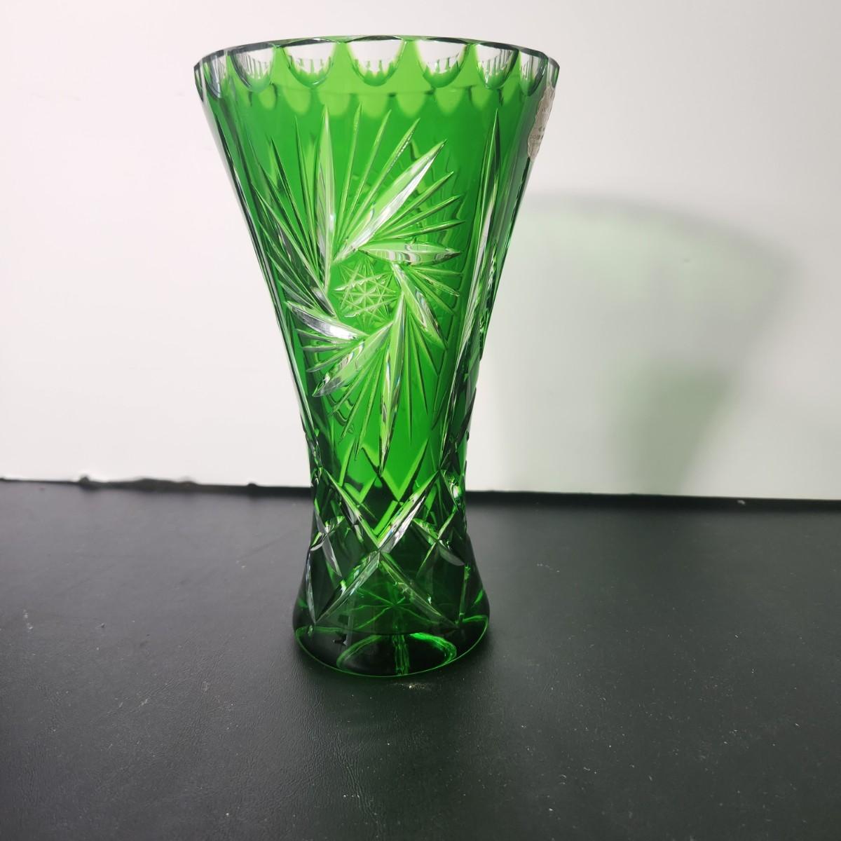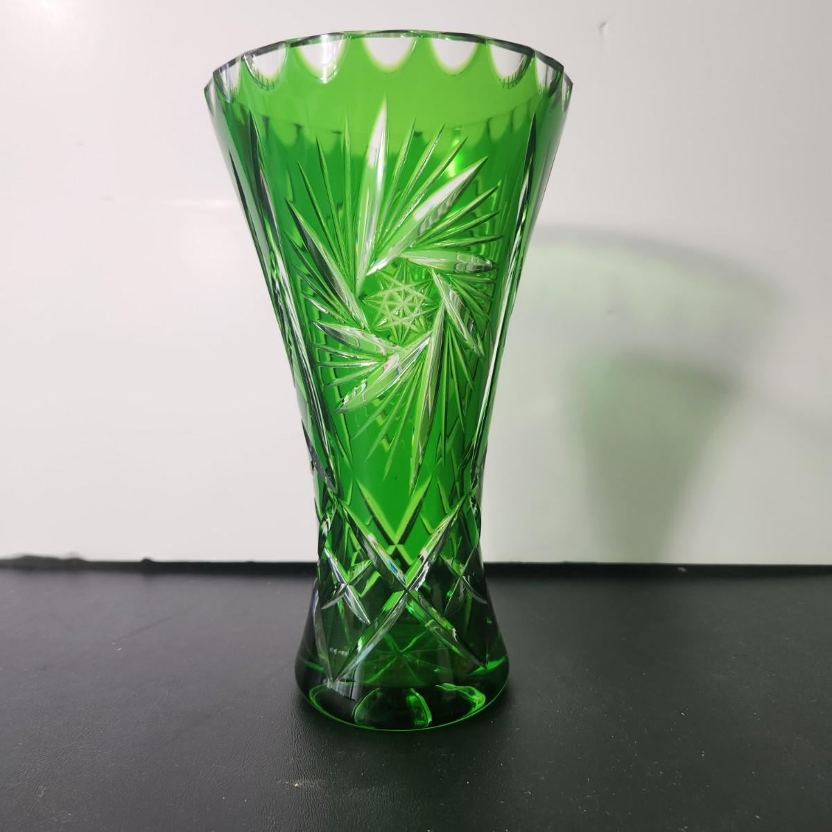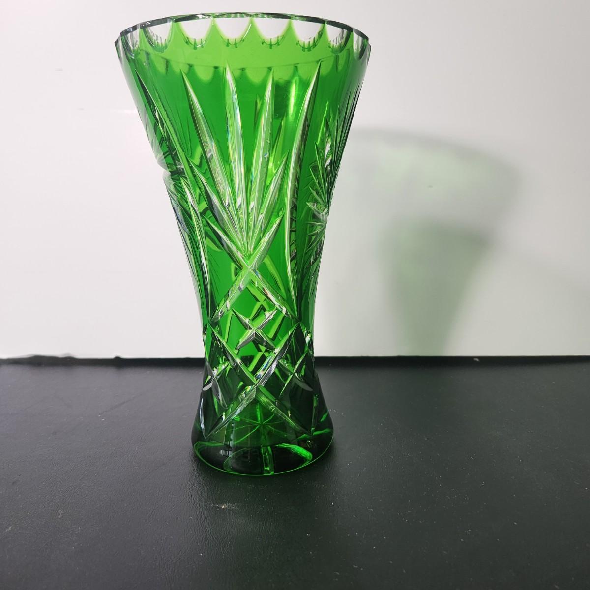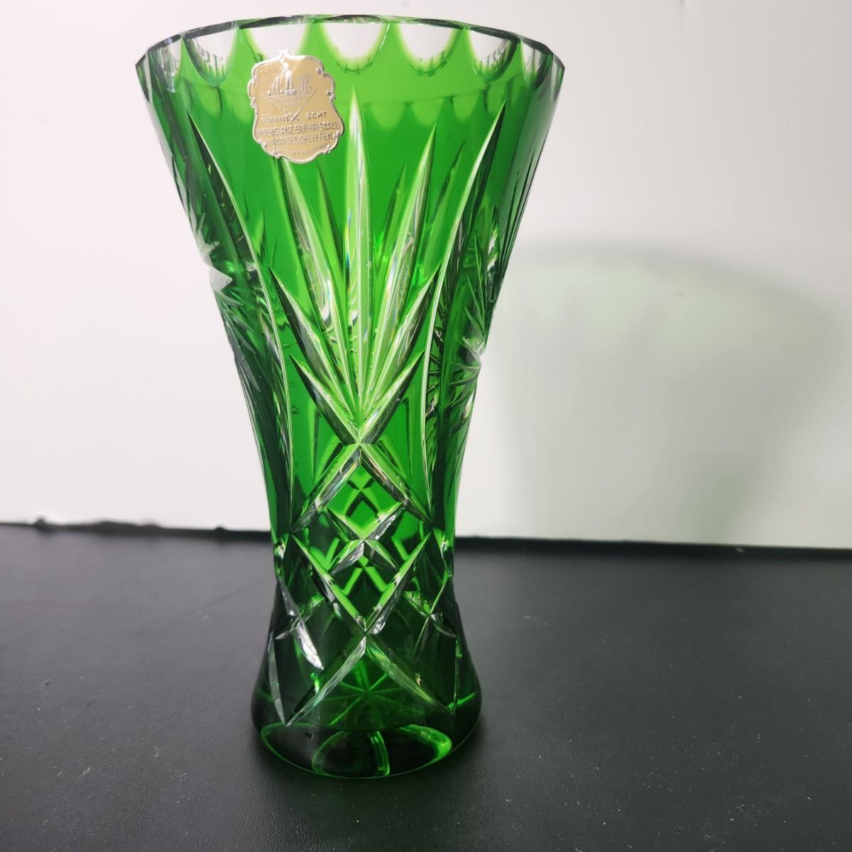 Vintage Emerald Green Vase Cut to Clear  Glass Hochglanz Bleikristall 8.25"