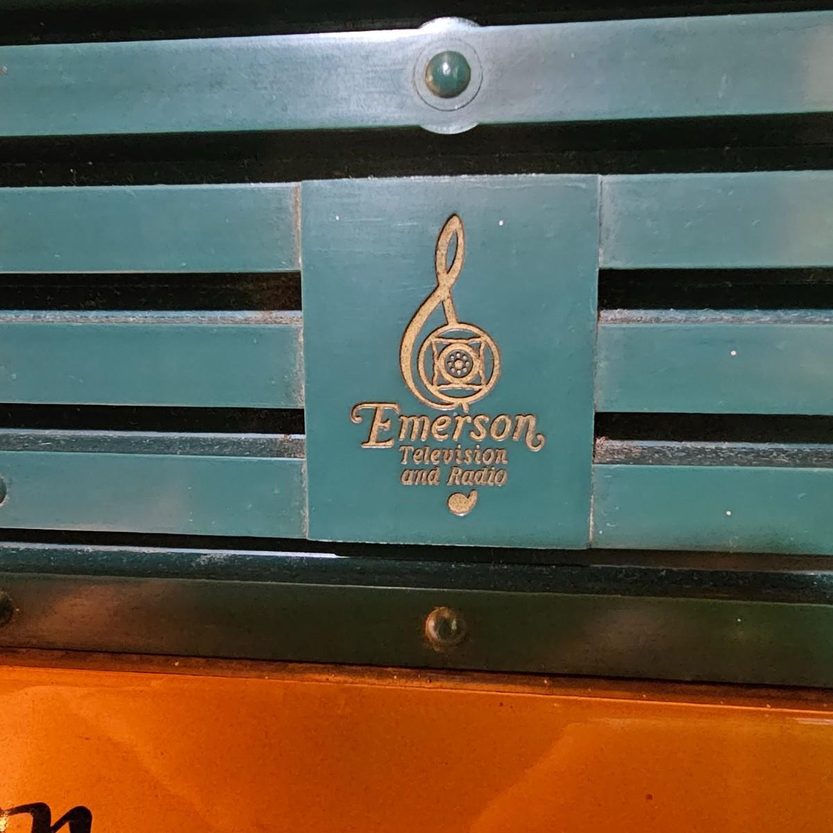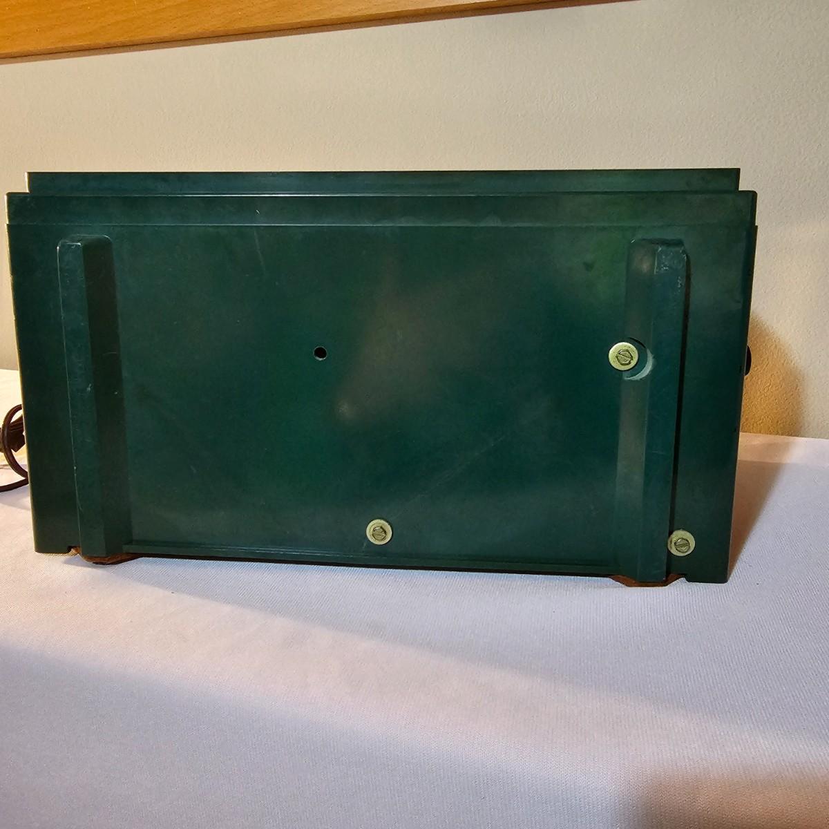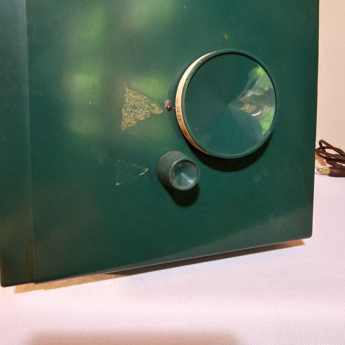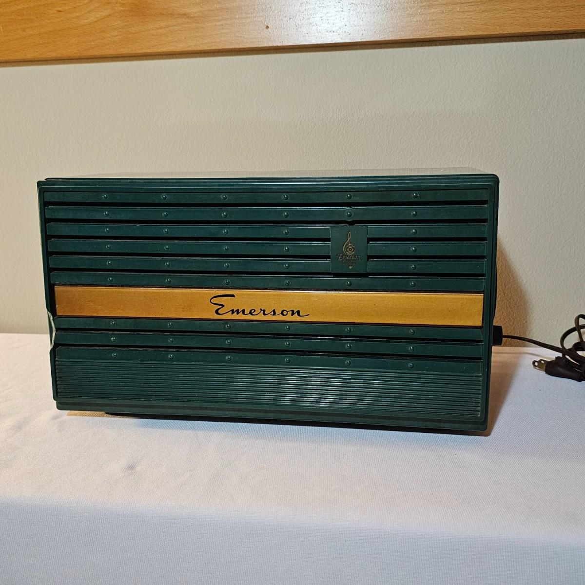One Emerson AM table style radio in green plastic. On/off button, tuning dial on one end. Tube style radio, unit powered on when plugged in. Measures 13.5" x 7" x 8"H. Case has some scratches and one chip out of the left front, see photos for details. Shipping available.