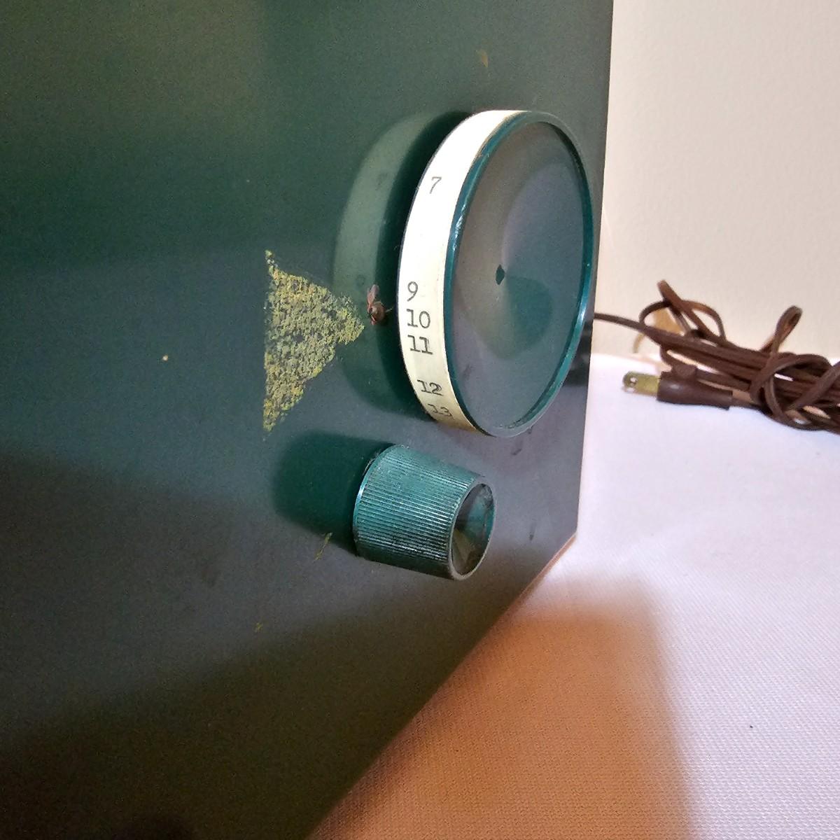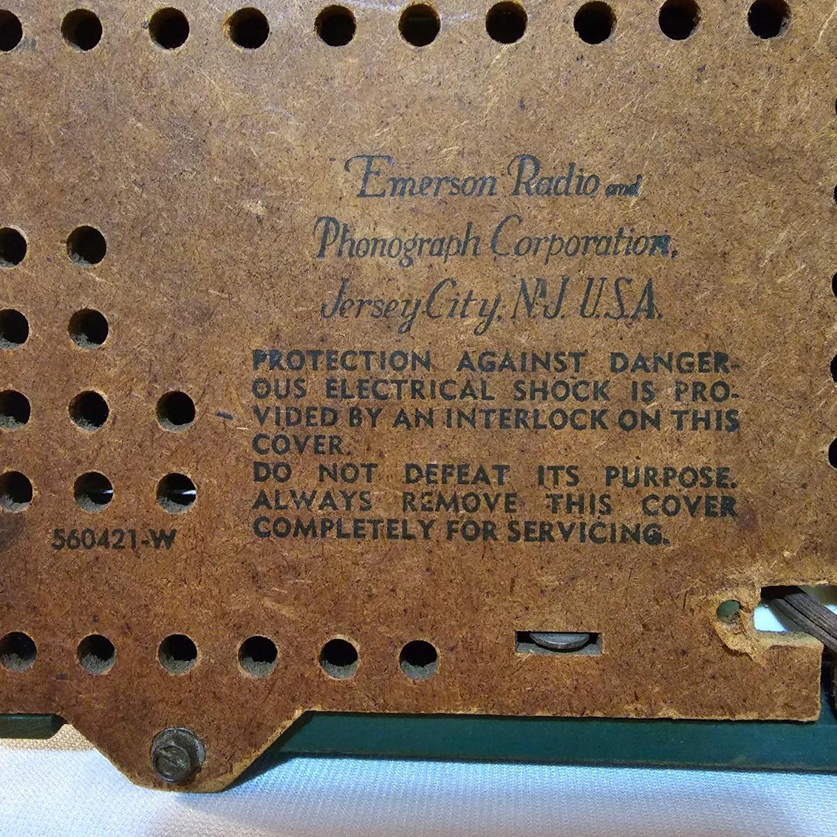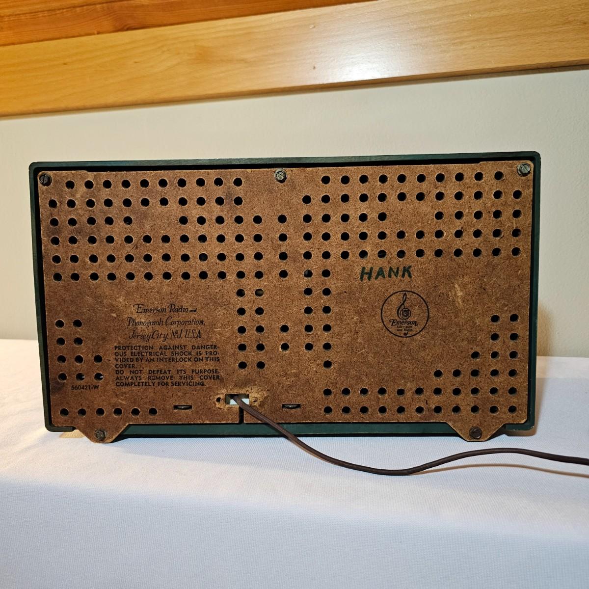 One Emerson AM table style radio in green plastic. On/off button, tuning dial on one end. Tube style radio, unit powered on when plugged in. Measures 13.5" x 7" x 8"H. Case has some scratches and one chip out of the left front, see photos for details. Shipping available.
