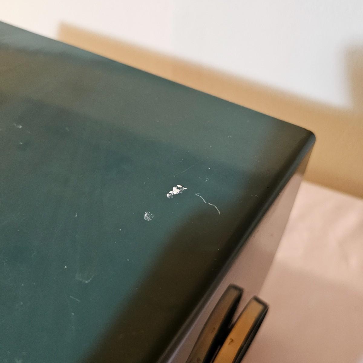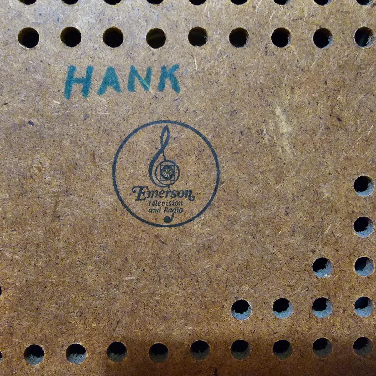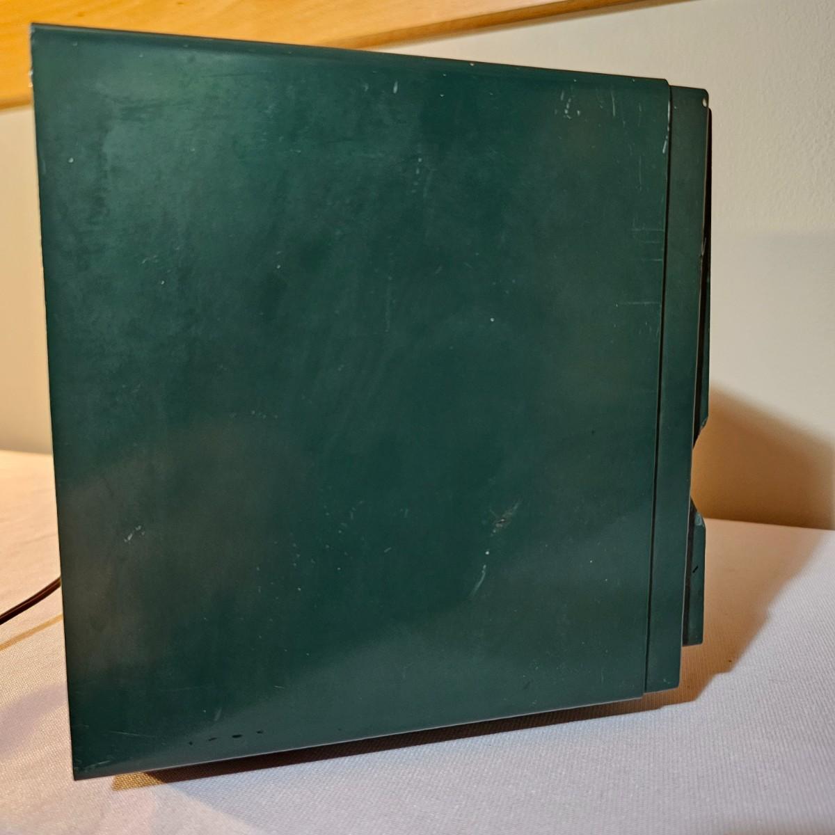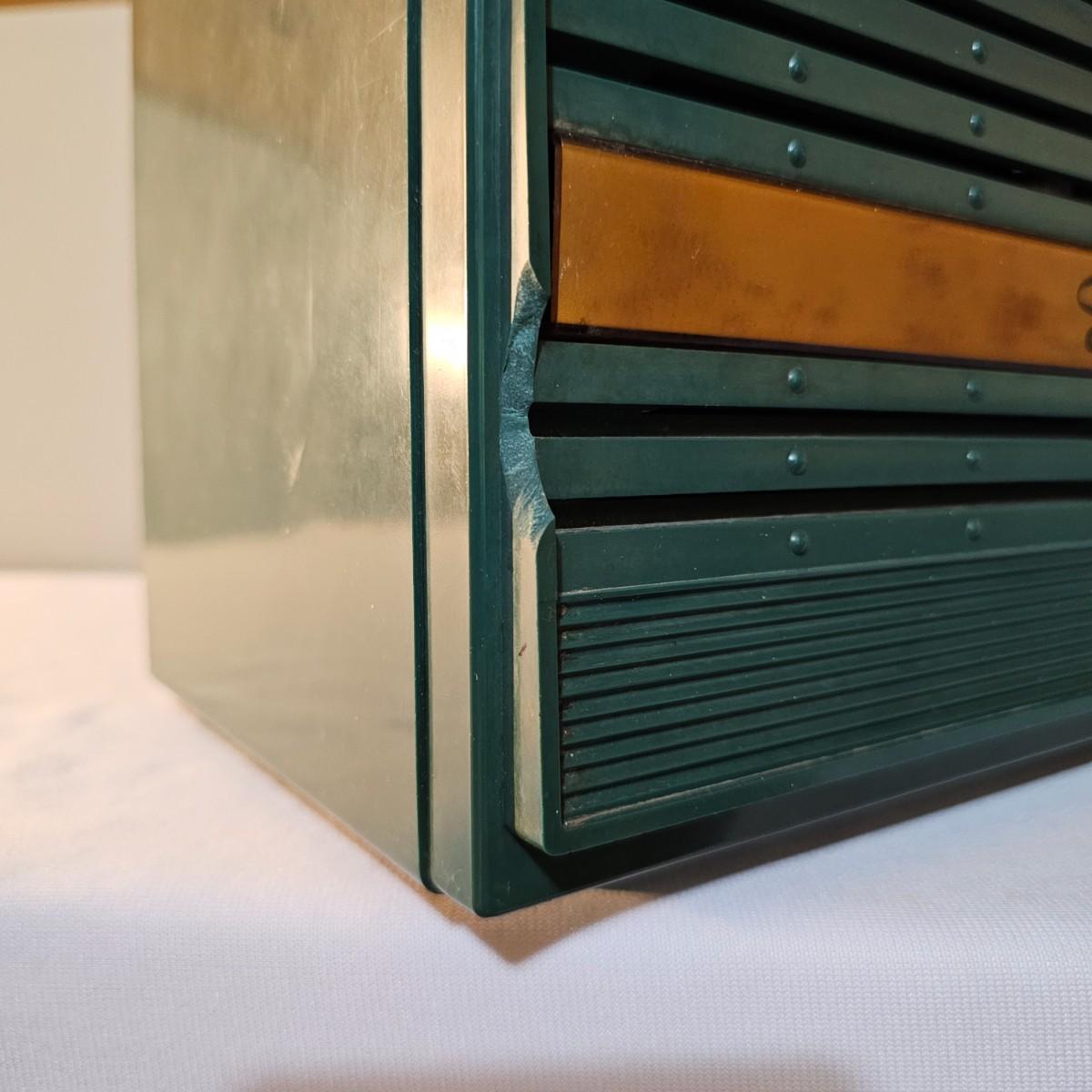 One Emerson AM table style radio in green plastic. On/off button, tuning dial on one end. Tube style radio, unit powered on when plugged in. Measures 13.5" x 7" x 8"H. Case has some scratches and one chip out of the left front, see photos for details. Shipping available.