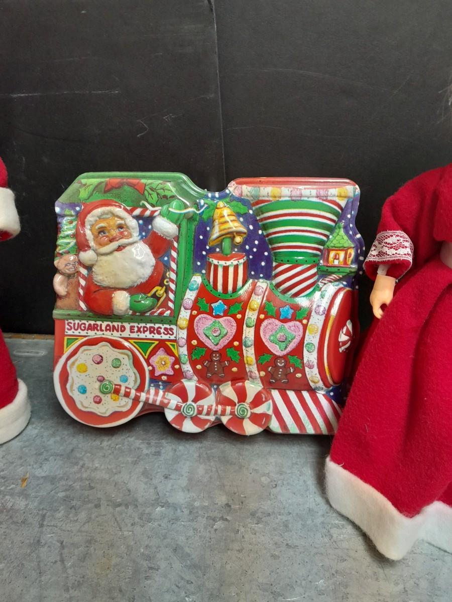 Vintage Empire Blo Mold electric Candle with handmade Mr. and Mrs. Claus. Mrs. clause is made from a dish soap bottle! Includes handmade angels, two stockings, and a train shaped plastic cookie container.