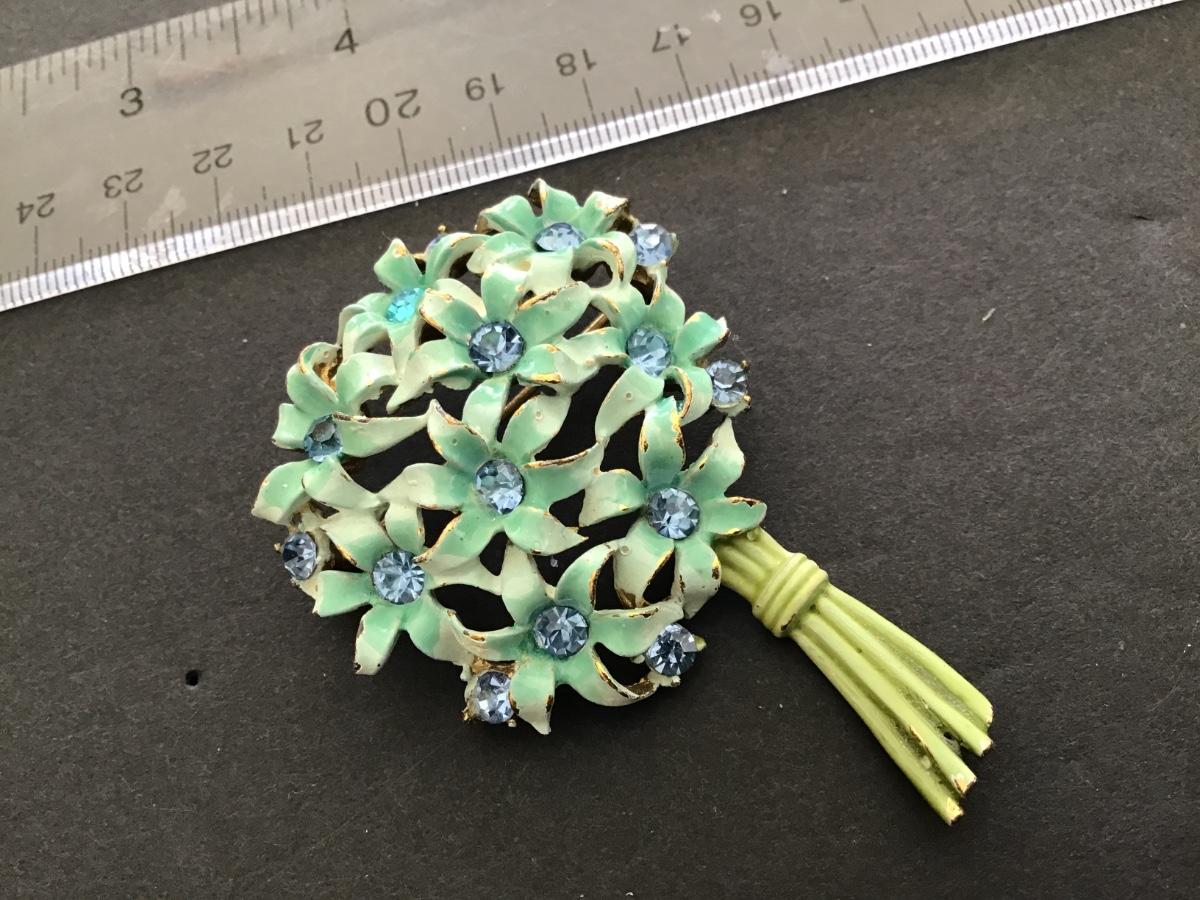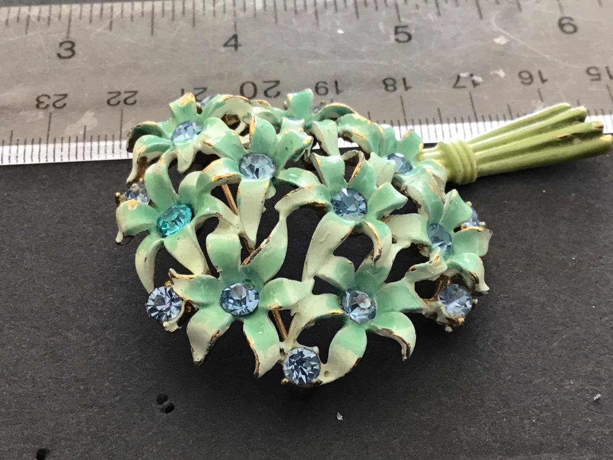 Vintage Enamel Blue Rhinestone Bouquet Brooch