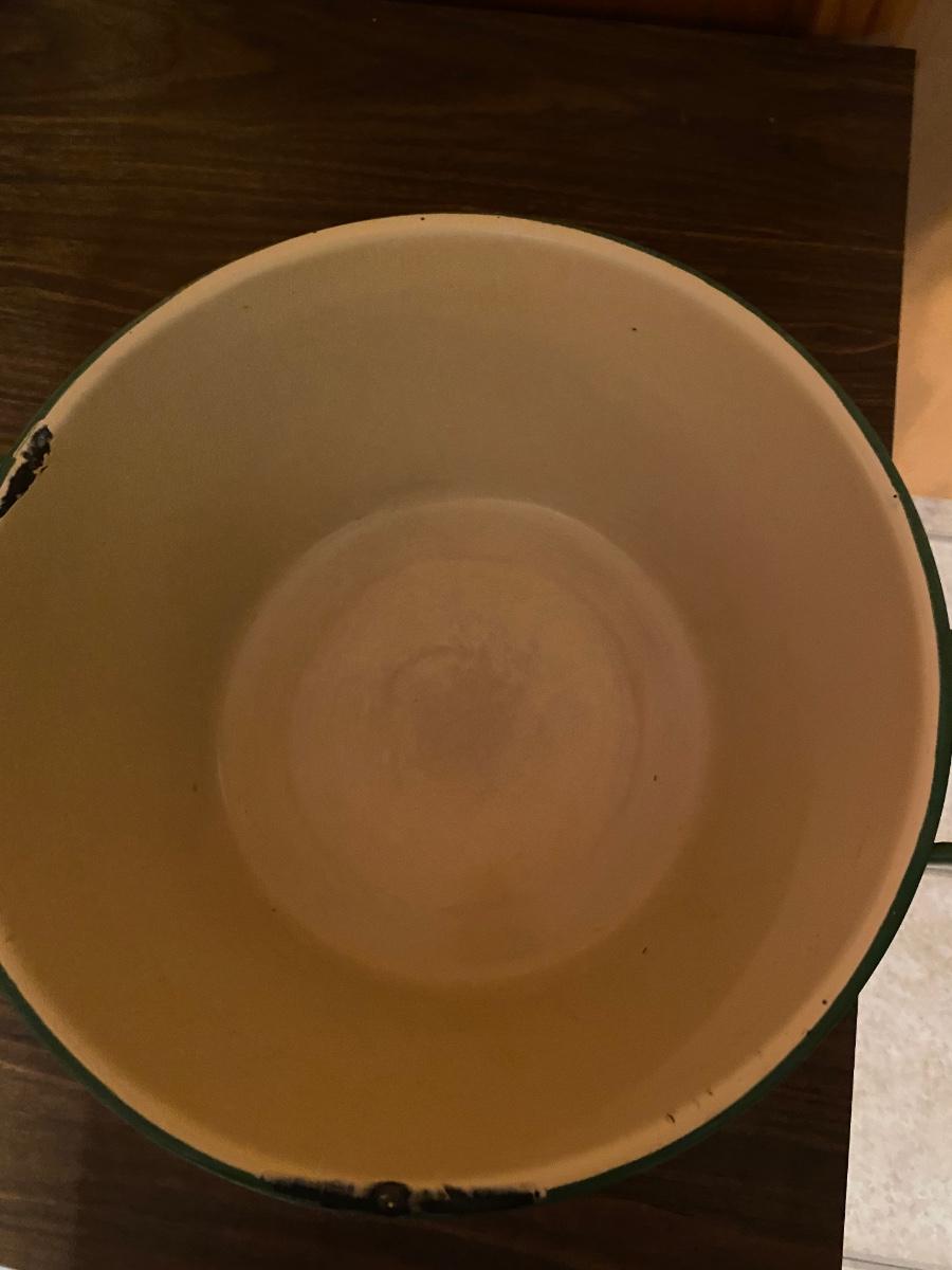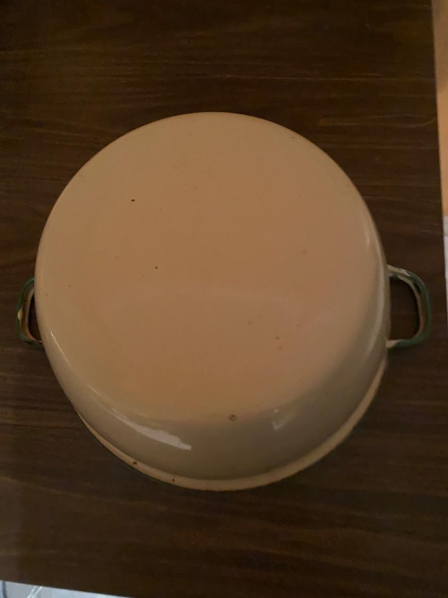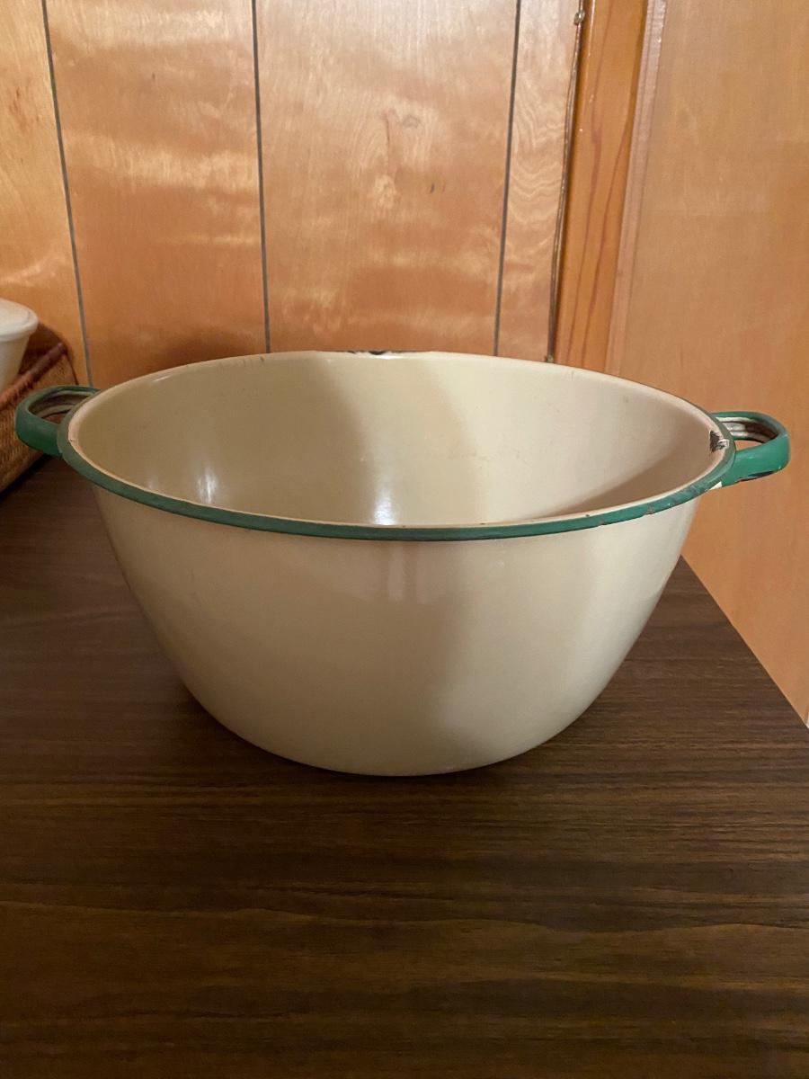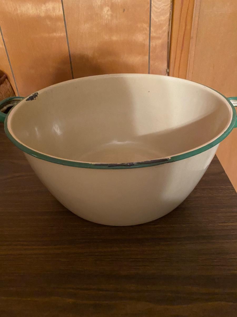 Vintage enamel bowl with handles. Has a little rust; otherwise very good condition. Approx 12-3/4”w x 6”h