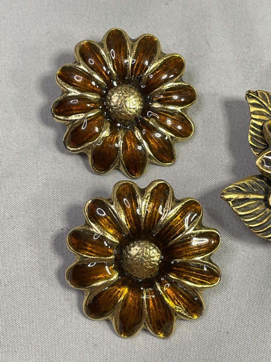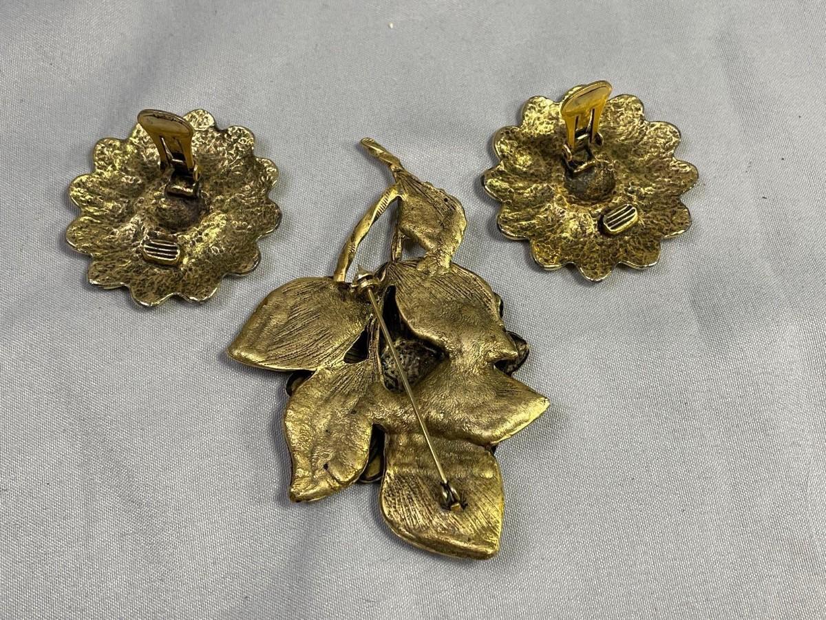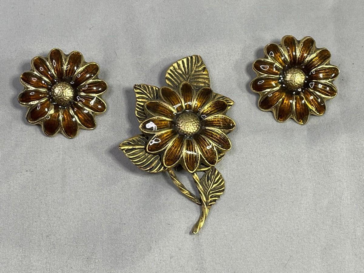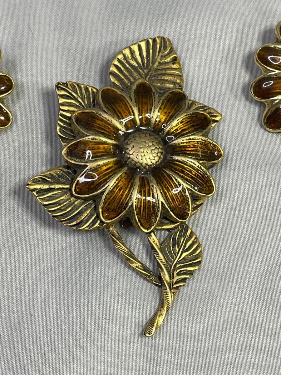 This set is most like 1970s or 1980s based on the clasp of the earrings. The earrings are about 2 inches in diameter and the brooch is about 3.5 inches in length. They are a bronze color metal and highlighted with a deep amber enamel paint.<br />