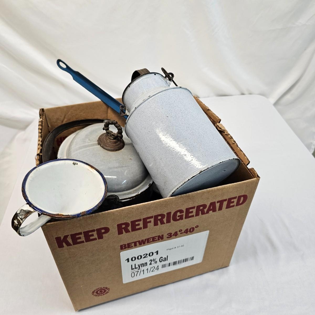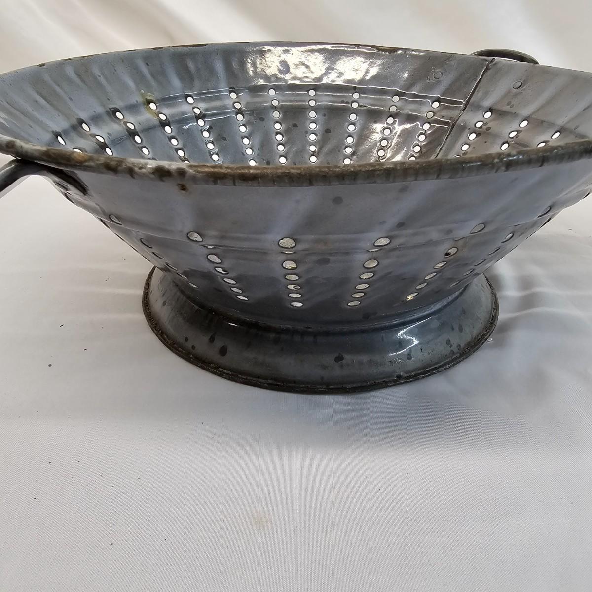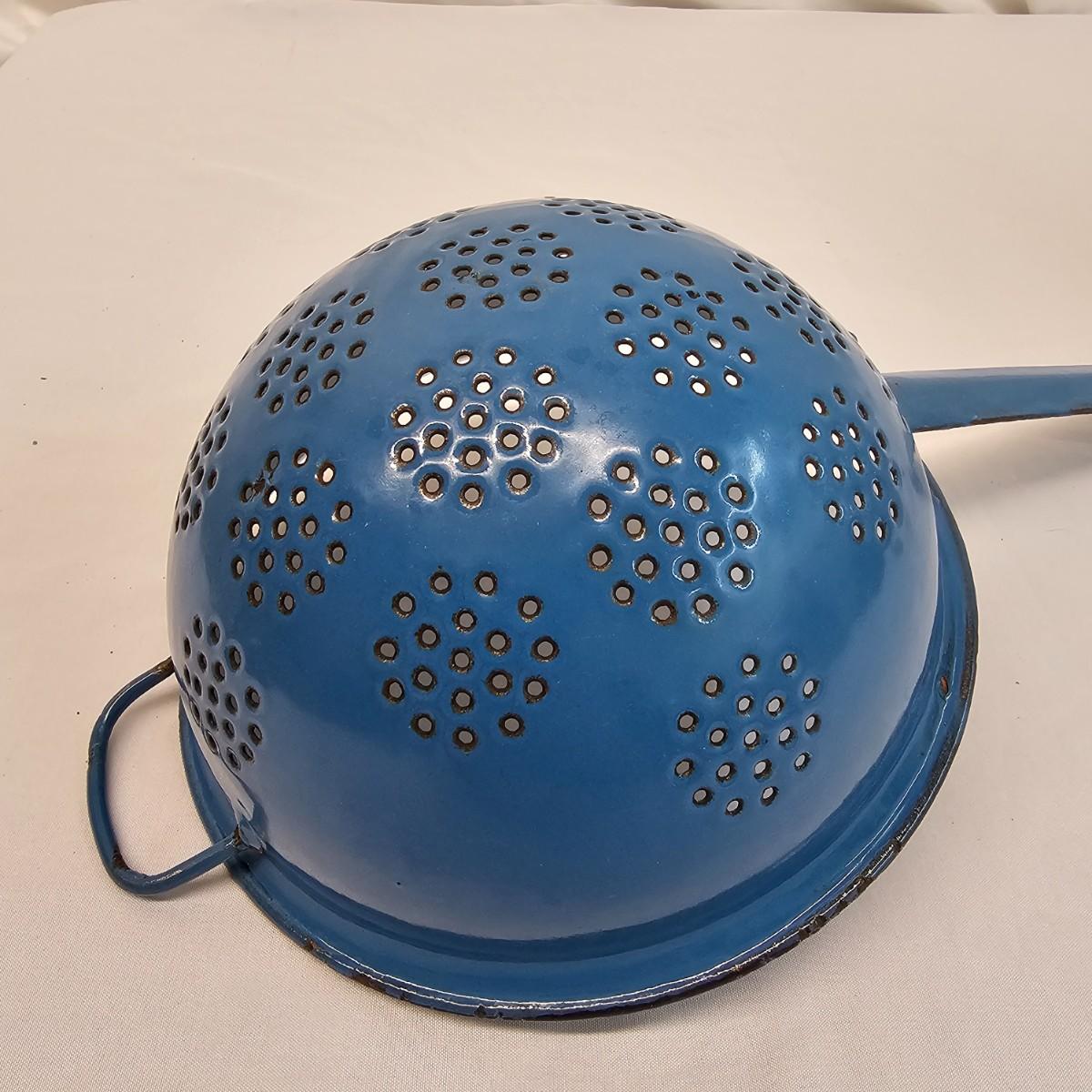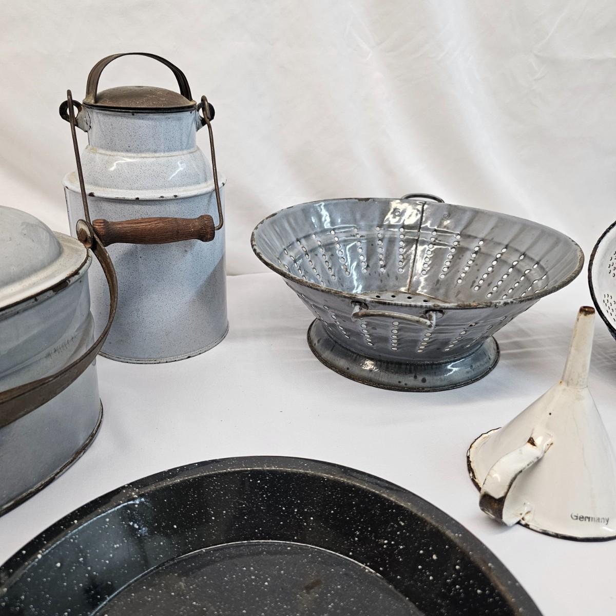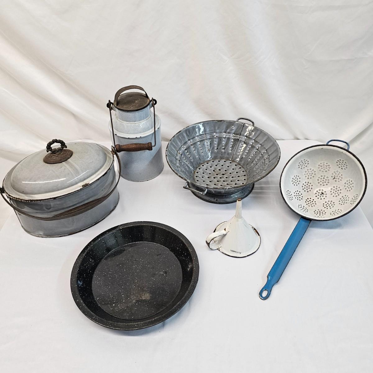 Several pieces of older enameled metal kitchen items. A colander, a pie plate, funnel, handled strainer, a lidded milk jug and an oblong pot with lid. The round colander is 11" x 13" x 4.5"H, the jug is 5.5"D x 9"H and the pie plate is 10"D. Some wear, loss of enamel in spots and some rust on edges. See photos for details. Shipping available.