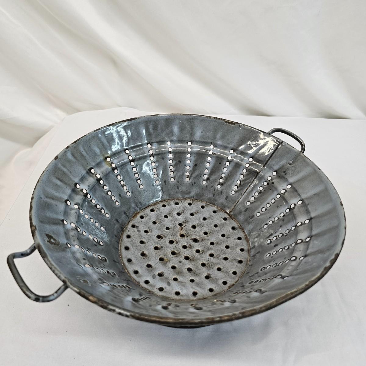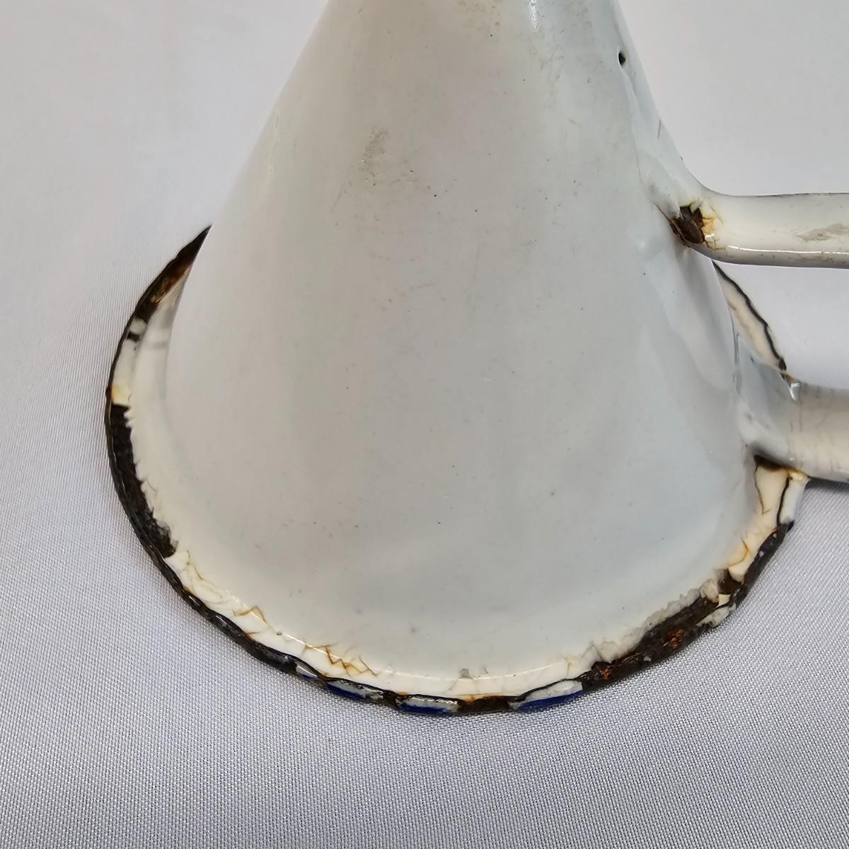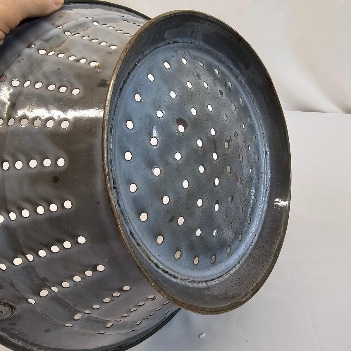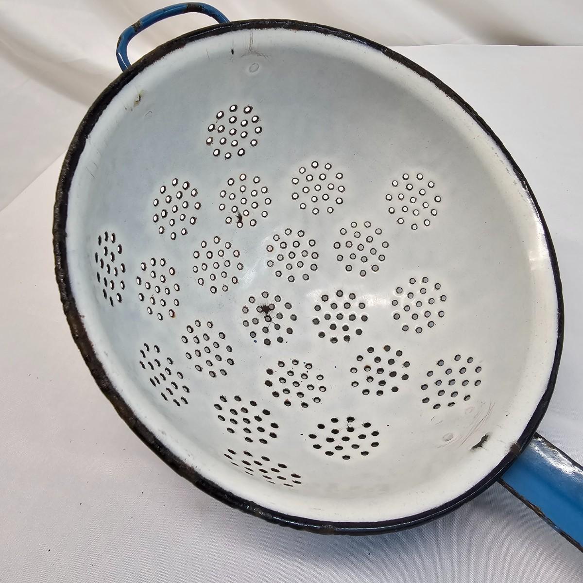 Several pieces of older enameled metal kitchen items. A colander, a pie plate, funnel, handled strainer, a lidded milk jug and an oblong pot with lid. The round colander is 11" x 13" x 4.5"H, the jug is 5.5"D x 9"H and the pie plate is 10"D. Some wear, loss of enamel in spots and some rust on edges. See photos for details. Shipping available.