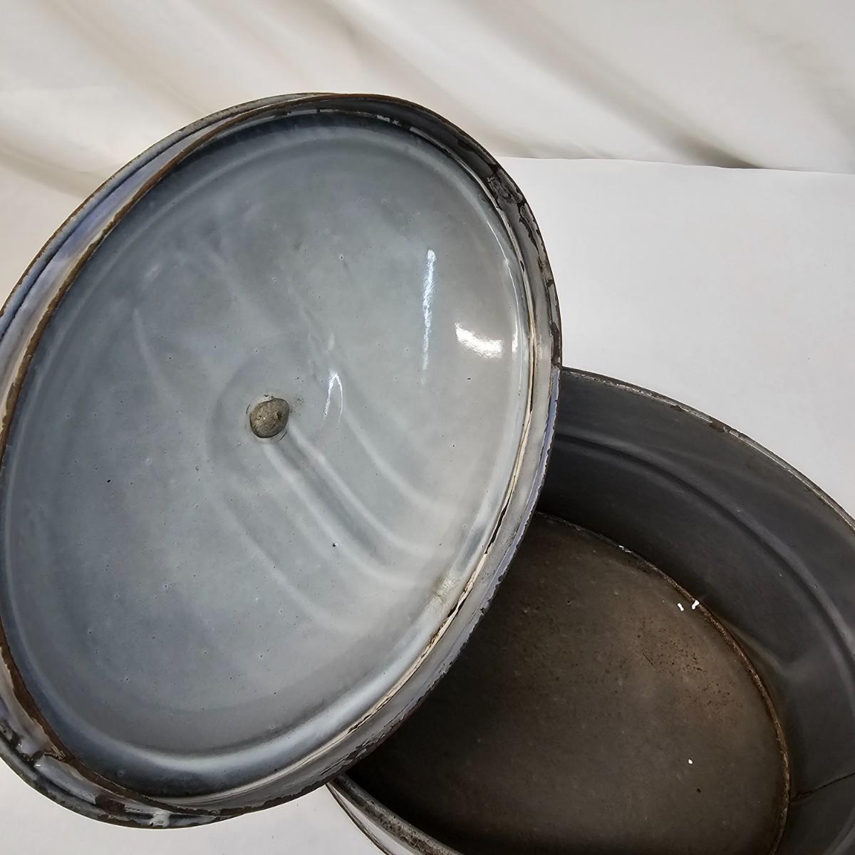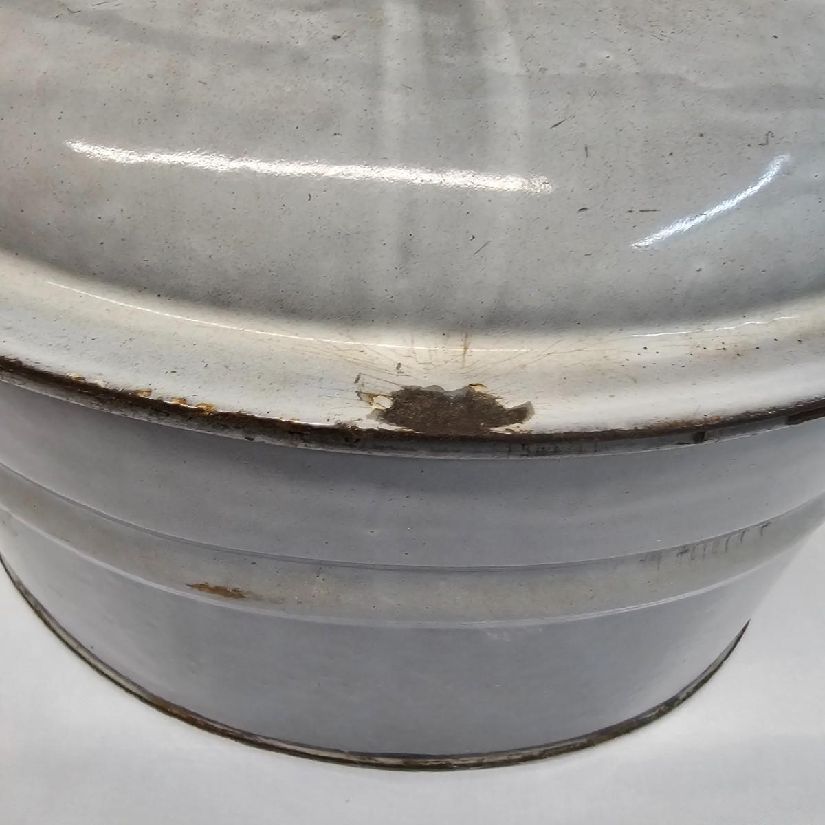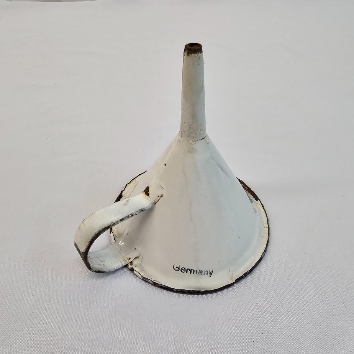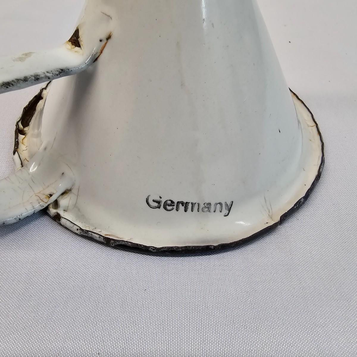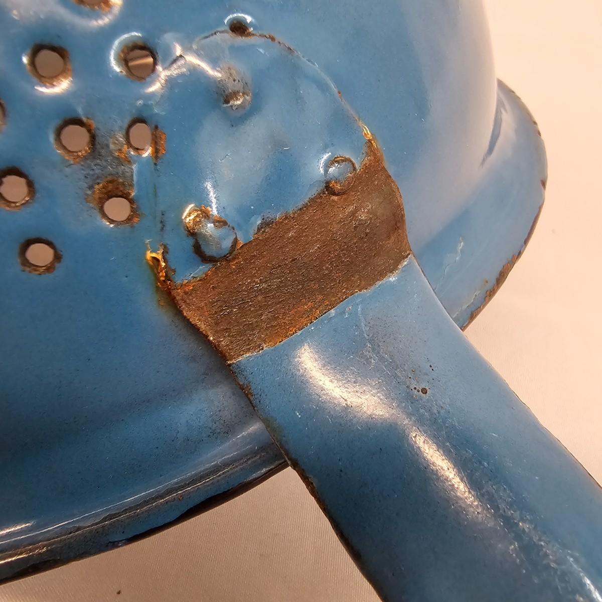 Several pieces of older enameled metal kitchen items. A colander, a pie plate, funnel, handled strainer, a lidded milk jug and an oblong pot with lid. The round colander is 11" x 13" x 4.5"H, the jug is 5.5"D x 9"H and the pie plate is 10"D. Some wear, loss of enamel in spots and some rust on edges. See photos for details. Shipping available.