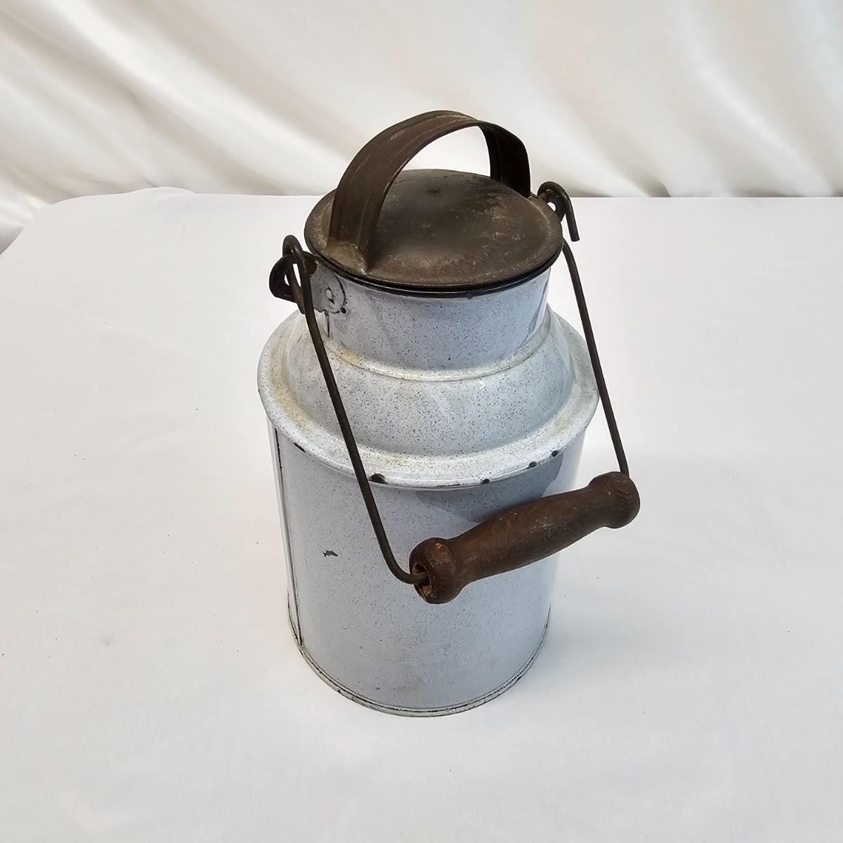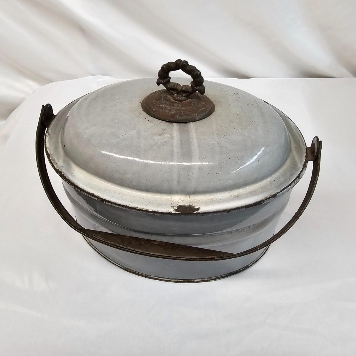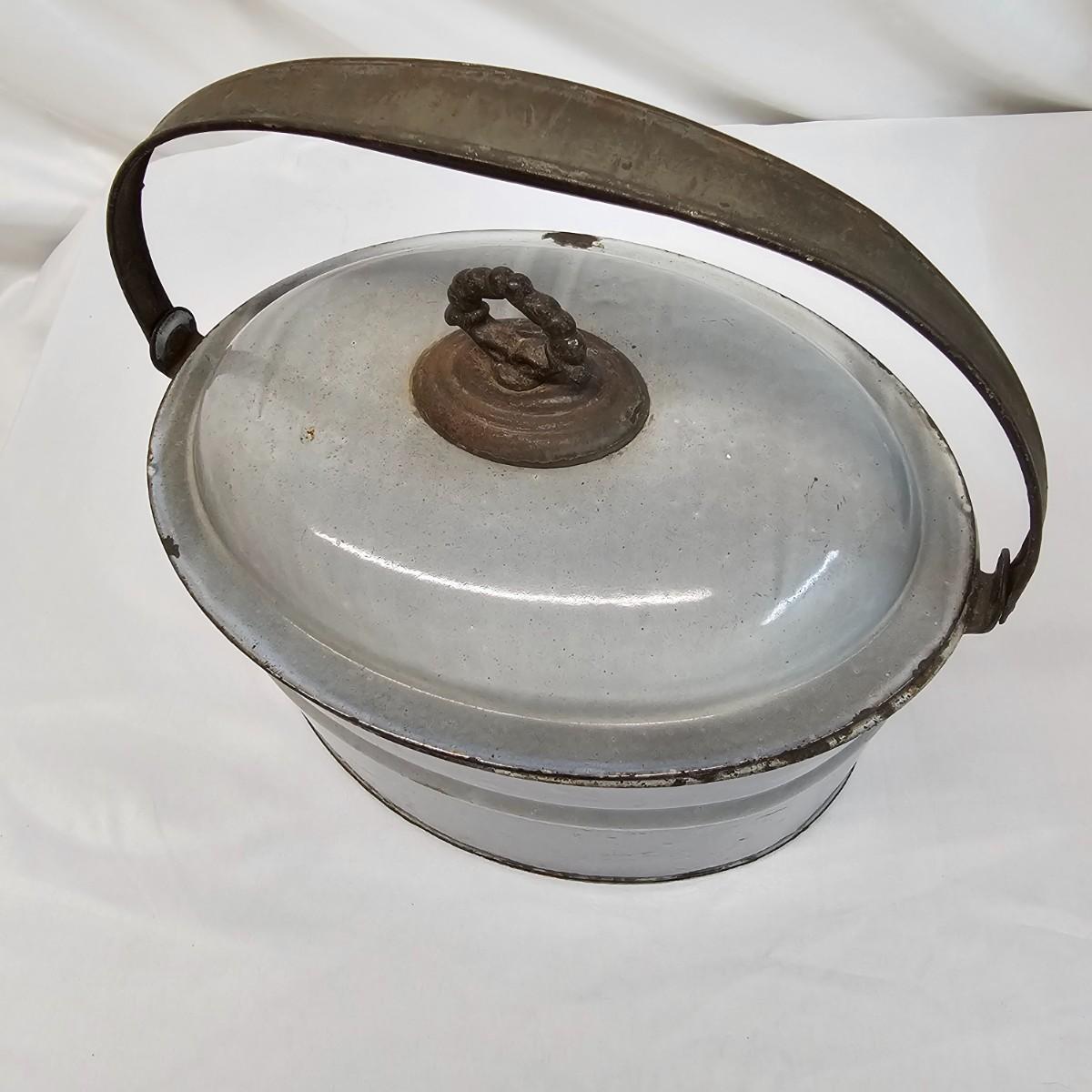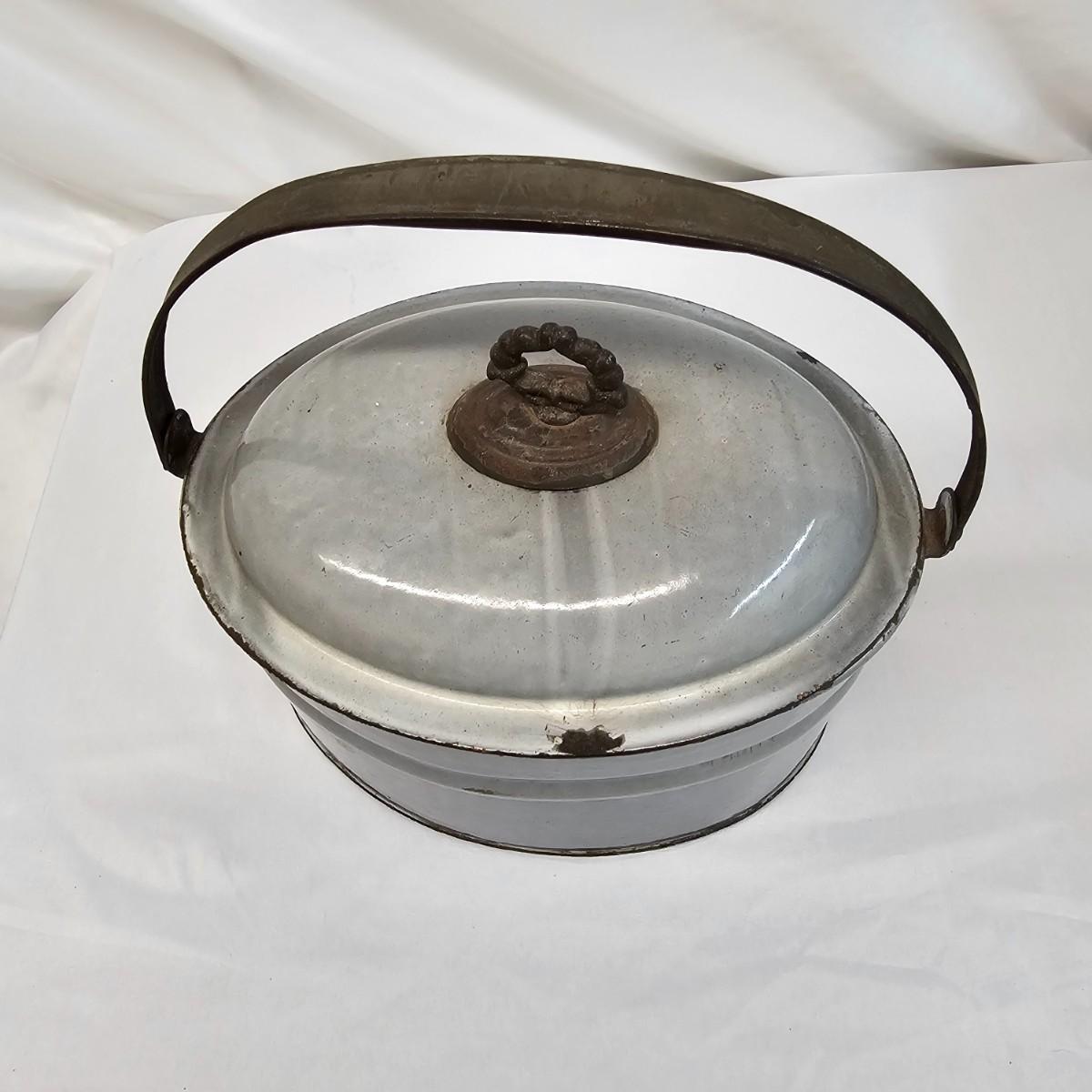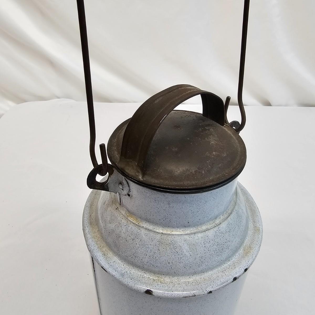 Several pieces of older enameled metal kitchen items. A colander, a pie plate, funnel, handled strainer, a lidded milk jug and an oblong pot with lid. The round colander is 11" x 13" x 4.5"H, the jug is 5.5"D x 9"H and the pie plate is 10"D. Some wear, loss of enamel in spots and some rust on edges. See photos for details. Shipping available.