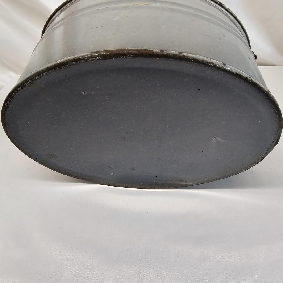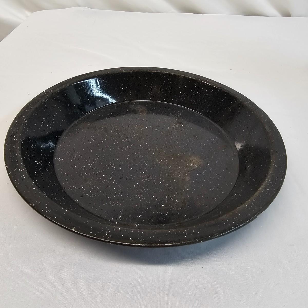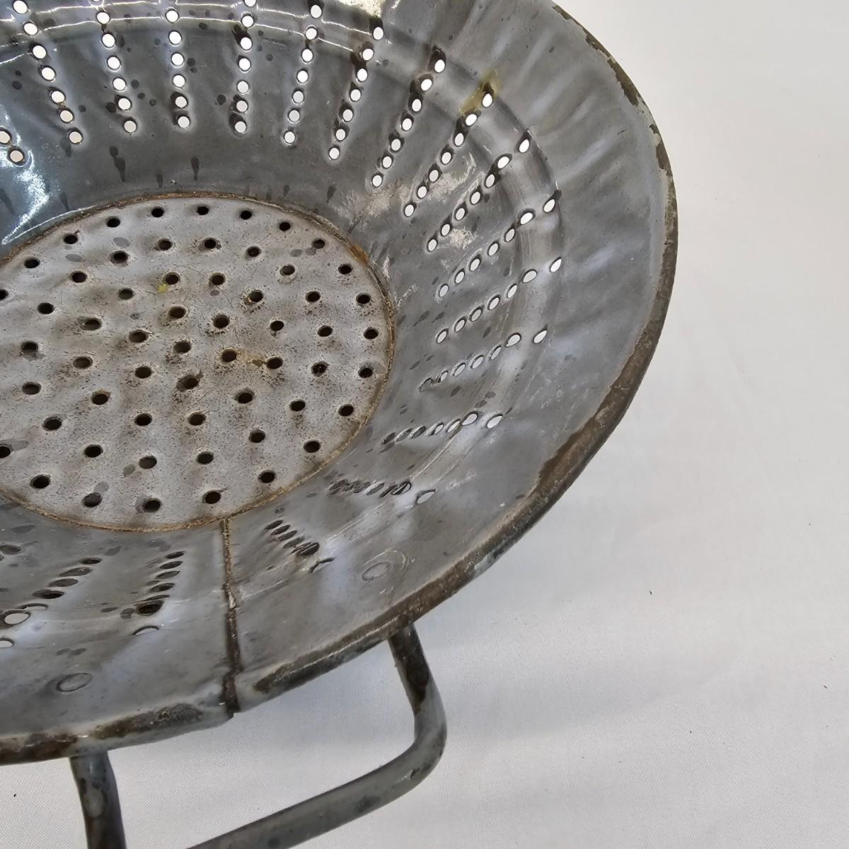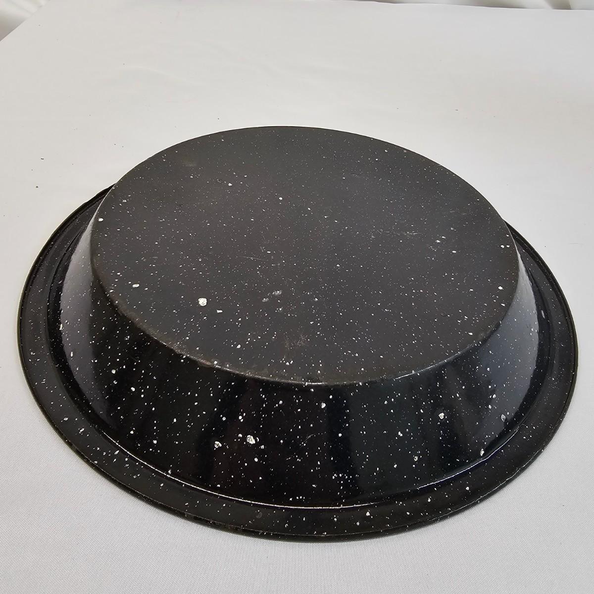 Several pieces of older enameled metal kitchen items. A colander, a pie plate, funnel, handled strainer, a lidded milk jug and an oblong pot with lid. The round colander is 11" x 13" x 4.5"H, the jug is 5.5"D x 9"H and the pie plate is 10"D. Some wear, loss of enamel in spots and some rust on edges. See photos for details. Shipping available.