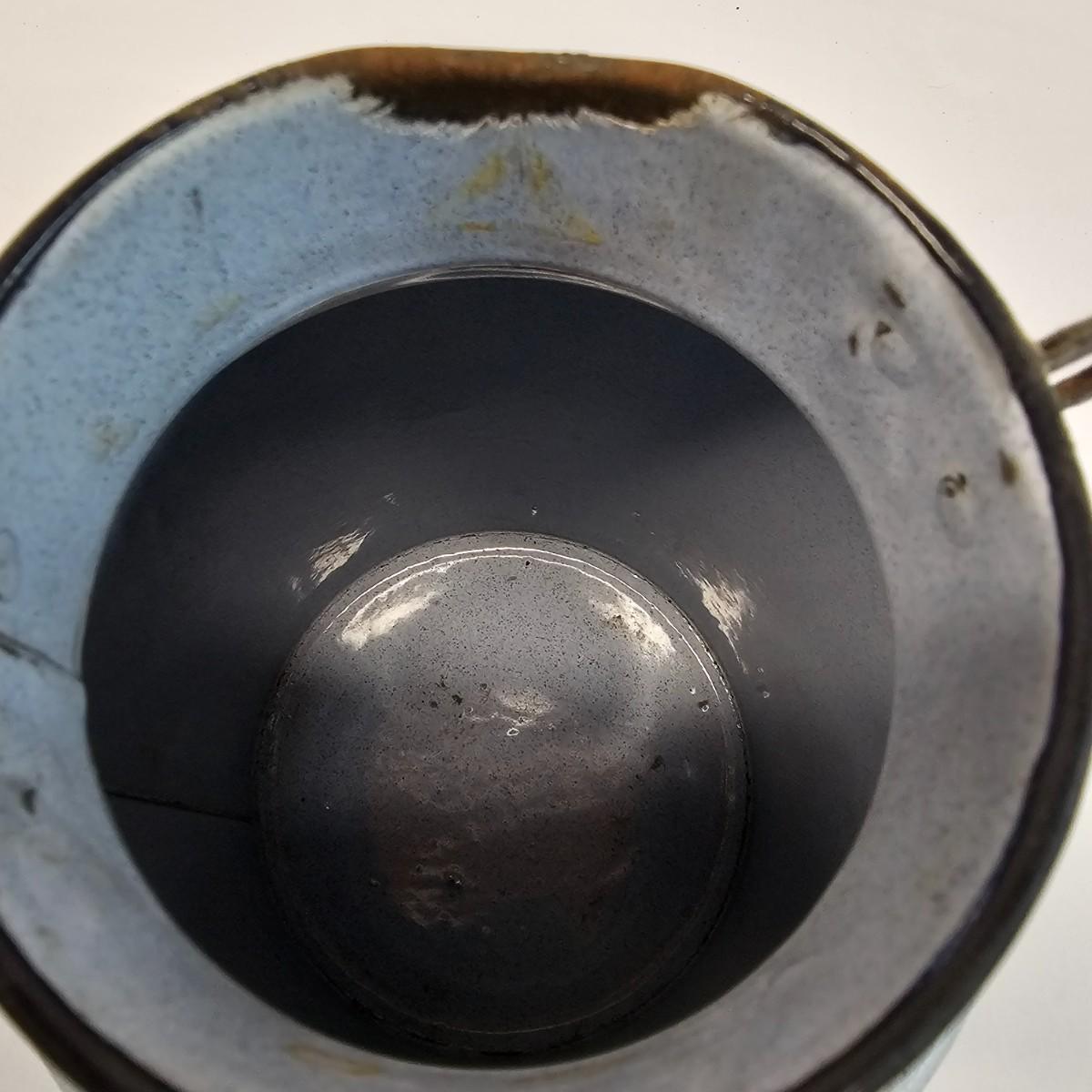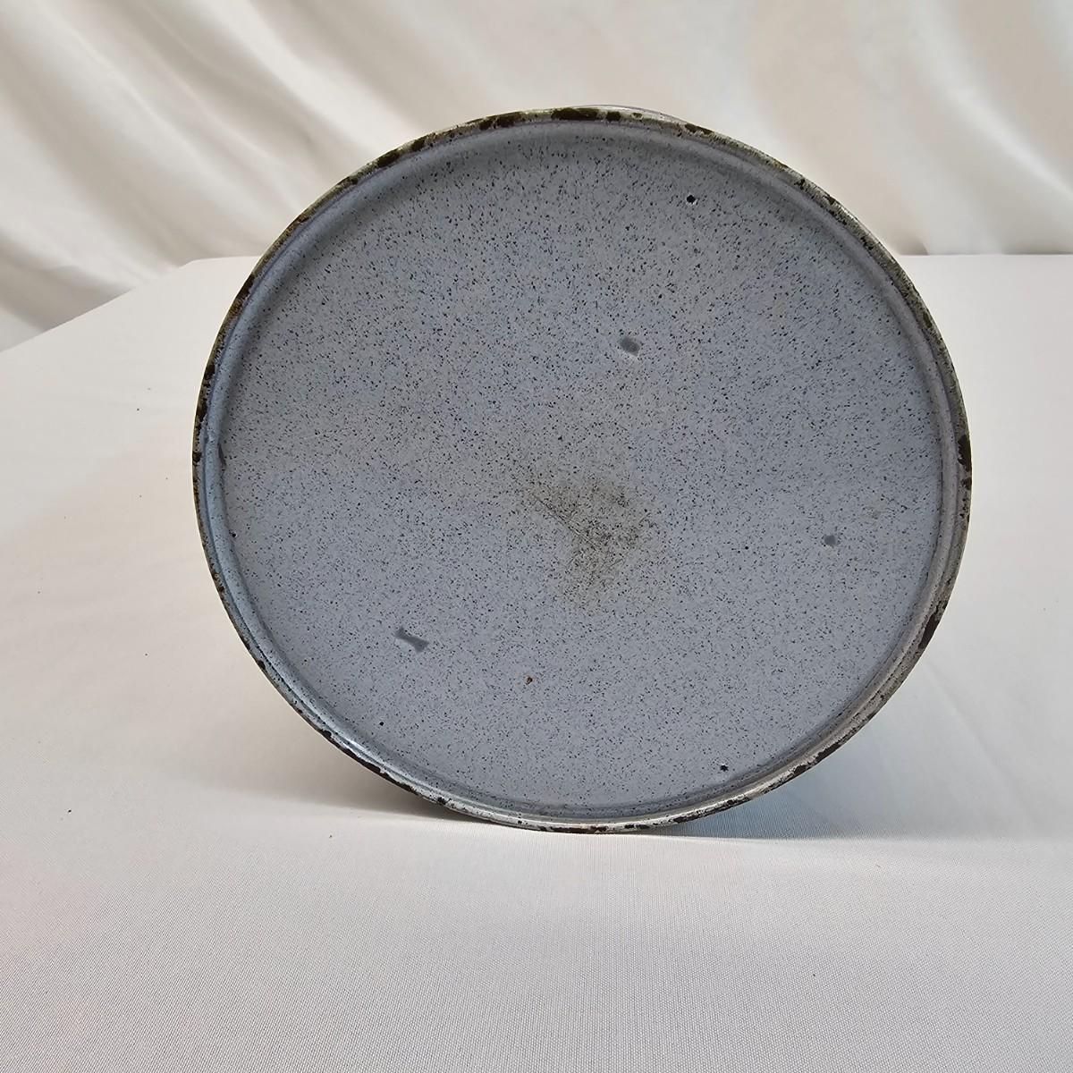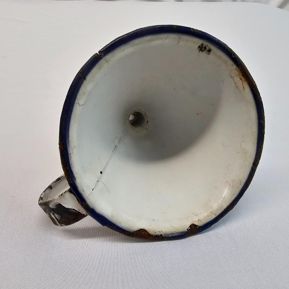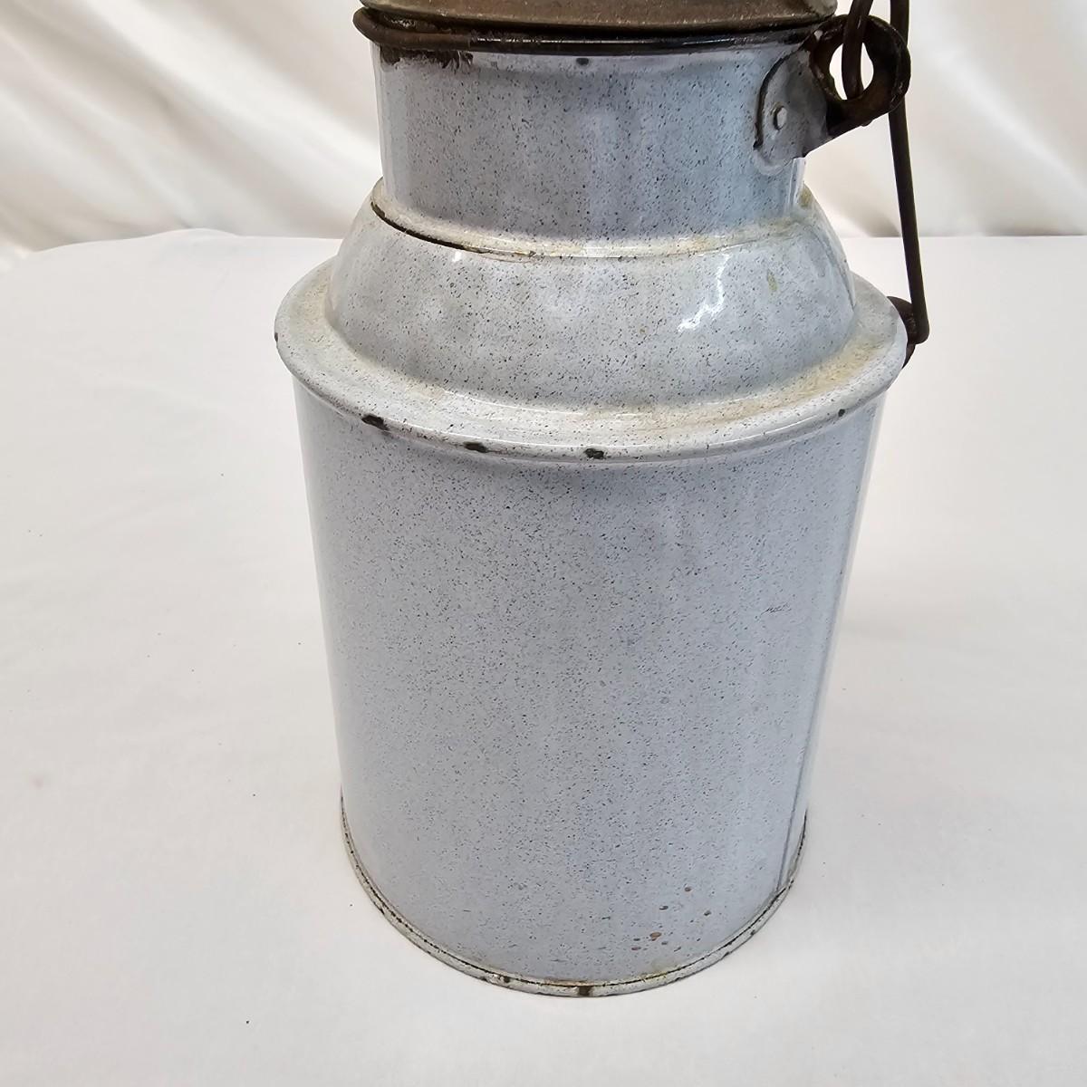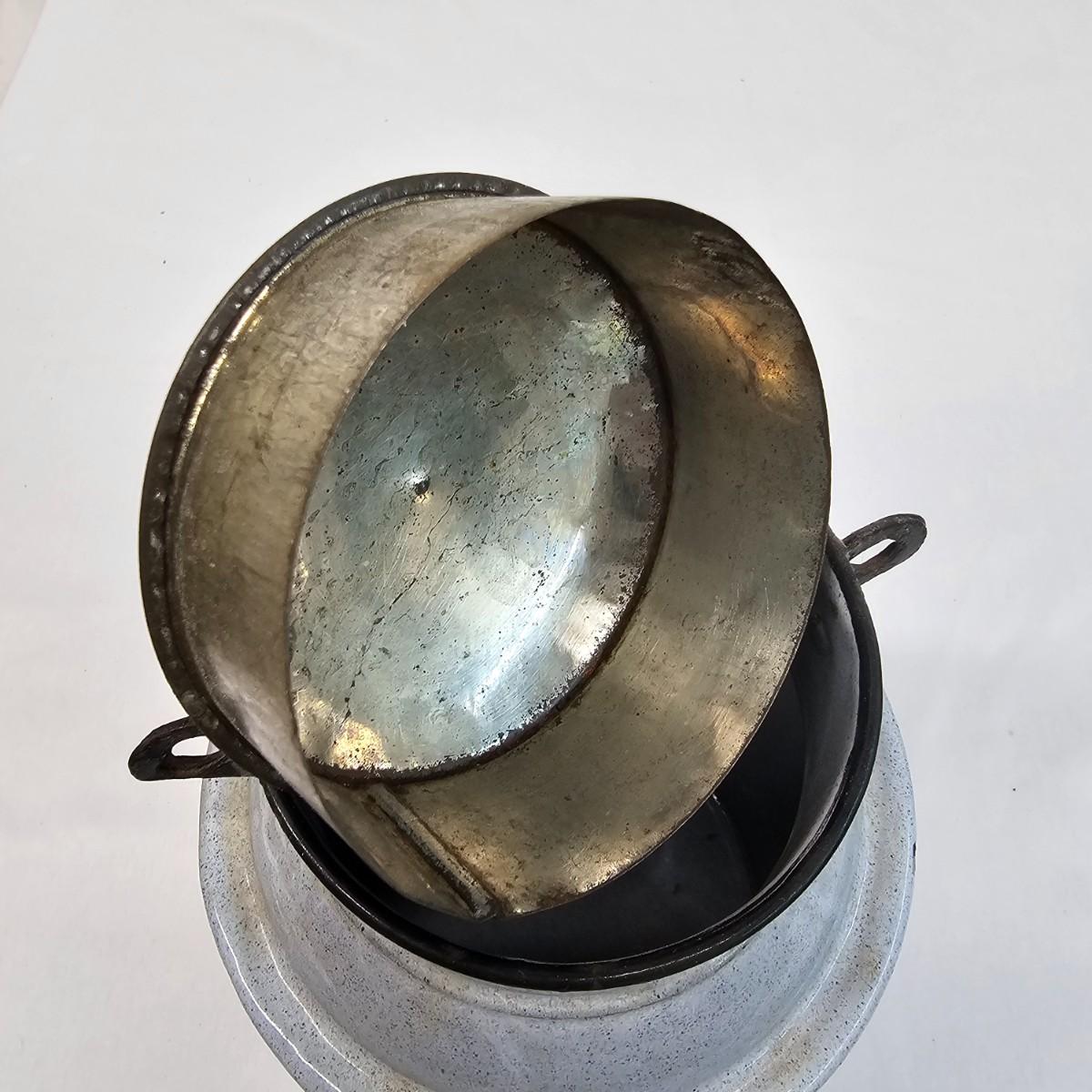 Several pieces of older enameled metal kitchen items. A colander, a pie plate, funnel, handled strainer, a lidded milk jug and an oblong pot with lid. The round colander is 11" x 13" x 4.5"H, the jug is 5.5"D x 9"H and the pie plate is 10"D. Some wear, loss of enamel in spots and some rust on edges. See photos for details. Shipping available.