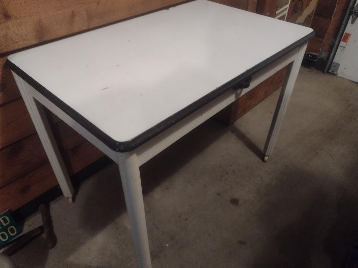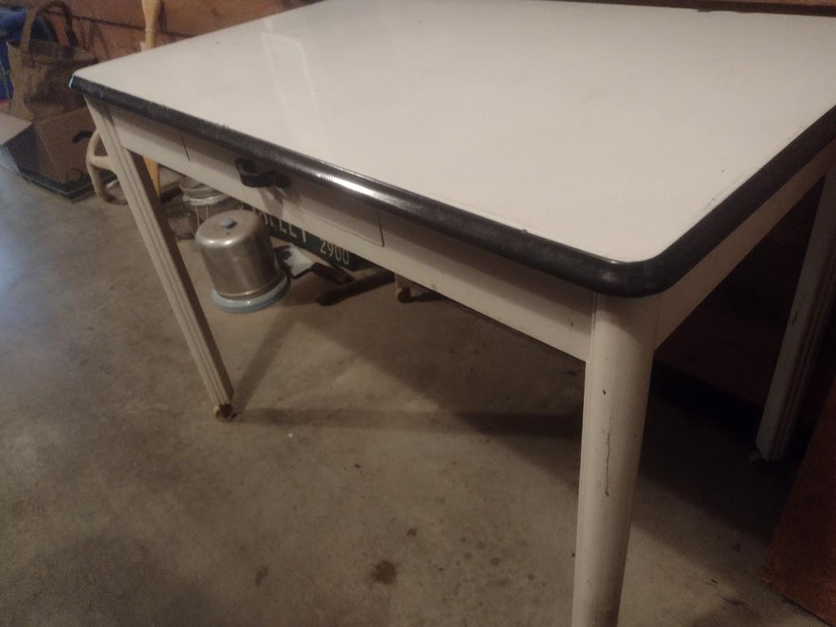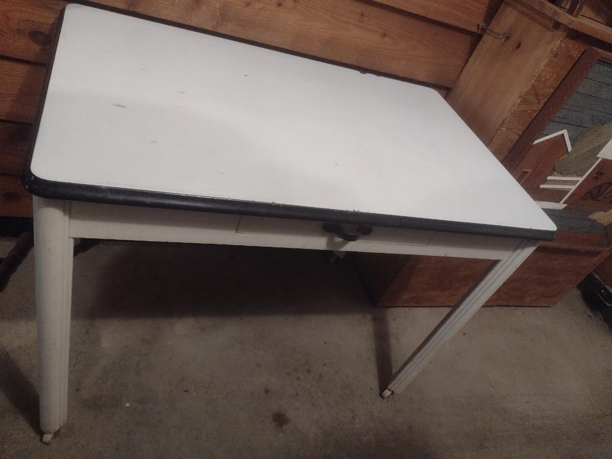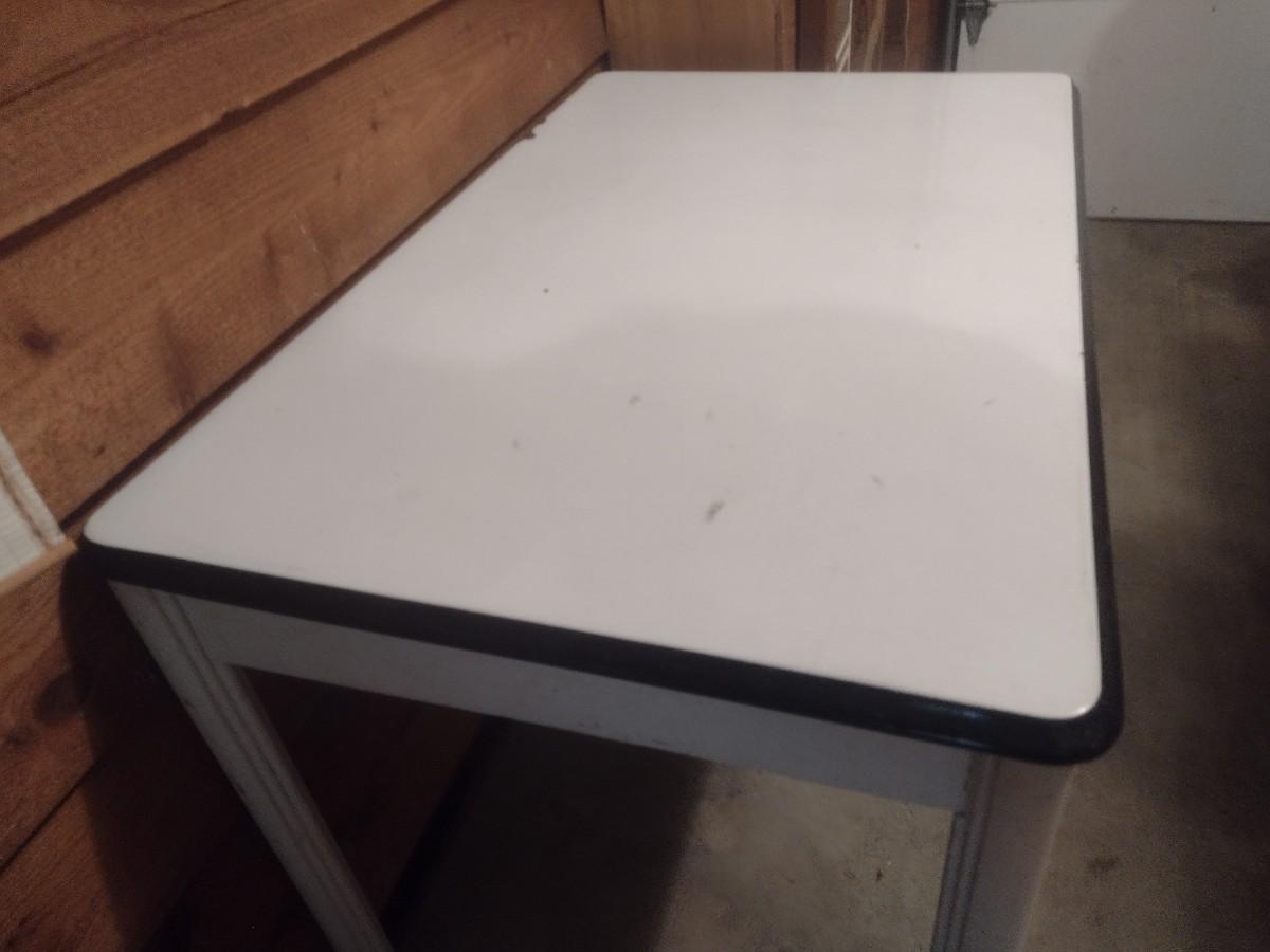 Vintage Enamel Metal Tabletop with Wood Frame Base