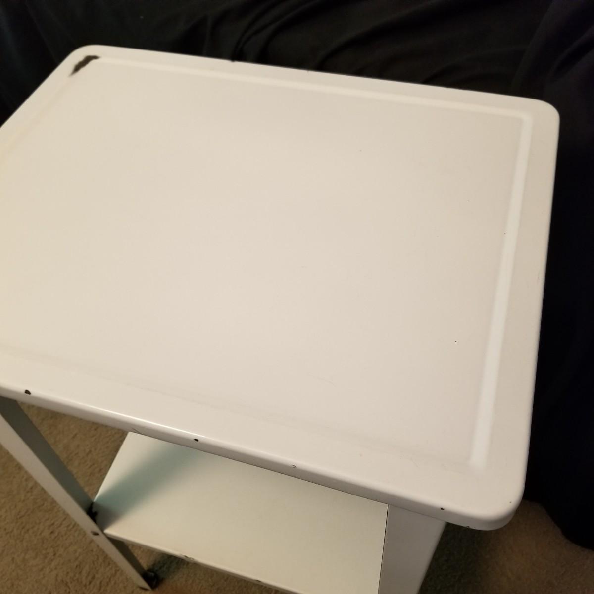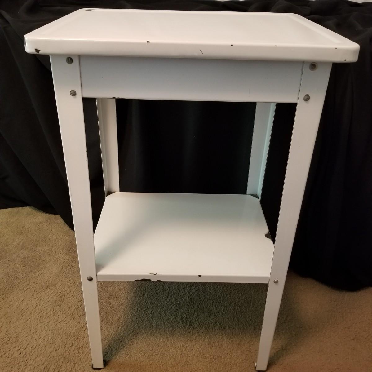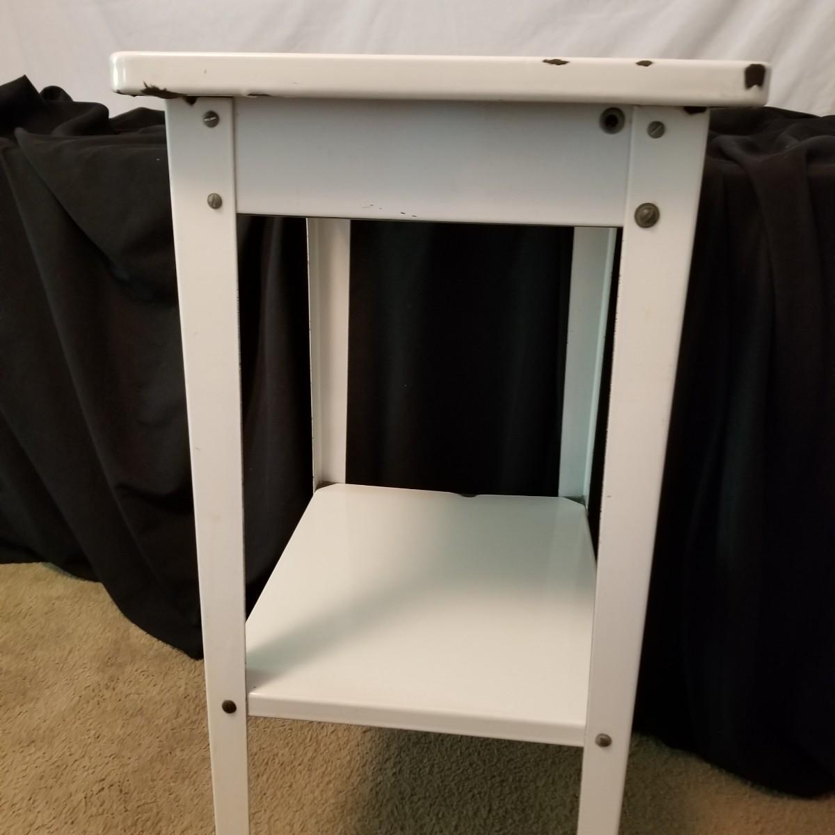 A white metal enamel table with lower shelf. Table measures 20"x26"x31", lower shelf is 12" off ground. Some small imperfections in enamel surface, see photos for details. Local pickup only.