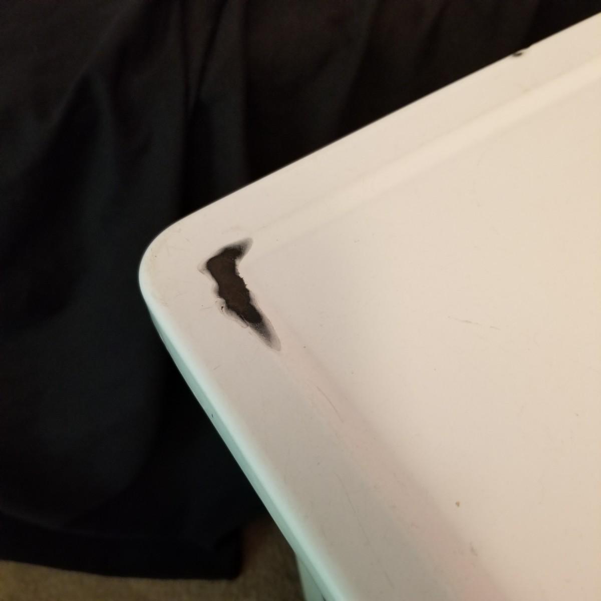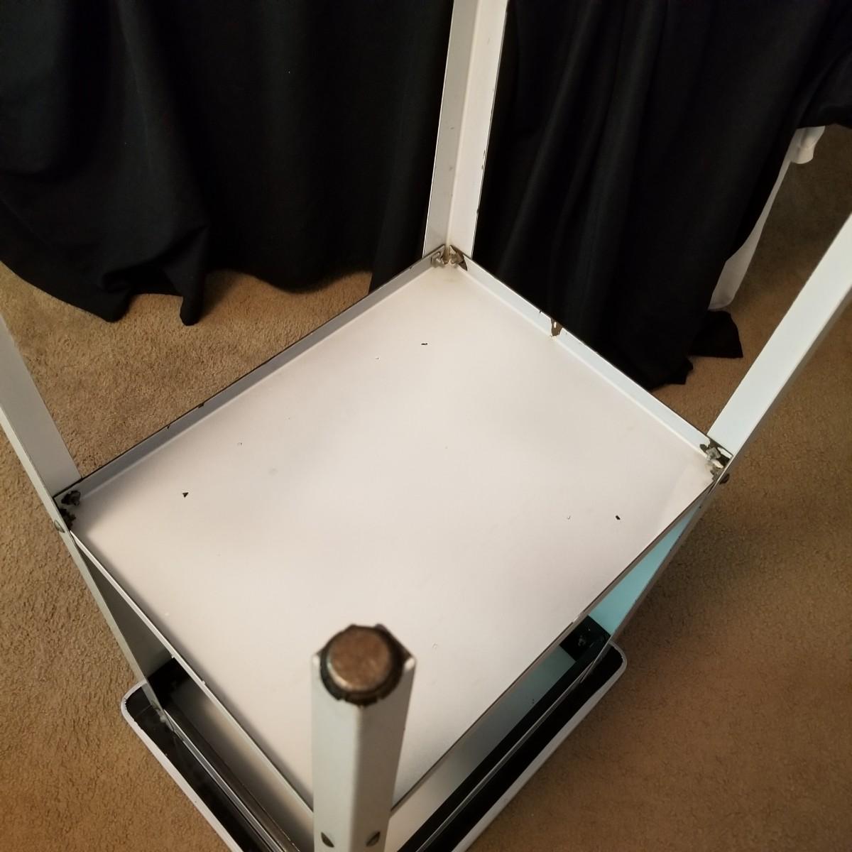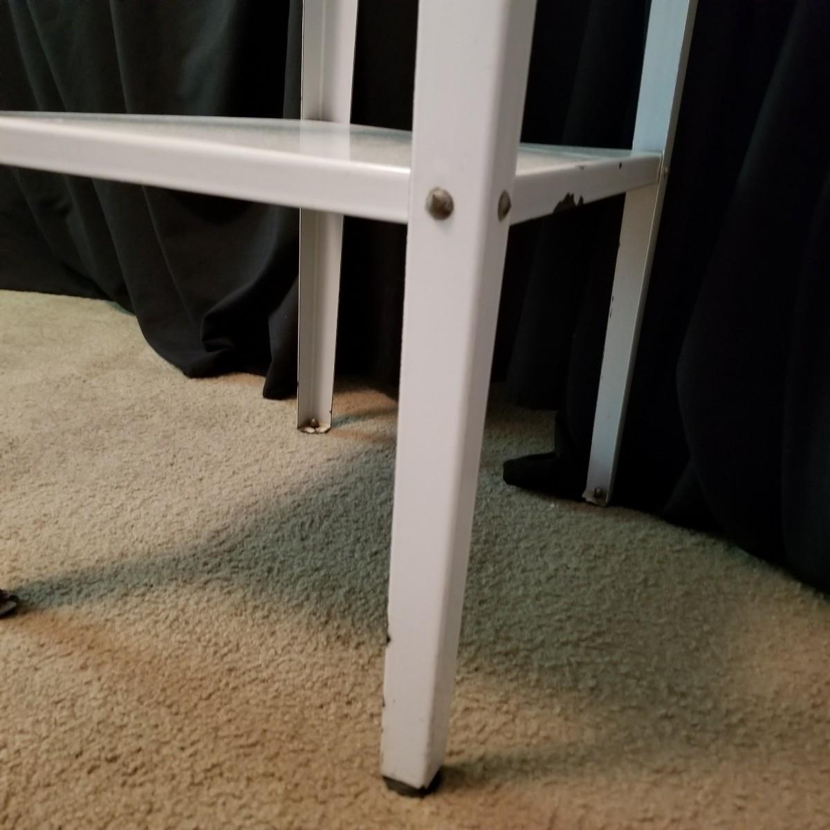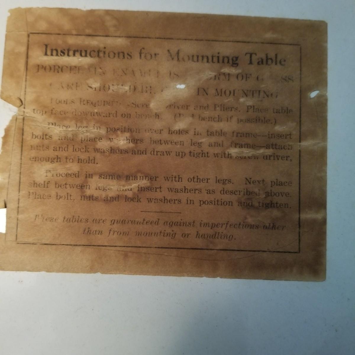 A white metal enamel table with lower shelf. Table measures 20"x26"x31", lower shelf is 12" off ground. Some small imperfections in enamel surface, see photos for details. Local pickup only.