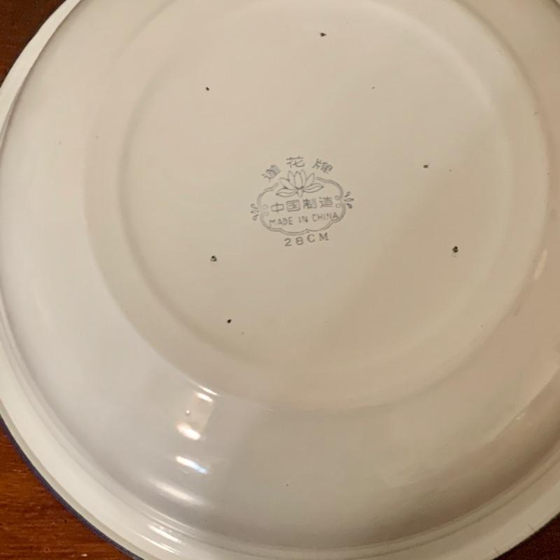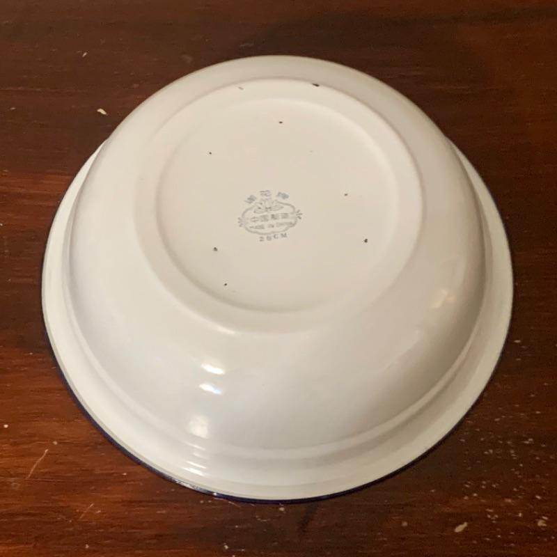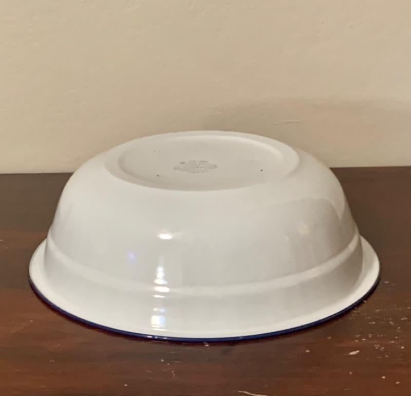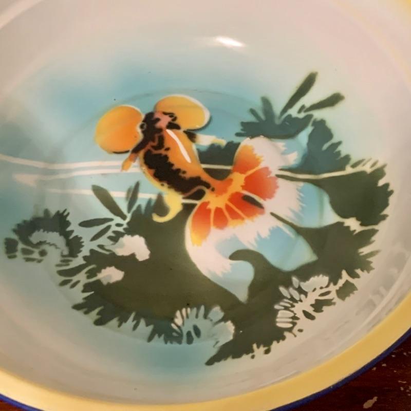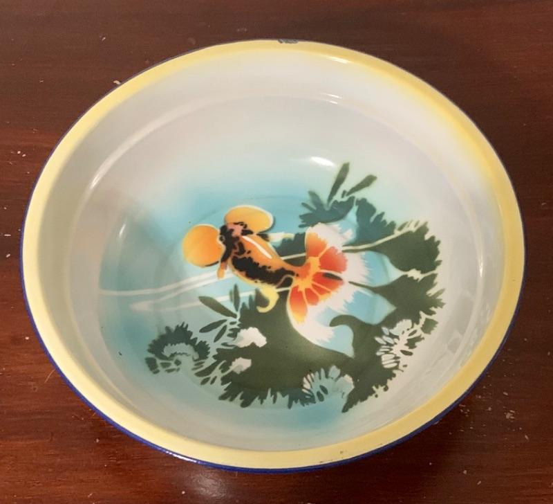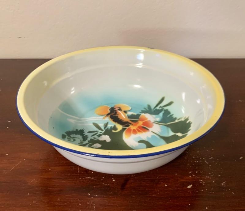 Vintage enameled bowl with colorful jumping fish. Small chip on rim and a few tiny fleck chips. Measures 11” in diameter.
