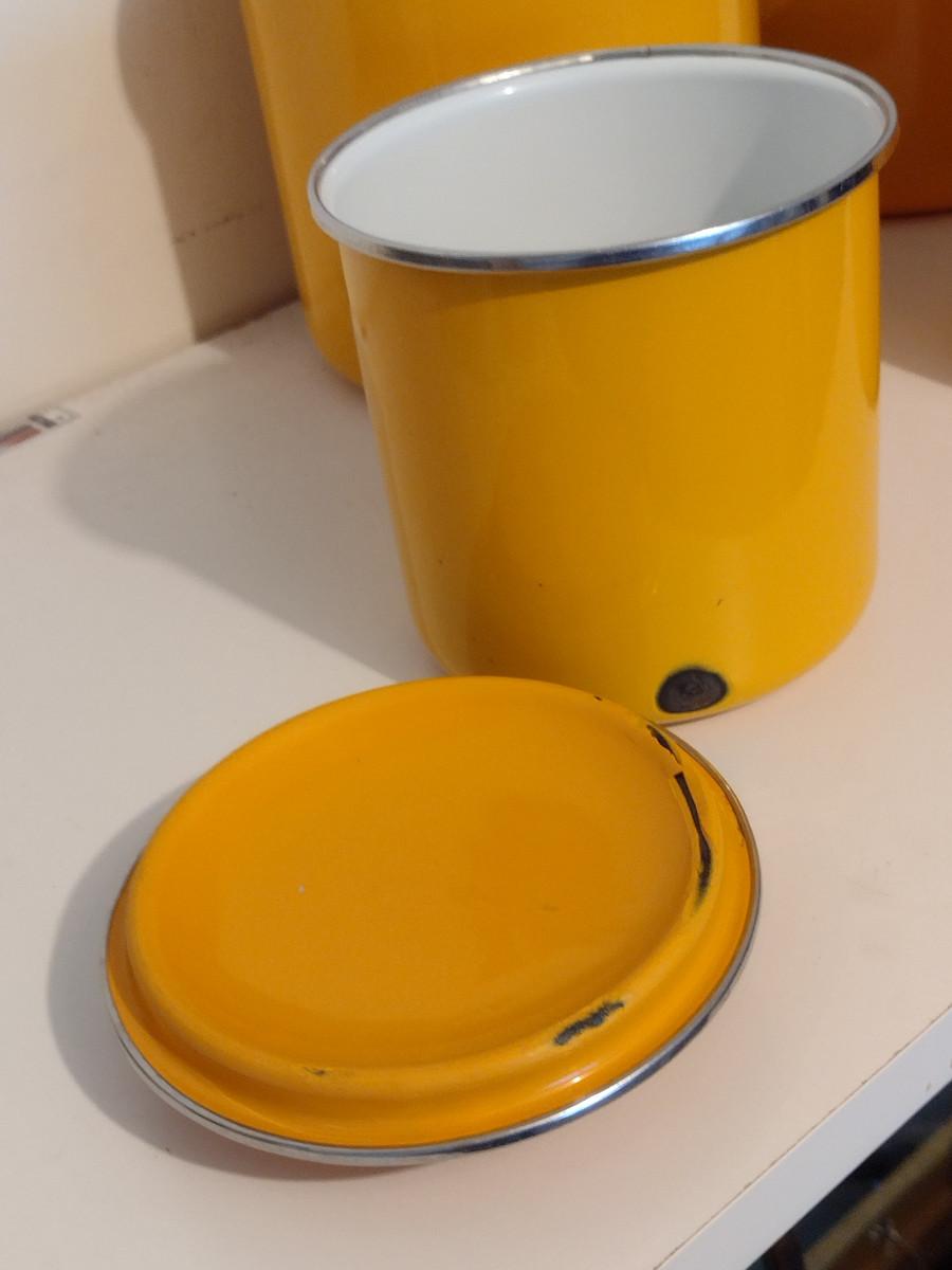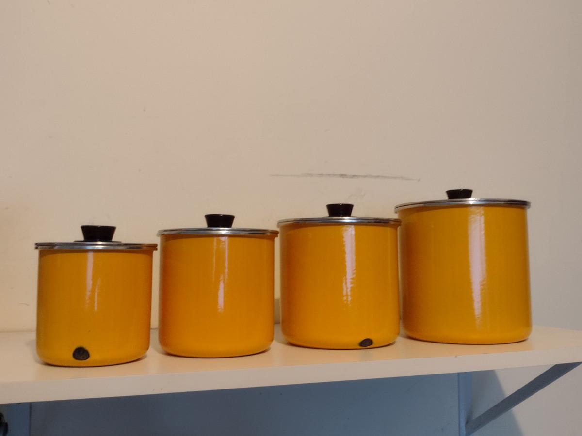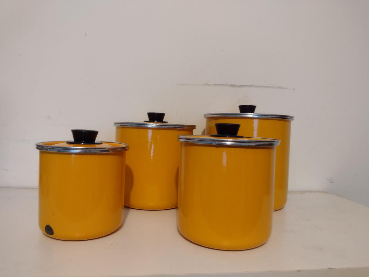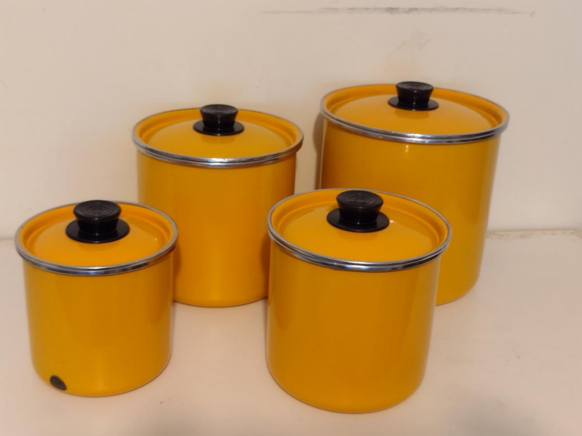 Vintage Enameled Metal Canister Set- Four Pieces. Items have some chipping- see all pictures for condition.
