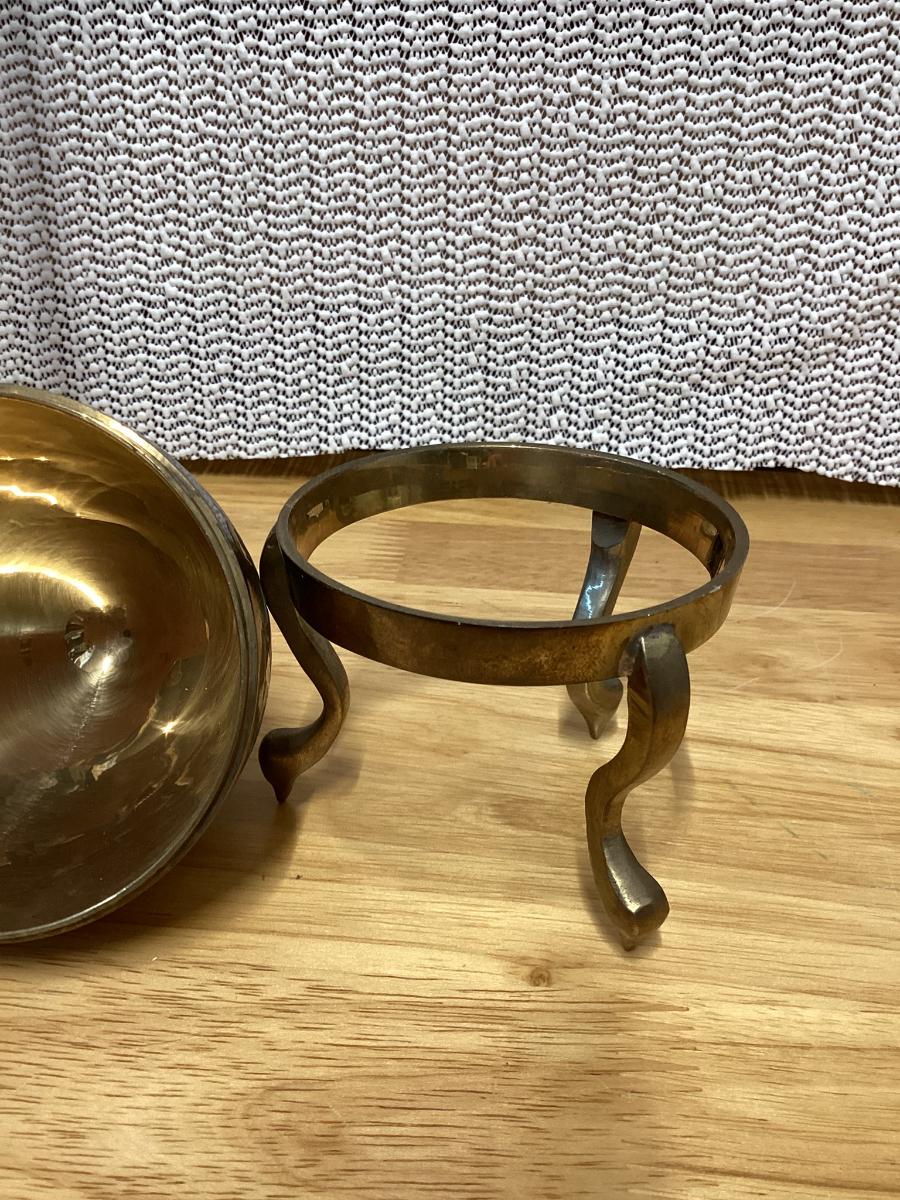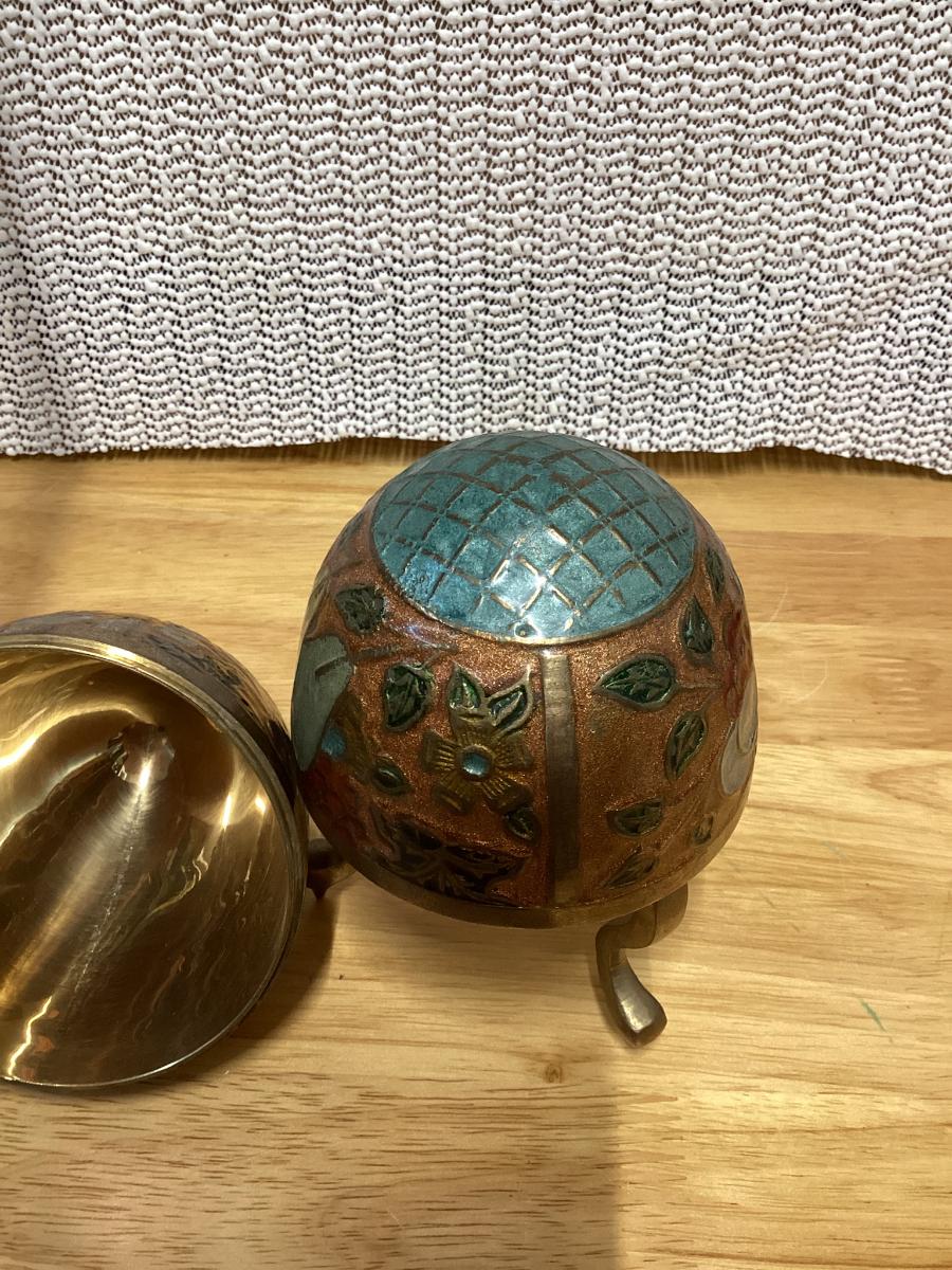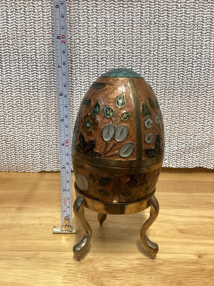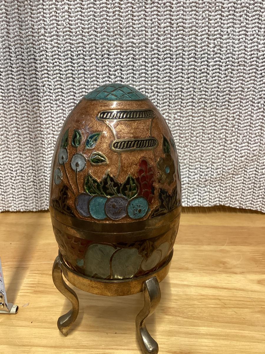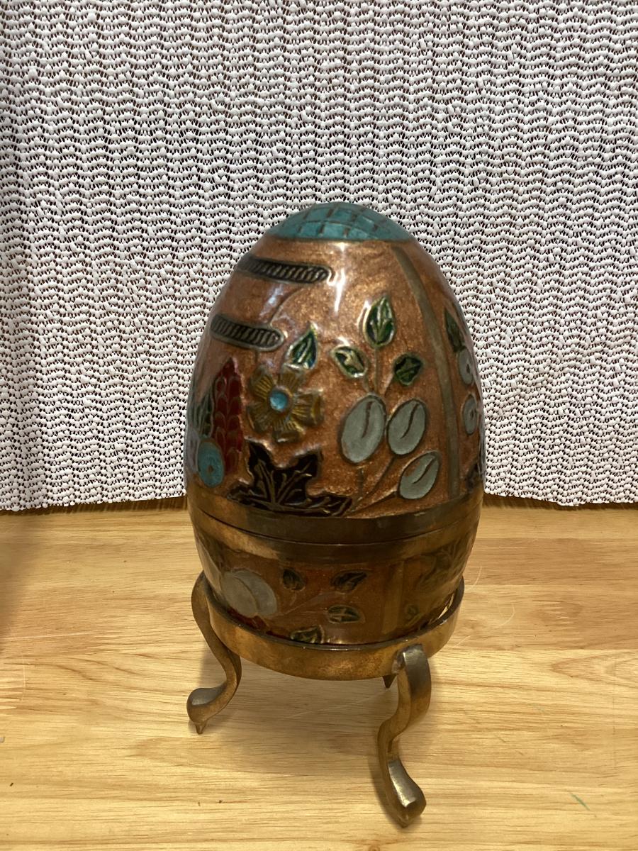vintage enameled solid brass cloisonné egg trinket box with a stand.