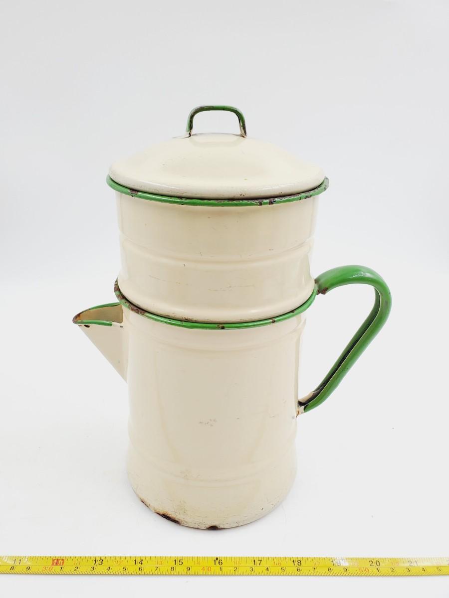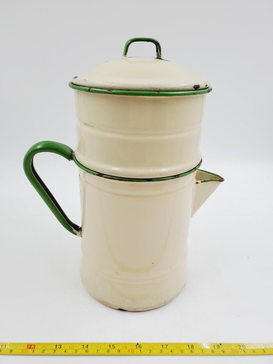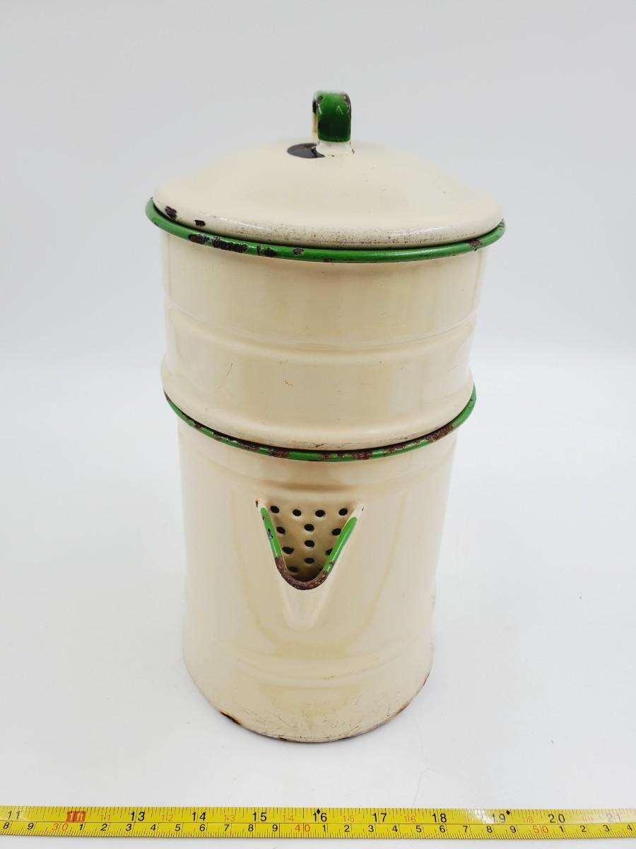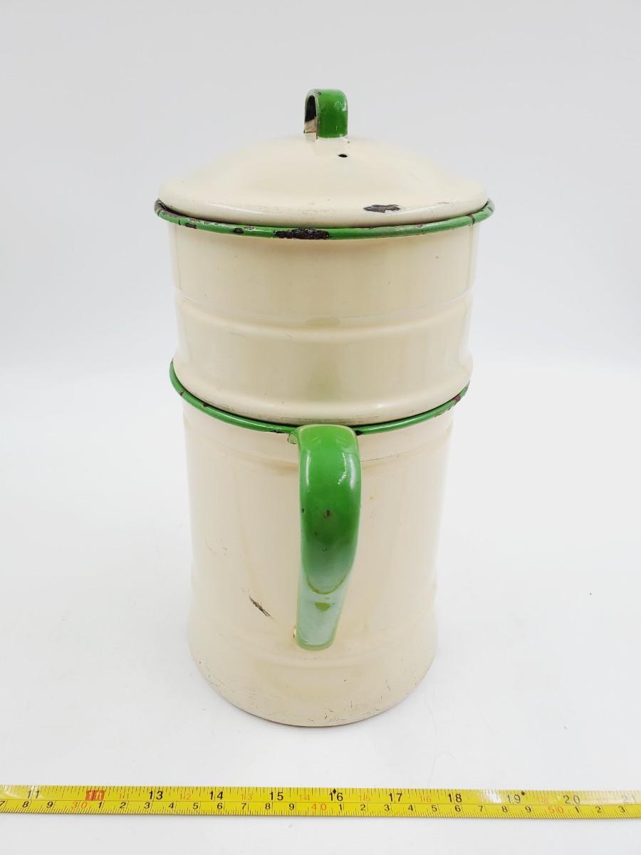 Pale yellow with green trim, may be missing one piece to the inside. Has been used and shows signs of such, some chipping to the enamel, see photos. Still a very cool vintage piece of enamelware! Approximately 11in tall