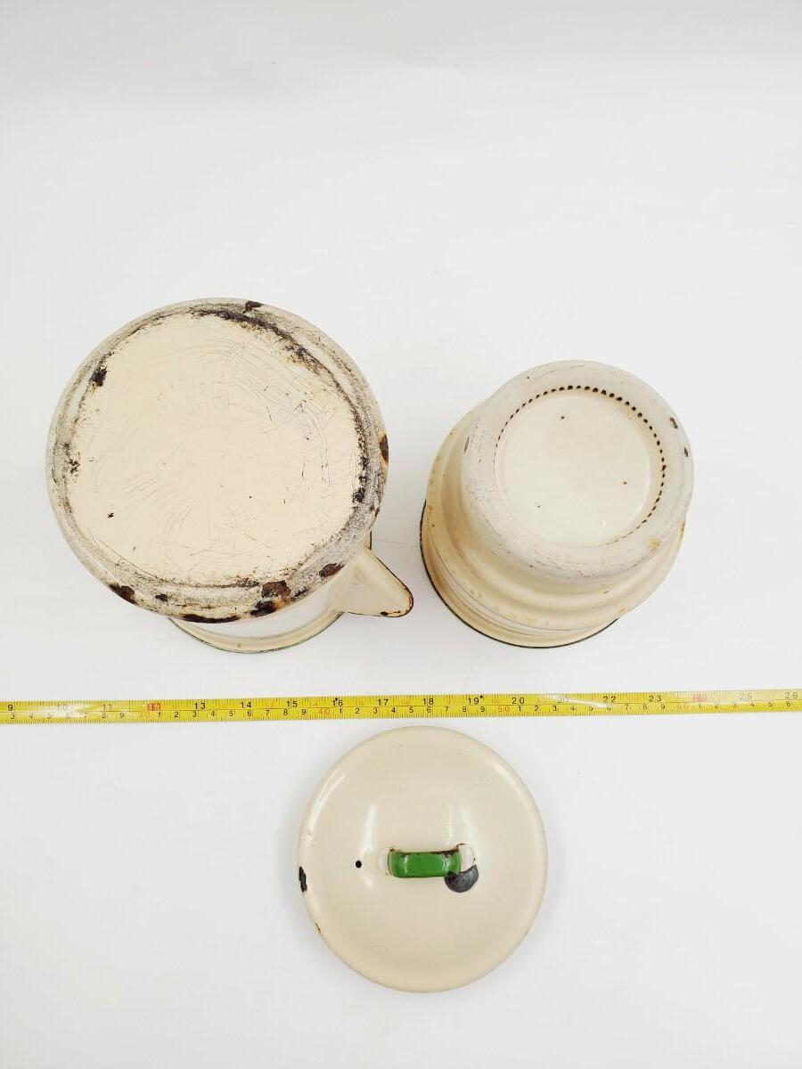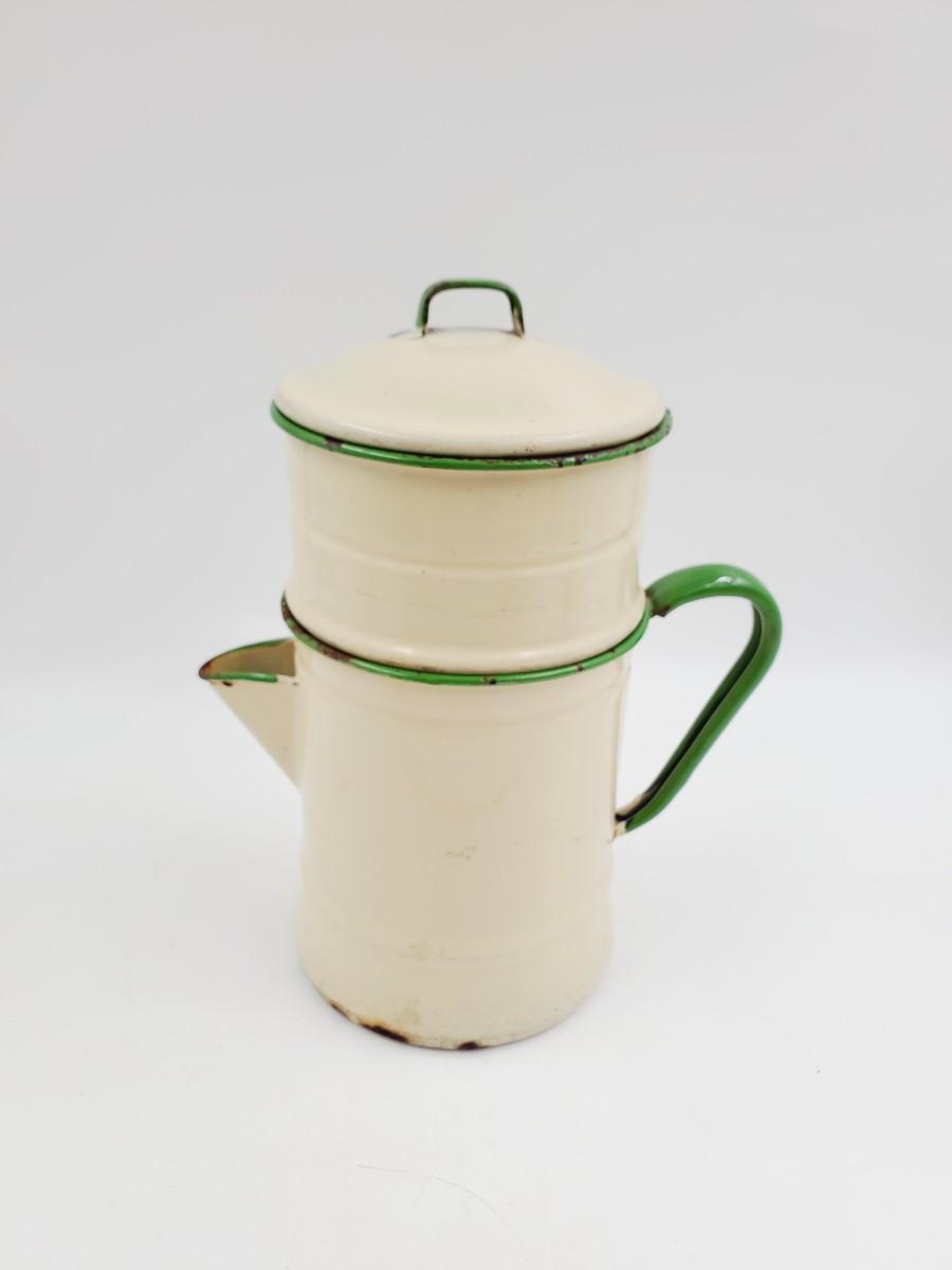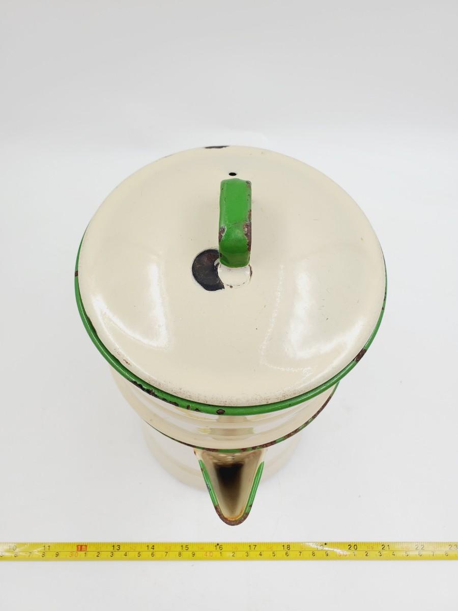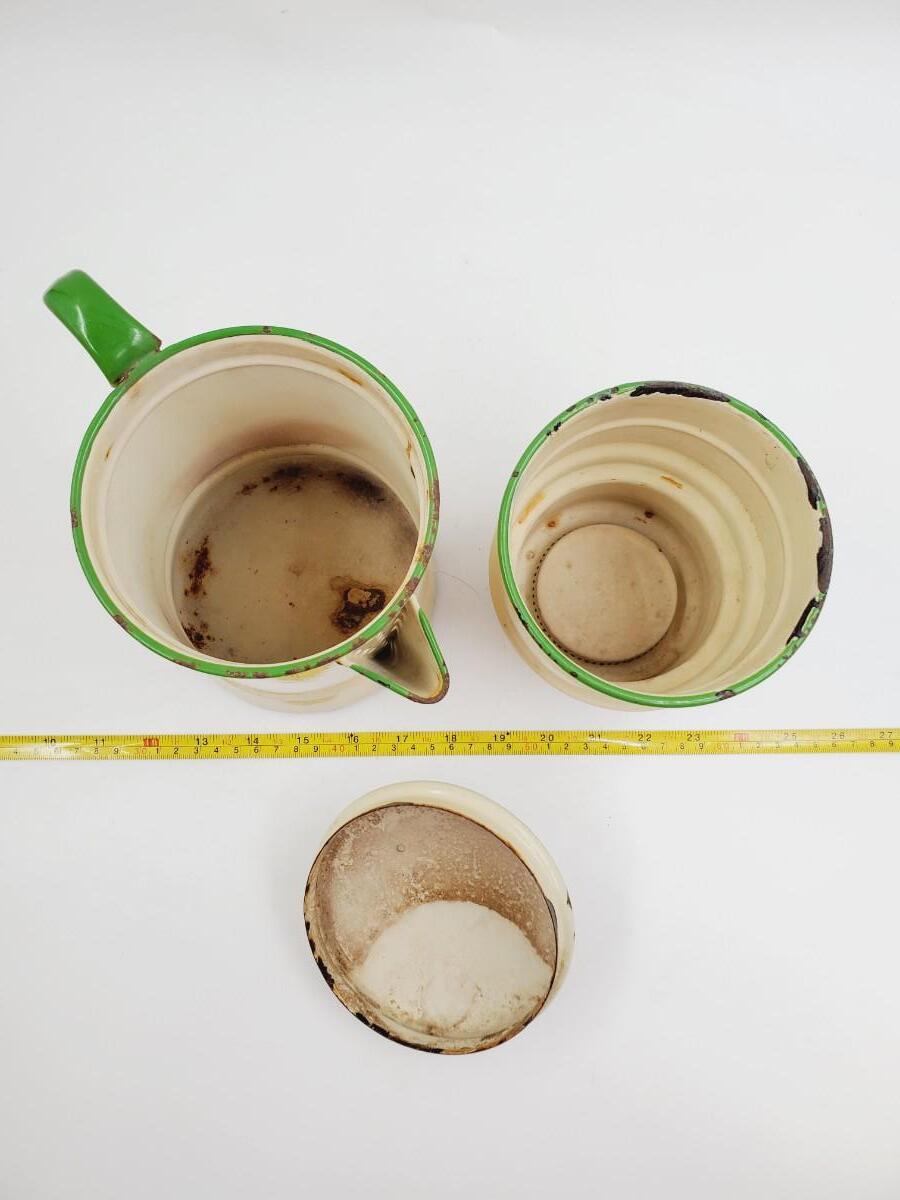 Pale yellow with green trim, may be missing one piece to the inside. Has been used and shows signs of such, some chipping to the enamel, see photos. Still a very cool vintage piece of enamelware! Approximately 11in tall